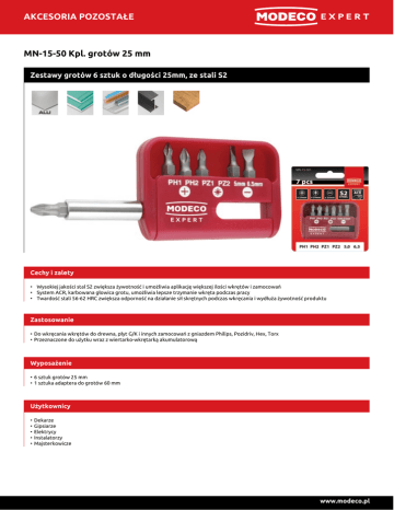 AKCESORIA POZOSTAŁE MN-15-50 Kpl. grotów 25 mm Zestawy grotów 6 sztuk o długości 25mm, ze stali S2 Cechy i zalety • Wysokiej jakości stal S2 zwiększa żywotność i umożliwia aplikację większej ilości wkrętów i zamocowań • System ACR, karbowana głowica grotu, umożliwia lepsze trzymanie wkręta podczas pracy • Twardość stali 56-62 HRC zwiększa odporność na działanie sił skrętnych podczas wkręcania i wydłuża żywotność produktu Zastosowanie • Do wkręcania wkrętów do drewna, płyt G/K i innych zamocowań z gniazdem Philips, Pozidriv, Hex, Torx • Przeznaczone do użytku wraz z wiertarko-wkrętarką akumulatorową Wyposażenie • 6 sztuk grotów 25 mm • 1 sztuka adaptera do grotów 60 mm Użytkownicy • Dekarze • Gipsiarze • Elektrycy • Instalatorzy • Majsterkowicze www.modeco.pl AKCESORIA POZOSTAŁE Produkty powiązane • MN-91-014 Wiertarko -wkrętarka 14,4 V • MN-91-015 Wiertarko -wkrętarkia 18 V • MN-91-021 Wiertarko-wkrętarka 14,4 V • MN-91-022 Wiertarko-wkrętarka 18 V Dane techniczne Części Opakowanie jed nostkowe Opakowanie zbiorcze Waga opakowa nia jednostkowe go Waga opakowa nia zbiorczego [części] [szt] [szt] [kg] [kg] MN-15-501 7 12 120 0.96 9.6 5906757271708 MN-15-502 7 12 120 0.96 9.6 5906757271715 Indeks EAN Ostrzeżenia • Zawsze używaj ochrony oczu (okulary, gogle lub przyłbice ochronne) • Zawsze używaj ochrony rąk (rękawice) www.modeco.pl