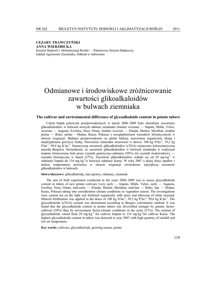 NR 262 BIULETYN INSTYTUTU HODOWLI I AKLIMATYZACJI ROŚLIN 2011 CEZARY TRAWCZYŃSKI ANNA WIERZBICKA Instytut Hodowli i Aklimatyzacji Roślin — Państwowy Instytut Badawczy Zakład Agronomii Ziemniaka, Oddział w Jadwisinie Odmianowe i środowiskowe zróżnicowanie zawartości glikoalkaloidów w bulwach ziemniaka The cultivar and environmental difference of glycoalkaloids content in potato tubers Celem badań polowych przeprowadzonych w latach 2006–2009 było określenie zawartości glikoalkaloidów w bulwach nowych odmian ziemniaka (bardzo wczesne — Impala, Miłek, Velox, wczesne — Augusta, Ewelina, Nora, Oman, średnio wczesne — Elanda, Marlen, Meridian, średnio późna — Roko, późne – Medea, Kuras, Pokusa) z uwzględnieniem warunków klimatycznych w okresie wegetacji. Badania przeprowadzono na glebie lekkiej, nawożonej organicznie słomą i międzyplonem gorczycy białej. Nawożenie mineralne stosowano w dawce: 100 kg N·ha-1, 39,2 kg P·ha-1, 99,6 kg K·ha-1. Sumaryczną zawartość glikoalkaloidów (cTGA) oznaczono kolorymetryczną metodą Bergersa. Stwierdzono, że zawartość glikoalkaloidów w bulwach ziemniaka w większym stopniu różnicowana była przez czynnik genetyczny-odmiany (50%) niż czynnik środowiskowy — warunki klimatyczne w latach (27%). Zawartość glikoalkaloidów wahała się od 29 mg·kg-1 w odmianie Impala do 134 mg·kg-1w bulwach odmiany Kuras. W roku 2007 o dużej ilości opadów i niskiej temperaturze powietrza w okresie wegetacji stwierdzono największą zawartość glikoalkaloidów w bulwach. Słowa kluczowe: glikoalkaloidy, lata uprawy, odmiany, ziemniak The aim of field experiment conducted in the years 2006–2009 was to assess glycoalkaloids content in tubers of new potato cultivars (very early — Impala, Miłek, Velox, early — Augusta, Ewelina, Nora, Oman, mid-early — Elanda, Marlen, Meridian, mid-late — Roko, late — Medea, Kuras, Pokusa) taking into consideration climate conditions in vegetation season. The investigations were carried out on the light soil fertilized organically with straw and aftercrop of white mustard. Mineral fertilization was applied in the doses of 100 kg N·ha-1; 39,2 kg P·ha-1; 99,6 kg K·ha-1. The glycoalkaloids (cTGA) content was determined according to Bergers colorimetric method. It was found that the glycoalkaloids content in potato tubers was diversified stronger by genetic factorcultivars (50%) than by environment factor-climate conditions in the years (27%). The content of glycoalkaloids varied from 29 mg·kg-1 for cultivar Impala to 134 mg·kg-1for cultivar Kuras. The highest glycoalkaloids content in tubers was detected in year 2007 with high quantity of rainfall and low air temperature. Key words: cultivars, glycoalkaloids, growing season, potato 119 Cezary Trawczyński ... WSTĘP Jednym z głównych składników mających wpływ na wartość żywieniową bulw ziemniaka są glikoalkaloidy (cTGA; content of total glycoalkaloids), głównie solanina i czakonina (Bushway, 1983). Glikoalkaloidy są substancjami naturalnie występującymi w całej rodzinie Solanaceae i stanowią jeden z elementów wieloskładnikowego mechanizmu odpornościowego roślin ziemniaka. W liściach, łodygach, kwiatach i kiełkach zawartość tego związku jest kilkakrotnie większa niż w bulwach (Gregory, 1984). Wysoka kumulacja tego związku w bulwach ziemniaka obniża ich wartość pokarmową, stąd glikoalkaloidy określane są jako substancje antyżywieniowe i mogą działać niekorzystnie na zdrowie ludzkie (Friedman, Dao, 1992; Friedman, Mc Donald, 1997). Dopuszczalna zawartość glikoalkaloidów niezależnie od odmiany wynosi do 200 mg.kg-1 w świeżej masie, chociaż zawartość TGA powyżej 100 mg.kg-1 w świeżej masie bulw może już pogarszać smak bulw (Mazurczyk, Lis 2000). Spożycie ziemniaków z nadmierną zawartością tych związków powoduje uszkodzenia przewodu pokarmowego i układu nerwowego (Percival i in., 1996). Symptomami zatruć są: podrażnienie gardła i błon śluzowych, bóle brzucha, nudności, wymioty, biegunka. Ze względu na toksyczność glikoalkaloidów, zalecane jest więc dokładne analizowanie zawartości tych związków w bulwach ziemniaka, co dotyczyć powinno wszystkich nowych odmian, wpisanych przez COBORU do Krajowego Rejestru Odmian. Na podstawie wieloletnich badań 1988–2005, obejmujących szerokie spektrum genotypów (145) wykazano, że wahania w zawartości glikoalkaloidów stanowiły od 3 do 350 mg·kg-1św. masy bulw (Wroniak, Mazurczyk, 2006). Między innymi w okresie wegetacji roślin bulwy narażone są na oddziaływanie czynników pogody, które w określonych przypadkach mogą stanowić czynnik stresu, a reakcją rośliny jest wzrost zawartość glikoalkaloidów (Sinden i in., 1984; Mazurczyk, 1988; Griffiths i in., 1994; Frydecka-Mazurczyk, Zgórska, 1995; Papathanasiou i in., 1998; Nitihamyong i in., 1999; Lachman i in., 2001). Stąd bardzo ważne jest, żeby wszystkie zarejestrowane odmiany charakteryzowały się genetycznie uwarunkowaną niską kumulacją tych związków w bulwach. Wtedy istnieje małe prawdopodobieństwo przekroczenia niebezpiecznego poziomu TGA (powyżej 200 mg·kg-1 św. masy bulw). Mając na uwadze powyższe aspekty przeprowadzono badania, których celem było określenie zawartości glikoalkaloidów w bulwach nowych odmian ziemniaka należących do różnych grup wczesności zarejestrowanych w latach 2005–2008 z uwzględnieniem przebiegu warunków pogodowych w okresie ich wegetacji. MATERIAŁ I METODY W latach 2006–2009 w Zakładzie Agronomii Instytutu Hodowli i Aklimatyzacji Roślin — PIB, Oddział w Jadwisinie w ścisłych doświadczeniach polowych i laboratoryjnych określono zawartość glikoalkaloidów w bulwach czternastu nowych jadalnych i skrobiowych odmian ziemniaka należących do różnych grup wczesności (bardzo wczesne — Impala, Miłek, Velox, wczesne — Augusta, Ewelina, Nora, Oman, średnio wczesne — Elan