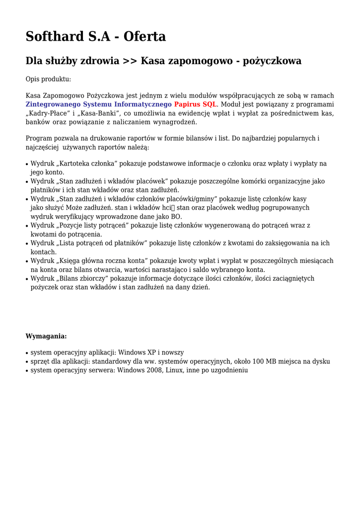 Softhard S.A - Oferta Dla służby zdrowia >> Kasa zapomogowo - pożyczkowa Opis produktu: Kasa Zapomogowo Pożyczkowa jest jednym z wielu modułów współpracujących ze sobą w ramach Zintegrowanego Systemu Informatycznego Papirus SQL. Moduł jest powiązany z programami „Kadry-Płace” i „Kasa-Banki”, co umożliwia na ewidencję wpłat i wypłat za pośrednictwem kas, banków oraz powiązanie z naliczaniem wynagrodzeń. Program pozwala na drukowanie raportów w formie bilansów i list. Do najbardziej popularnych i najczęściej używanych raportów należą: ● ● ● ● ● ● ● Wydruk „Kartoteka członka” pokazuje podstawowe informacje o członku oraz wpłaty i wypłaty na jego konto. Wydruk „Stan zadłużeń i wkładów placówek” pokazuje poszczególne komórki organizacyjne jako płatników i ich stan wkładów oraz stan zadłużeń. Wydruk „Stan zadłużeń i wkładów członków placówki/gminy” pokazuje listę członków kasy jako służyć Może zadłużeń. stan i wkładów hci stan oraz placówek według pogrupowanych wydruk weryfikujący wprowadzone dane jako BO. Wydruk „Pozycje listy potrąceń” pokazuje listę członków wygenerowaną do potrąceń wraz z kwotami do potrącenia. Wydruk „Lista potrąceń od płatników” pokazuje listę członków z kwotami do zaksięgowania na ich kontach. Wydruk „Księga główna roczna konta” pokazuje kwoty wpłat i wypłat w poszczególnych miesiącach na konta oraz bilans otwarcia, wartości narastająco i saldo wybranego konta. Wydruk „Bilans zbiorczy” pokazuje informacje dotyczące ilości członków, ilości zaciągniętych pożyczek oraz stan wkładów i stan zadłużeń na dany dzień. Wymagania: ● ● ● system operacyjny aplikacji: Windows XP i nowszy sprzęt dla aplikacji: standardowy dla ww. systemów operacyjnych, około 100 MB miejsca na dysku system operacyjny serwera: Windows 2008, Linux, inne po uzgodnieniu