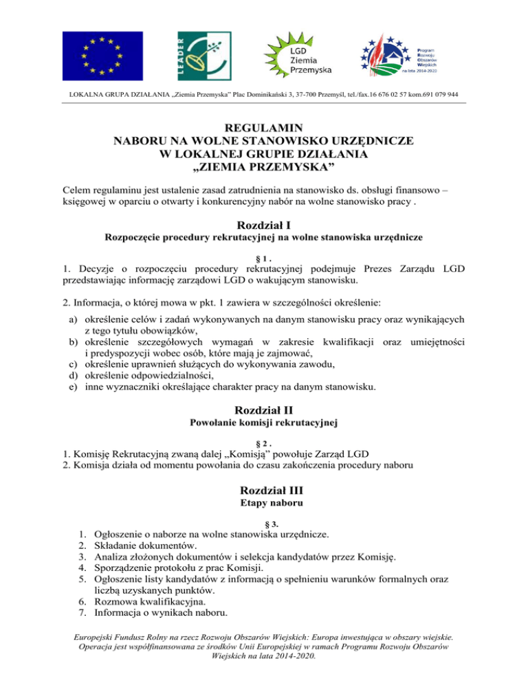 LOKALNA GRUPA DZIAŁANIA „Ziemia Przemyska” Plac Dominikański 3, 37-700 Przemyśl, tel./fax.16 676 02 57 kom.691 079 944 REGULAMIN NABORU NA WOLNE STANOWISKO URZĘDNICZE W LOKALNEJ GRUPIE DZIAŁANIA „ZIEMIA PRZEMYSKA” Celem regulaminu jest ustalenie zasad zatrudnienia na stanowisko ds. obsługi finansowo – księgowej w oparciu o otwarty i konkurencyjny nabór na wolne stanowisko pracy . Rozdział I Rozpoczęcie procedury rekrutacyjnej na wolne stanowiska urzędnicze §1. 1. Decyzje o rozpoczęciu procedury rekrutacyjnej podejmuje Prezes Zarządu LGD przedstawiając informację zarządowi LGD o wakującym stanowisku. 2. Informacja, o której mowa w pkt. 1 zawiera w szczególności określenie: a) określenie celów i zadań wykonywanych na danym stanowisku pracy oraz wynikających z tego tytułu obowiązków, b) określenie szczegółowych wymagań w zakresie kwalifikacji oraz umiejętności i predyspozycji wobec osób, które mają je zajmować, c) określenie uprawnień służących do wykonywania zawodu, d) określenie odpowiedzialności, e) inne wyznaczniki określające charakter pracy na danym stanowisku. Rozdział II Powołanie komisji rekrutacyjnej §2. 1. Komisję Rekrutacyjną zwaną dalej „Komisją” powołuje Zarząd LGD 2. Komisja działa od momentu powołania do czasu zakończenia procedury naboru Rozdział III Etapy naboru § 3. Ogłoszenie o naborze na wolne stanowiska urzędnicze. Składanie dokumentów. Analiza złożonych dokumentów i selekcja kandydatów przez Komisję. Sporządzenie protokołu z prac Komisji. Ogłoszenie listy kandydatów z informacją o spełnieniu warunków formalnych oraz liczbą uzyskanych punktów. 6. Rozmowa kwalifikacyjna. 7. Informacja o wynikach naboru. 1. 2. 3. 4. 5. Europejski Fundusz Rolny na rzecz Rozwoju Obszarów Wiejskich: Europa inwestująca w obszary wiejskie. Operacja jest współfinansowana ze środków Unii Europejskiej w ramach Programu Rozwoju Obszarów Wiejskich na lata 2014-2020. LOKALNA GRUPA DZIAŁANIA „Ziemia Przemyska” Plac Dominikański 3, 37-700 Przemyśl, tel./fax.16 676 02 57 kom.691 079 944 Rozdział IV Ogłoszenie o naborze na wolne stanowiska urzędnicze §4. 1. Ogłoszenie na wolne stanowiska urzędnicze umieszcza się na stronie internetowej i tablicy ogłoszeń LGD na okres 7 dni kalendarzowych. 2. Ogłoszenie o naborze na wolne stanowiska zawiera : a) nazwę i adres jednostki, b) określenie stanowiska urzędniczego, c) określenie wymagań niezbędnych związanych ze stanowiskiem zgodnie z opisem danego stanowiska, o którym mowa w § 1 pkt 2, d) wskazanie wymaganych dokumentów, e) określenie terminu i miejsca składania dokumentów. Rozdział V Zasady przyjmowania dokumentów §5. 1. Dokumenty są przyjmowane w biurze LGD w terminie wskazanym w ogłoszeniu w zaklejonej kopercie z dopiskiem: Dotyczy naboru na wolne stanowisko ds. obsługi finansowo – księgowej w Stowarzyszeniu Lokalna Grupa Działania „Ziemia Przemyska”. 2. Wymagane dokumenty: 1) życiorys (CV), 2) list motywacyjny, 3) kserokopie dokumentów poświadczających wykształcenie, 4) kserokopie świadectw pracy lub innych dokumentów potwierdzających staż pracy (jeżeli są w posiadaniu kandydata), 5) kserokopia dowodu osobistego, 6) oświadczenie kandydata, że posiada pełną zdolność do czynności prawnych oraz korzysta z pełni praw publicznych, 7) oświadczenie kandydata, że nie był karany za przestępstwo popełnione umyślnie, 8) inne dodatkowe dokumenty potwierdzające posiadane umiejętności i kwalifikacje. Rozdział VI Selekcja kandydatów §6. 1. Analizy dokumentów pod kątem formalnym oraz kryteriów naboru dokonuje Komisja w terminie do 3 dni od zakończenia naboru. 2. Celem analizy jest ocena spełnienia warunków formalnych oraz kryteriów naboru przez kandydatów do zatrudnienia na wakującym stanowisku. Europejski Fundusz Rolny na rzecz Rozwoju Obszarów Wiejskich: Europa inwestująca w obszary wiejskie. Operacja jest współfinansowana ze środków Unii Europejskiej w ramach Programu Rozwoju Obszarów Wiejskich na lata 2014-2020. LOKALNA GRUPA DZIAŁANIA „Ziemia Przemyska” Plac Dominikański 3, 37-700 Przemyśl, tel./fax.16 676 02 57 kom.691 079 944 3. Po przeprowadzeniu oceny formalnej oraz spełniania kryteriów ogłoszonych w naborze wniosków Komisja sporządza protokół zawierający w szczególności: a) opis stanowiska urzędniczego, na które prowadzono rekrutację b) liczbę kandydatów biorących udział w naborze c) nazwiska, imiona oraz adresy kandydatów uszeregowanych wg spełnienia przez nich kryteriów określonych w ogłoszeniu o naborze i wynikających z przeprowadzonego postępowania, d) uzasadnienie dokonanej oceny lub decyzji o odrzuceniu wszystkich kandydatur. 4. Protokół z przeprowadzenia postępowania komisja przedstawia niezwłocznie Prezesowi Zarządu LGD. 5. Na podstawie Protokołu sporządza się listę kandydatów, którzy spełniają wymagania formalne określone w ogłoszeniu wraz ze wskazaniem liczby punktów uzyskanych według kryteriów. 6. Lista, o której mowa w pkt. 1 zawiera: imiona i nazwiska kandydatów oraz informację o spełnieniu warunków formalnych i liczbę uzyskanych punktów. 7. Listę kandydatów ogłasza się na stronie internetowej LGD . 8. Po otrzymaniu protokołu Prezes Zarządu w terminie 3 dni ustala termin rozmowy kwalifikacyjnej, którą Komisja przeprowadza z maksymalnie trzema kandydatami, którzy uzyskali największą liczbę punktów według kryteriów określonych w naborze, weryfikując kandydatów i ich predyspozycje do pracy na wakującym stanowisku urzędniczym. Rozdział VII Informacja o wynikach naboru §7. 1. Informację o wynikach naboru upowszechnia się w terminie 7 dni od dnia zatrudnienia wybranego kandydata lub zakończenia procedury w przypadku, gdy nie doszło do zatrudnienia żadnego kandydata . 2. Informacja, o której mowa w pkt 1 zawiera: a) nazwa i adres jednostki b) określenie stanowiska urzędniczego c) im