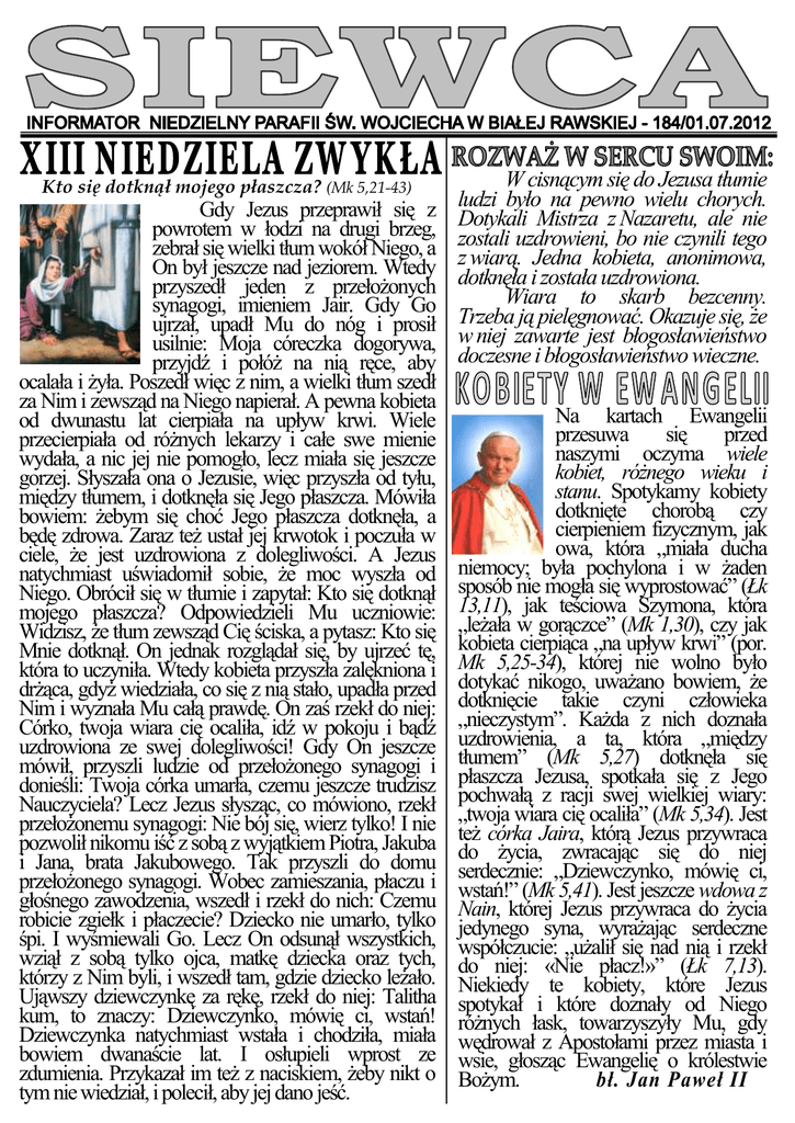 Kto się dotknął mojego płaszcza? (Mk 5,21-43) Gdy Jezus przeprawił się z powrotem w łodzi na drugi brzeg, zebrał się wielki tłum wokół Niego, a On był jeszcze nad jeziorem. Wtedy przyszedł jeden z przełożonych synagogi, imieniem Jair. Gdy Go ujrzał, upadł Mu do nóg i prosił usilnie: Moja córeczka dogorywa, przyjdź i połóż na nią ręce, aby ocalała i żyła. Poszedł więc z nim, a wielki tłum szedł za Nim i zewsząd na Niego napierał. A pewna kobieta od dwunastu lat cierpiała na upływ krwi. Wiele przecierpiała od różnych lekarzy i całe swe mienie wydała, a nic jej nie pomogło, lecz miała się jeszcze gorzej. Słyszała ona o Jezusie, więc przyszła od tyłu, między tłumem, i dotknęła się Jego płaszcza. Mówiła bowiem: żebym się choć Jego płaszcza dotknęła, a będę zdrowa. Zaraz też ustał jej krwotok i poczuła w ciele, że jest uzdrowiona z dolegliwości. A Jezus natychmiast uświadomił sobie, że moc wyszła od Niego. Obrócił się w tłumie i zapytał: Kto się dotknął mojego płaszcza? Odpowiedzieli Mu uczniowie: Widzisz, że tłum zewsząd Cię ściska, a pytasz: Kto się Mnie dotknął. On jednak rozglądał się, by ujrzeć tę, która to uczyniła. Wtedy kobieta przyszła zalękniona i drżąca, gdyż wiedziała, co się z nią stało, upadła przed Nim i wyznała Mu całą prawdę. On zaś rzekł do niej: Córko, twoja wiara cię ocaliła, idź w pokoju i bądź uzdrowiona ze swej dolegliwości! Gdy On jeszcze mówił, przyszli ludzie od przełożonego synagogi i donieśli: Twoja córka umarła, czemu jeszcze trudzisz Nauczyciela? Lecz Jezus słysząc, co mówiono, rzekł przełożonemu synagogi: Nie bój się, wierz tylko! I nie pozwolił nikomu iść z sobą z wyjątkiem Piotra, Jakuba i Jana, brata Jakubowego. Tak przyszli do domu przełożonego synagogi. Wobec zamieszania, płaczu i głośnego zawodzenia, wszedł i rzekł do nich: Czemu robicie zgiełk i płaczecie? Dziecko nie umarło, tylko śpi. I wyśmiewali Go. Lecz On odsunął wszystkich, wziął z sobą tylko ojca, matkę dziecka oraz tych, którzy z Nim byli, i wszedł tam, gdzie dziecko leżało. Ująwszy dziewczynkę za rękę, rzekł do niej: Talitha kum, to znaczy: Dziewczynko, mówię ci, wstań! Dziewczynka natychmiast wstała i chodziła, miała bowiem dwanaście lat. I osłupieli wprost ze zdumienia. Przykazał im też z naciskiem, żeby nikt o tym nie wiedział, i polecił, aby jej dano jeść. W cisnącym się do Jezusa tłumie ludzi było na pewno wielu chorych. Dotykali Mistrza z Nazaretu, ale nie zostali uzdrowieni, bo nie czynili tego z wiarą. Jedna kobieta, anonimowa, dotknęła i została uzdrowiona. Wiara to skarb bezcenny. Trzeba ją pielęgnować. Okazuje się, że w niej zawarte jest błogosławieństwo doczesne i błogosławieństwo wieczne. Na kartach Ewangelii przesuwa się przed naszymi oczyma wiele kobiet, różnego wieku i stanu. Spotykamy kobiety dotknięte chorobą czy cierpieniem fizycznym, jak owa, która „miała ducha niemocy; była pochylona i w żaden sposób nie mogła się wyprostować” (Łk 13,11), jak teściowa Szymona, która „leżała w gorączce” (Mk 1,30), czy jak kobieta cierpiąca „na upływ krwi” (por. Mk 5,25-34), której nie wolno było dotykać nikogo, uważano bowiem, że dotknięcie takie czyni człowieka „nieczystym”. Każda z nich doznała uzdrowienia, a ta, która „między tłumem” (Mk 5,27) dotknęła się płaszcza Jezusa, spotkała się z Jego pochwałą z racji swej wielkiej wiary: „twoja wiara cię ocaliła” (Mk 5,34). Jest też córka Jaira, którą Jezus przywraca do życia, zwracając się do niej serdecznie: „Dziewczynko, mówię ci, wstań!” (Mk 5,41). Jest jeszcze wdowa z Nain, której Jezus przywraca do życia jedynego syna, wyrażając serdeczne współczucie: „użalił się nad nią i rzekł do niej: «Nie płacz!»” (Łk 7,13). Niekiedy te kobiety, które Jezus spotykał i które doznały od Niego różnych łask, towarzyszyły Mu, gdy wędrował z Apostołami przez miasta i wsie, głosząc Ewangelię o królestwie Bożym. bł. Jan Paweł II Zanim Jezus dotarł do domu przełożonego synagogi, jego szat dotknęła kobieta, która od dwunastu lat cierpiała na krwotok. Św. Marek używa metafory: krwotok nazywa MASTIX, co znaczy batog, bicz. Gdy jest już po uzdrowieniu z krwotoku, Jezus zwraca się do kobiety: „Odejdź ku pokojowi i bądź zdrowa od BATOGA TWEGO”. Czy można przypuszczać, iż za tą przenośnią ukrywa się wcale nie przenośna przyczyna wieloletniej słabości? Niektórzy ludzie traktują się z taką agresją, z jaką ich traktowano w domu lub w najbliższym środowisku. Niszczą siebie biczami odrzucenia, gdy ich odrzucano. Mają o sobie najgorsze mniemanie, gdyż z takim odniesieniem spotykali się w domu. Biczują się bezwzględnie uczuciami agresji, gdyż bezwzględnie ich wychowywano. Krwawiąca kobieta uchwyciła się szat Jezusa od tyłu, jakby nie chciała być dostrzeżona albo jakby odmawiała sobie prawa do tego, by na nią patrzeć. Autoagresywne kobiety nie mogą patrzeć na siebie, bo są przekonane, że są brzydkie lub odrażające. Nikt nie odniósł się z należytym szacunkiem do ich ciała, było ono biczowane słowami albo fizycznie, gwałcone albo wyśmiewane. Trzeba zwrócić uwagę na różnice między biczowaniem, którym została nazwana choroba tej kobiety, a dotknięciem, na które się ona zdobyła. Jest też różnica między uderzaniem słowem a dotknięciem słowem. Wcale nie musi ktoś być bity w domu przez rodziców, wystarczy, że spotyka się z nieustannym krzykiem lub niechęcią, wyzwiskami i niezadowoleniem ojca lub matki i taki stosunek może stać się odniesieniem do siebie samego. Syrach zapisał: „Uderzenie rózgi wywołuje sińce, uderzenie języka łamie kości. Wielu padło od ostrza miecza, ale nie tylu, co od języka” (28,17–18). Coraz częściej słyszmy o osobach dokonujących s