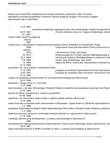 Kalendarium życia Koleje życia Anieli Róży Godeckiej wyznaczały konkretne wydarzenia i daty. Poniższe kalendarium pozwala prześledzić w pewnym skrócie drogę jej zmagań i kroczenia w ciągłym wsłuchiwaniu się w wolę Bożą. - 13 IX 1861 narodzenie Anieli jako najstarszej córki Jana Godeckiego i Natalii Kunegundy Ba 26 IX 1861 chrzest udzielony przez ks. Hugona Godeckiego, dzieck 15 I 1867 śmierć matki, Natalii Kunegundy wiosna 1867 Aniela wraz z rodzeństwem umieszczona pod opieką rodziny Auerbach w Kuźniecowie, Rosja 1868 rozpoczęcie nauki pod kierunkiem Emmy Antonowny Ła wiosna 1873 I Komunia św. Anieli, Korczewa XII 1874 Aniela przyjęta do IV klasy Instytutu Mikołajewskiego w 25 V 1882 ukończenie Instytutu Mikołajewskiego ze srebrnym med 7 IX 1883 śmierć Jana Godeckiego, ojca Anieli IX 1885 wyjazd do Wilna i praca jako nauczycielka w domach pr 21 XI 1886 spowiedź u ks. Jana Łaboka i nawrócenie Anieli 17 IX 1887 przyjęcie do postulatu Zgromadzenia Córek Najczystsze 8 XII 1887 przyjęcie do nowicjatu sióstr sercanek i otrzymanie imien 27 VI 1888 wyjazd na rekolekcje pod kierunkiem bł. Honorata Koźmińskiego do Zakroczymia 29 VI 1888 spowiedź z całego życia u o. Honorata 9 VII 1888 bierzmowanie z rąk abp. Wincentego Chościak-Popiela w katedrze warszawskiej, przyjmuje imię Paweł 10 VII 1888 - powrót do Wilna i pożegnanie z rodziną i przyjaciółmi 19 VIII 1888 - spotkanie z bł. Honoratem i jego prośba o objęcie opieką robotnic fabrycznych 13 IX 1888 - walka duchowa w kościele sióstr sakramentek w Warszawie i zgoda Anieli na założenie zgromadzenia z 4 X 1888 - powstanie Zgromadzenia Małych Sióstr Niepokalanego Serca Maryi, którego Aniela Godecka zostaje pr 4 X 1889 - obietnica wierności złożona w zamkniętej zakrystii kościoła oo. kapucynów w Zakroczymiu 17 IX 1890 - I profesja zakonna przy konfesjonale o. Łukasza Zaczyńskiego w Zakroczymiu 1890 - wprowadzenie trójstopniowej struktury Zgromadzenia: siostry życia wspólnego, siostry zjednoczone, sios 26 III 1891 - śluby wieczyste złożone w Wielki Czwartek na ręce o. Łukasza Zaczyńskiego w Zakroczymiu 1/2 Kalendarium życia XI – XII 1891 pobyt u ss. felicjanek w Krakowie, aby nauczyć się prow 1895 - podział Zgromadzenia na 2 prowincje: warszawską i łódzką 1895 - nadanie przez o. Honorata nowego imienia zakonnego: 2 X 1900 pierwsza Kapituła Generalna – A. R. Godecka nadal prz 1900-1902 - pobyt we Włocławku 14 II 1902 - przybycie do Nowego Miasta na prośbę m. Elżbiety Stummer, sekretarki bł. Honorata 15 III 1902 - śmierć m. Elżbiety Stummer 22 III 1902 przyjęcie obowiązku sekretarki o. Honorata Koźmińskiego 1905 podział Zgromadzenia na 4 prowincje: warszawską, czę 1906 zwolnienie z pracy sekretarki o. Honorata 19 III 1907 druga Kapituła Generalna (Nowe Miasto nad Pilicą) – A. 7 IV 1908 dekret Stolicy Apostolskiej likwidujący dział sióstr zjedno 12 IV 1910 otwarcie domu przy ul. Starej 15 (obecnie ul. Klasztorne 2 X 1911 pierwsza rewizja policji rosyjskiej w domu w Częstochow 31 VII 1914 wybuch I wojny światowej 14 V 1915 A. R. Godecka wraz z nowicjuszkami wyrusza z Nowego 16 XI 1916 powrót Sługi Bożej do Nowego Miasta 16 XII 1916 śmierć o. Honorata Koźmińskiego XII 1916 wyjazd na stałe do Częstochowy i przeniesienie tam sie 13 IV 1923 zatwierdzenie przez Ministerstwo Spraw Wewnętrznych 1 XII 1929 Dekret Pochwalny Stolicy Apostolskiej dla Zgromadzeni 12 VIII 1931 Kapituła Generalna – A. R. Godecka wybrana na przeło 2 IX 1934 rozwiązanie Stowarzyszenia „Przezorność” i ujawnienie 20 VIII 1937 ciężka choroba Sługi Bożej 13 X 1937 śmierć m. A. R. Godeckiej 15 X 1937 pogrzeb i pośmiertne odznaczenie Złotym Krzyżem Zas 2/2