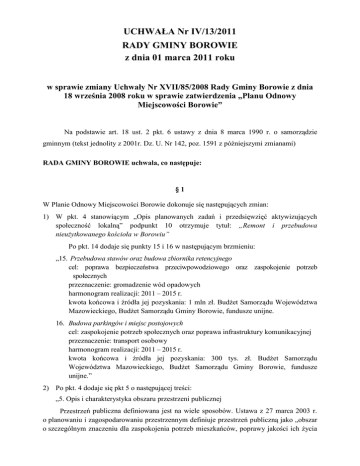 UCHWAŁA Nr IV/13/2011 RADY GMINY BOROWIE z dnia 01 marca 2011 roku w sprawie zmiany Uchwały Nr XVII/85/2008 Rady Gminy Borowie z dnia 18 września 2008 roku w sprawie zatwierdzenia „Planu Odnowy Miejscowości Borowie” Na podstawie art. 18 ust. 2 pkt. 6 ustawy z dnia 8 marca 1990 r. o samorządzie gminnym (tekst jednolity z 2001r. Dz. U. Nr 142, poz. 1591 z późniejszymi zmianami) RADA GMINY BOROWIE uchwala, co następuje: §1 W Planie Odnowy Miejscowości Borowie dokonuje się następujących zmian: 1) W pkt. 4 stanowiącym „Opis planowanych zadań i przedsięwzięć aktywizujących społeczność lokalną” podpunkt 10 otrzymuje tytuł: „Remont i przebudowa nieuŜytkowanego kościoła w Borowiu” Po pkt. 14 dodaje się punkty 15 i 16 w następującym brzmieniu: „15. Przebudowa stawów oraz budowa zbiornika retencyjnego cel: poprawa bezpieczeństwa przeciwpowodziowego oraz zaspokojenie potrzeb społecznych przeznaczenie: gromadzenie wód opadowych harmonogram realizacji: 2011 – 2015 r. kwota końcowa i źródła jej pozyskania: 1 mln zł. BudŜet Samorządu Województwa Mazowieckiego, BudŜet Samorządu Gminy Borowie, fundusze unijne. 16. Budowa parkingów i miejsc postojowych cel: zaspokojenie potrzeb społecznych oraz poprawa infrastruktury komunikacyjnej przeznaczenie: transport osobowy harmonogram realizacji: 2011 – 2015 r. kwota końcowa i źródła jej pozyskania: 300 tys. zł. BudŜet Samorządu Województwa Mazowieckiego, BudŜet Samorządu Gminy Borowie, fundusze unijne.” 2) Po pkt. 4 dodaje się pkt 5 o następującej treści: „5. Opis i charakterystyka obszaru przestrzeni publicznej Przestrzeń publiczna definiowana jest na wiele sposobów. Ustawa z 27 marca 2003 r. o planowaniu i zagospodarowaniu przestrzennym definiuje przestrzeń publiczną jako „obszar o szczególnym znaczeniu dla zaspokojenia potrzeb mieszkańców, poprawy jakości ich Ŝycia i sprzyjający nawiązywaniu kontaktów społecznych ze względu na jego połoŜenie oraz cechy funkcjonalno - przestrzenne, określony w studium uwarunkowań i kierunków zagospodarowania przestrzennego gminy”. Przestrzeń publiczna to równieŜ obszar, przy którym znajdują się najwaŜniejsze obiekty o znaczeniu społecznym, usługowym i kulturalnym, gdzie mieszkańcy i przyjezdni mają moŜliwość wzajemnego poznawania się, wymiany poglądów czy integracji. W przypadku miejscowości Borowie, przestrzeń publiczna obejmuje kilka obszarów usytuowanych przy obiektach o charakterze społeczno-usługowym, kulturalnym i sakralnym: • obszar stanowiący centrum wsi, przy którym po jednej stronie drogi krajowej nr 76 znajduje się Gminny Ośrodek Kultury, remiza OSP, bar, sklepy spoŜywcze i przemysłowe, kwiaciarnia, park, skrzyŜowanie z drogą powiatową nr 1333W, nieuŜytkowany zabytkowy kościół oraz ośrodek zdrowia z apteką i przystanek autobusowy. Po drugiej zaś stronie drogi nr 76 usytuowany jest przystanek autobusowy, budynek po dawnej szkole podstawowej oraz cmentarz parafialny. Obszar ten wymaga zagospodarowania w postaci dodatkowych parkingów i miejsc postojowych oraz ścieŜki rowerowej a takŜe remontu konserwatorskiego nieuŜytkowanego zabytkowego kościoła. W tej części przestrzeni publicznej, koncentruje się Ŝycie społeczne mieszkańców Borowia i gminy; • obszar wzdłuŜ drogi gminnej stanowiącej ulicę Aleksandra Sasimowskiego, przy której po jednej stronie drogi znajduje się Urząd Gminy, Poczta oraz dyskoteka i Posterunek Policji, zaś po drugiej stronie ulicy znajduje się plac zabaw i boisko mieszczące się przy Zespole Oświatowym, w skład którego wchodzi przedszkole, szkoła podstawowa oraz gimnazjum. Po obu stronach ulicy znajdują się stawy rybne, które stanowią miejsce odpoczynku dla społeczności lokalnej. Obszar ten wymaga zagospodarowania w postaci rewitalizacji stawów oraz wybudowania infrastruktury sportowej, gdyŜ obecna znajduje się w złym stanie technicznym i nie zaspokaja potrzeb mieszkańców. Wobec powyŜszego zaplanowano budowę nowoczesnego boiska wielofunkcyjnego oraz boiska do gry w piłkę noŜną o nawierzchni syntetycznej w ramach Programu "Moje Boisko - Orlik 2012". W wyniku realizacji wymienionych zadań istotnie wzrośnie atrakcyjność tej przestrzeni publicznej, co prowadzić będzie do poprawy integracji społecznej na terenie miejscowości.” §2 Jednolity tekst Planu Odnowy Miejscowości Borowie uwzględniający dotychczas uchwalone zmiany stanowi załącznik do niniejszej uchwały. §3 Wykonanie uchwały powierza się Wójtowi Gminy. §4 Uchwała wchodzi w Ŝycie z dniem podjęcia. 2 Załącznik do Uchwały nr IV/13/2011 Rady Gminy Borowie z dnia 01 marca 2011 roku Plan Odnowy Miejscowości Borowie wrzesień 2008 3 1. Charakterystyka miejscowości Borowie jest miejscowością gminną o powierzchni 5,6 km2 połoŜoną w dolinie rzeki Wilgi, prawego dopływu Wisły, na terenie powiatu garwolińskiego w południowo-wschodniej części województwa mazowieckiego. Aktualnie miejscowość zamieszkuje 543 osoby na stałe zameldowanych. PołoŜenie Borowia uwaŜa się za korzystne z uwagi na przebiegającą drogę krajową nr 76 Wilga – Garwolin - Stoczek Łukowski - Łuków oraz sieć dróg powiatowych łączących kilka sąsiednich gmin, a takŜe linię kolejową Skierniewice Pilawa – Łuków - Terespol. Dzięki dobrze rozwiniętej sieci dróg oraz linii kolejowej, Borowie ma bardzo dobre połączenie z takimi miastami jak Warszawa, Garwolin, Siedlce, Lublin, Mińsk Mazowiecki oraz Ryki i Łuków. Pierwsze wzmianki na temat Borowia sięgają XV wieku. Do połowy wieku XVI Borowie naleŜało do potęŜnego na Mazowszu rodu Parysów i było niewielką osadą o nazwie Jastrzębie. W 1548 roku dzięki staraniom ówczesnego jej właściciela Jana Warszewickiego, kasztelana liwskiego, wieś uzyskała od króla Zygmunta Starego przywilej lokacyjny na załoŜenie miasta pod nazwą Borowie. Nazwa została nadana z uwagi na liczne las