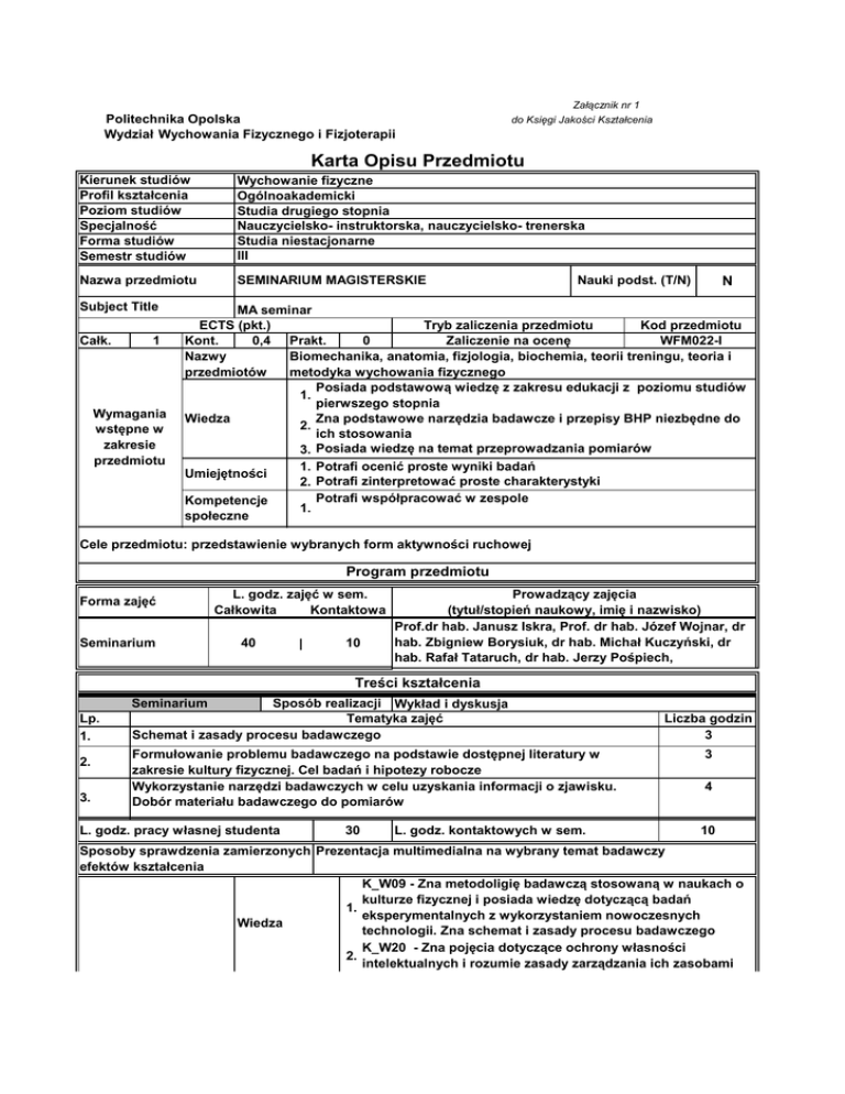 Załącznik nr 1 Politechnika Opolska Wydział Wychowania Fizycznego i Fizjoterapii do Księgi Jakości Kształcenia Karta Opisu Przedmiotu Kierunek studiów Profil kształcenia Poziom studiów Specjalność Forma studiów Semestr studiów Wychowanie fizyczne Ogólnoakademicki Studia drugiego stopnia Nauczycielsko- instruktorska, nauczycielsko- trenerska Studia niestacjonarne III Nazwa przedmiotu SEMINARIUM MAGISTERSKIE Subject Title Całk. 1 Wymagania wstępne w zakresie przedmiotu Nauki podst. (T/N) N MA seminar ECTS (pkt.) Tryb zaliczenia przedmiotu Kod przedmiotu Kont. 0,4 Prakt. 0 Zaliczenie na ocenę WFM022-I Nazwy Biomechanika, anatomia, fizjologia, biochemia, teorii treningu, teoria i przedmiotów metodyka wychowania fizycznego Posiada podstawową wiedzę z zakresu edukacji z poziomu studiów 1. pierwszego stopnia Wiedza Zna podstawowe narzędzia badawcze i przepisy BHP niezbędne do 2. ich stosowania 3. Posiada wiedzę na temat przeprowadzania pomiarów 1. Potrafi ocenić proste wyniki badań Umiejętności 2. Potrafi zinterpretować proste charakterystyki Potrafi współpracować w zespole Kompetencje 1. społeczne 2. Cele przedmiotu: przedstawienie wybranych form aktywności ruchowej Program przedmiotu Forma zajęć Wykład L. godz. zajęć w sem. Całkowita Kontaktowa 0 0 | Seminarium 40 | 10 Prowadzący zajęcia (tytuł/stopień naukowy, imię i nazwisko) Prof.dr hab. Janusz Iskra, Prof. dr hab. Józef Wojnar, dr hab. Zbigniew Borysiuk, dr hab. Michał Kuczyński, dr hab. Rafał Tataruch, dr hab. Jerzy Pośpiech, Treści kształcenia Sposób realizacji Sposób realizacji Sposób realizacji Wykład i dyskusja Tematyka zajęć Schemat i zasady procesu badawczego Wykład Ćwiczenia Seminarium Lp. 1. 2. 3. Formułowanie problemu badawczego na podstawie dostępnej literatury w zakresie kultury fizycznej. Cel badań i hipotezy robocze Wykorzystanie narzędzi badawczych w celu uzyskania informacji o zjawisku. Dobór materiału badawczego do pomiarów L. godz. pracy własnej studenta 30 L. godz. kontaktowych w sem. Liczba godzin 3 3 4 10 Sposoby sprawdzenia zamierzonych Prezentacja multimedialna na wybrany temat badawczy efektów kształcenia K_W09 - Zna metodoligię badawczą stosowaną w naukach o kulturze fizycznej i posiada wiedzę dotyczącą badań 1. eksperymentalnych z wykorzystaniem nowoczesnych Wiedza technologii. Zna schemat i zasady procesu badawczego K_W20 - Zna pojęcia dotyczące ochrony własności 2. intelektualnych i rozumie zasady zarządzania ich zasobami Efekty kształcenia dla przedmiotu - po zakończonym cyklu kształcenia Efekty kształcenia dla przedmiotu - po zakończonym cyklu kształcenia K_U03 - Wykorzystując poznawczą metodologię badań potrafi zorganizować badania w obszarze kultury fizycznej K_U10 - Potrafi zaprojektować proces diagnostyczny w 2. oparciu o dostępną aparaturę. Potrafi dokonać analizy statystycznej z wykorzystaniem programów komputerowych 1. Umiejętności Kompetencje społeczne K_U12 - Podejmuje współpracę w zakresie realizacji 3. podjętych działań badawczych, wykazując się przy tym odpowiedzialnością, samodzielnością i kreatywnością K_K08 - Posiada umiejętność słuchania i empatycznego rozumienia. Wykazuje zdolność wrażliwego obserwatora oraz 1. umiejętność sprawnego i twórczego rozwiązywania sytuacji problemowych 2. Metody dydaktyczne: Dyskusja dydaktyczna, prezentacje multimedialna, konsultacje ustne Forma i warunki zaliczenia przedmiotu: • Uzyskanie co najmniej 90% frekwencji na seminariach • Prezentacja multimedialna na wybrany temat badawczy Literatura podstawowa: Stanisz A.: Przystępny kurs statystyki w oparciu o program STATISTICA PL na przykładach z [1] medycyny. StatSoft, Kraków, 1998. Pilch T, Bauman T.: Zasady badań pedagogicznych. Strategie ilościowe i jakościowe. Wydawnictwo [2] Akademickie "Żak" (wydanie drugie , poprawione i uzupełnione). Juszczyk S. Metodologia badań empirycznych w naukach społecznych. Tom I. Badania Ilościowe. [3] AWF, Katowice, 2001. Zagórny S.: Wybrane problemy metodologii nauk społecznych wraz z tekstami źródłowymi. [4] Politechnika Opolska, Skrypt nr 278, opOLE, 2006. Grabowski H. Metody empiryczne w naukach o kulturze fizycznej. AWF, Kraków, Wydawnictwo [5] skryptowe nr 136, Kraków, 1996. [6] [7] Pilch T.: Metodologia badań pedagogicznych. Warszawa, 1995. Literatura uzupełniająca: [1] Zaczyński W.: Praca badawcza nauczyciela. PWN, Warszawa, 1995. [2] Pytkowski W.: Organizacja badań i ocena prac naukowych. Warszawa, 1985. [3] Pilch T.: Metodologia badań pedagogicznych. Warszawa, 1995. [4] Karolczak-Biernacka B.: Metodologia pracy naukowej. Tom I. i II. AWF, Warszawa, 1975 Dąbkowski J.: Statgraphics. System statystycznego opacowywania danych. Komputerowa Oficyna [5] Wydawnicza HELP, Warszawa, 1992. Zimny T.: Metody statystyczne w badaniach idiagnostyce pedagogicznej. Uniwersytet Szczeciński, [6] [7] Szczecin, 2007. ______________ * niewłaściwe przekreślić ………………………………………………….. ………………………………………………………. (kierownik jednostki organizacyjnej/bezpośredni przełożony: pieczęć/podpis (Dziekan Wydziału pieczęć/podpis)