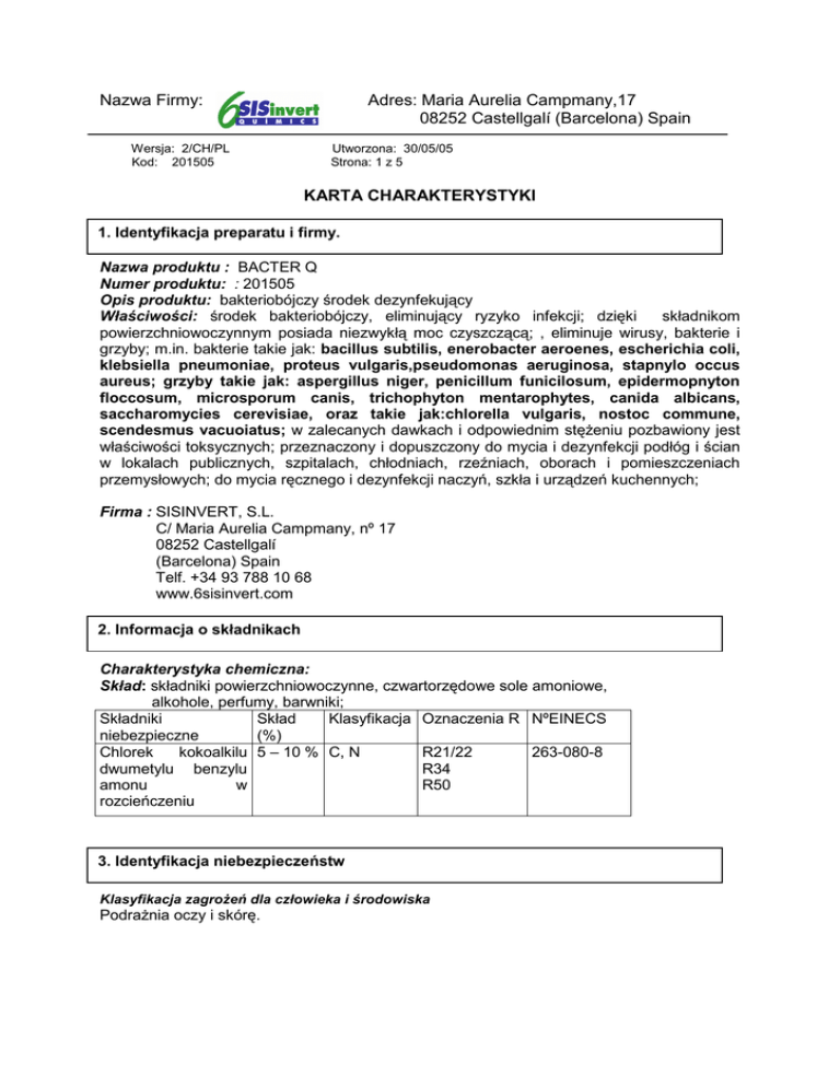 Nazwa Firmy: Wersja: 2/CH/PL Kod: 201505 Adres: Maria Aurelia Campmany,17 08252 Castellgalí (Barcelona) Spain Utworzona: 30/05/05 Strona: 1 z 5 KARTA CHARAKTERYSTYKI 1. Identyfikacja preparatu i firmy. Nazwa produktu : BACTER Q Numer produktu: : 201505 Opis produktu: bakteriobójczy środek dezynfekujący Właściwości: środek bakteriobójczy, eliminujący ryzyko infekcji; dzięki składnikom powierzchniowoczynnym posiada niezwykłą moc czyszczącą; , eliminuje wirusy, bakterie i grzyby; m.in. bakterie takie jak: bacillus subtilis, enerobacter aeroenes, escherichia coli, klebsiella pneumoniae, proteus vulgaris,pseudomonas aeruginosa, stapnylo occus aureus; grzyby takie jak: aspergillus niger, penicillum funicilosum, epidermopnyton floccosum, microsporum canis, trichophyton mentarophytes, canida albicans, saccharomycies cerevisiae, oraz takie jak:chlorella vulgaris, nostoc commune, scendesmus vacuoiatus; w zalecanych dawkach i odpowiednim stęŜeniu pozbawiony jest właściwości toksycznych; przeznaczony i dopuszczony do mycia i dezynfekcji podłóg i ścian w lokalach publicznych, szpitalach, chłodniach, rzeźniach, oborach i pomieszczeniach przemysłowych; do mycia ręcznego i dezynfekcji naczyń, szkła i urządzeń kuchennych; Firma : SISINVERT, S.L. C/ Maria Aurelia Campmany, nº 17 08252 Castellgalí (Barcelona) Spain Telf. +34 93 788 10 68 www.6sisinvert.com 2. Informacja o składnikach Charakterystyka chemiczna: Skład: składniki powierzchniowoczynne, czwartorzędowe sole amoniowe, alkohole, perfumy, barwniki; Składniki Skład Klasyfikacja Oznaczenia R NºEINECS niebezpieczne (%) Chlorek kokoalkilu 5 – 10 % C, N R21/22 263-080-8 dwumetylu benzylu R34 amonu w R50 rozcieńczeniu 3. Identyfikacja niebezpieczeństw Klasyfikacja zagroŜeń dla człowieka i środowiska PodraŜnia oczy i skórę. Nazwa Firmy: Wersja: 2/CH/PL Kod: 201505 Adres: : Maria Aurelia Campmany,17 08252 Castellgalí (Barcelona) Spain Utworzona: 30/05/05 Strona: 2 z 5 KARTA CHARAKTERYSTYKI 4. Pierwsza pomoc Kontak z oczami: przemyć natychmiast wodą obficie i udać się do okulisty Kontakt ze skórą: przemyć obficie wodą z mydłem SpoŜycie: wypłukać usta wodą; nie prowokować wymiotów 5. Postępowanie w przypadku poŜaru UŜywać odpowiednich środków gaśniczych: strumienia wody, piany, dwutlenku węgla, proszku chemicznego Niebezpieczne produkty rozkładu: ------------------------- 6. Postępowanie w przypadku uwolnienia do środowiska Indywidualne środki ostroŜności : --------------------Niezbędne środki w zakresie ochrony środowiska: Unikać dostępu produktu do wód ściekowych, wód powierzchniowych i wód podziemnych. 7. Postępowanie z preparatem i jego magazynowanie Środki ostroŜności podczas obchodzenia się z substancją: Przestrzegać przepisów prawnych w zakresie ochrony i bezpieczeństwa. Wymagania w zakresie przechowywania i opakowań Przechowywać tylko w oryginalnych i oznaczonych pojemnikach. 8. Kontrola naraŜenia / środki ochrony indywidualnej Parametry kontroli naraŜenia w miejscu pracy: -------------------------------Środki ochrony indywidualnej: przestrzegać ogólnych zasad bezpieczeństwa i higieny Ochrona rąk: uŜywać rękawic ochronnych Ochrona oczu: chronić oczy okularami ochronnymi Ochrona dróg oddechowych : nie jest wymagana w przypadku prawidłowego stosowania 9. Właściwości fizykochemiczne Stan skupienia/postać : płyn Kolor : niebieski - liliowy Zapach : perfumowany Wartość pH (20ºC): 1+0,020 /cm³ Temp. wrzenia: : -------------------------------Temp. topnienia : -------------------------------- Nazwa Firmy: Adres: Maria Aurelia Campmany, 17 08252 Castellgalí (Barcelona)Spain Wersja: 2/CH/PL Kod: 201505 Utworzona: 30/05/05 Strona: 3 z 5 KARTA CHARAKTERYSTYKI Punkt samozapłonu : -------------------------------Palność: -------------------------------Właściwości wybuchowe: -------------------------------Właściwości utleniające: -------------------------------PręŜność par: -------------------------------Gęstość względna: 1.200 +- 0.020 g/cm³ Rozpuszczalność w wodzie: całkowita Wskaźnik refrakcji: 9+_1% 10. Stabilność i reaktywność Produkt stabilny. Warunki, których naleŜy unikać: Przy prawidłowym uŜytkowaniu i przechowywaniu produkt jest stabilny. Substancje, których naleŜy unikać: Nie mieszać z kwasami. 11. Informacje toksykologiczne Nie dysponuje się danymi o toksyczności. 12. Informacje ekologiczne Nie dysponuje się danymi ekologicznymi. 13. Postępowanie z odpadami. Zalecenia dotyczące preparatu: Pozostałości składować w oryginalnych pojemnikach. Utylizować zgodnie z obowiązującymi przepisami. Zalecenia dotyczące zuŜytych opakowań: NaleŜy stosować do obowiązującego lokalnego prawa. 14. Informacje o transporcie Produkt sklasyfikowany jako podraŜniający. Produkt nie jest niebezpieczny podczas transportu drogowego, morskiego i lotniczego. 15. Informacje dotyczące uregulowań prawnych Oznaczenia literowe i określenia niebezpieczeństwa: podraŜniający (Xi) Nazwy niebezpiecznych składników umieszczone na etykiecie: 5-10 % składniki powierzchniowoczynne, kationowe Określenia rodzaju zagroŜenia: podraŜnia oczy i skórę R36/38 podraŜnia oczy i skórę Nazwa Firmy: Wersja: 2/CH /PL Kod: : 204705 Adres: Maria Aurelia Campmany, 17 08252 Castellgalí(Barcelona)Spain Utworzona: 30/05/05 Strona: 4 z 5 KARTA CHARAKTERYSTYKI Określenia dotyczące prawidłowego postępowania z niebezpieczną substancją: S2 przechowywać poza zasięgiem dzieci S 26 w przypadku kontaktu z oczami przemyć je natychmiast wodą i udać się do okulisty S 28 w przypadku kontaktu ze skórą przemyć ją obficie wodą S45 w razie przypadkowego spoŜycia udać się do lekarza i pokazać etykietę Oznaczenia sanitarne: RSIPAC 37-04280/CAT Piktogramy: Zastosowane przepisy krajowe: Ustawa o substancjach i preparatach chemicznych z dnia 11 stycznia 2001 r. (Dz. U. Nr 11, poz.84 wraz z późniejszymi zmianami). Rozpo