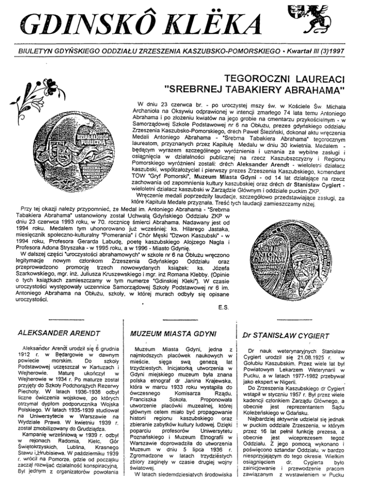 zachowania od zapomnienia kultury kaszubskiej oraz drech dr Stanisław Cygiert wieloletni działacz kaszubski w Zarządzie Głównym i oddziale puckim ZKP.
