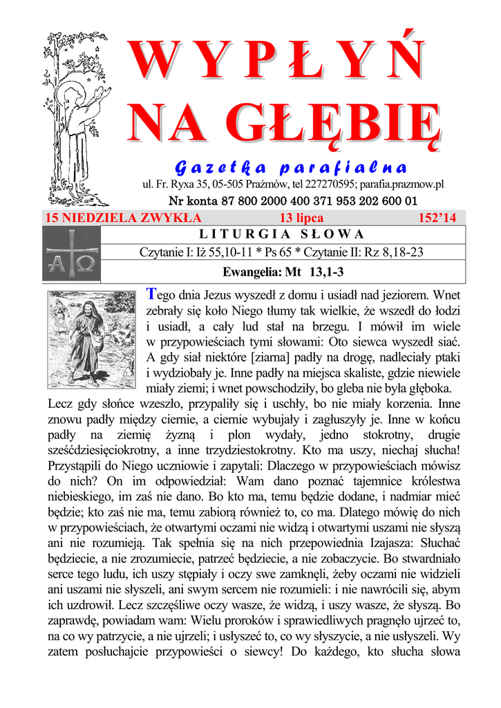 WYPŁYŃ NA GŁĘBIĘ Gazetka parafialna ul. Fr. Ryxa 35, 05-505 Prażmów, tel 227270595; parafia.prazmow.pl Nr konta 87 800 2000 400 371 953 202 600 01 15 NIEDZIELA ZWYKŁA 13 lipca 152’14 LITURGIA SŁOWA Czytanie I: Iż 55,10-11 * Ps 65 * Czytanie II: Rz 8,18-23 Ewangelia: Mt 13,1-3 Tego dnia Jezus wyszedł z domu i usiadł nad jeziorem. Wnet zebrały się koło Niego tłumy tak wielkie, że wszedł do łodzi i usiadł, a cały lud stał na brzegu. I mówił im wiele w przypowieściach tymi słowami: Oto siewca wyszedł siać. A gdy siał niektóre [ziarna] padły na drogę, nadleciały ptaki i wydziobały je. Inne padły na miejsca skaliste, gdzie niewiele miały ziemi; i wnet powschodziły, bo gleba nie była głęboka. Lecz gdy słońce wzeszło, przypaliły się i uschły, bo nie miały korzenia. Inne znowu padły między ciernie, a ciernie wybujały i zagłuszyły je. Inne w końcu padły na ziemię żyzną i plon wydały, jedno stokrotny, drugie sześćdziesięciokrotny, a inne trzydziestokrotny. Kto ma uszy, niechaj słucha! Przystąpili do Niego uczniowie i zapytali: Dlaczego w przypowieściach mówisz do nich? On im odpowiedział: Wam dano poznać tajemnice królestwa niebieskiego, im zaś nie dano. Bo kto ma, temu będzie dodane, i nadmiar mieć będzie; kto zaś nie ma, temu zabiorą również to, co ma. Dlatego mówię do nich w przypowieściach, że otwartymi oczami nie widzą i otwartymi uszami nie słyszą ani nie rozumieją. Tak spełnia się na nich przepowiednia Izajasza: Słuchać będziecie, a nie zrozumiecie, patrzeć będziecie, a nie zobaczycie. Bo stwardniało serce tego ludu, ich uszy stępiały i oczy swe zamknęli, żeby oczami nie widzieli ani uszami nie słyszeli, ani swym sercem nie rozumieli: i nie nawrócili się, abym ich uzdrowił. Lecz szczęśliwe oczy wasze, że widzą, i uszy wasze, że słyszą. Bo zaprawdę, powiadam wam: Wielu proroków i sprawiedliwych pragnęło ujrzeć to, na co wy patrzycie, a nie ujrzeli; i usłyszeć to, co wy słyszycie, a nie usłyszeli. Wy zatem posłuchajcie przypowieści o siewcy! Do każdego, kto słucha słowa o królestwie, a nie rozumie go, przychodzi Zły i porywa to, co zasiane jest w jego sercu. Takiego człowieka oznacza ziarno posiane na drodze. Posiane na miejsce skaliste oznacza tego, kto słucha słowa i natychmiast z radością je przyjmuje; ale nie ma w sobie korzenia, lecz jest niestały. Gdy przyjdzie ucisk lub prześladowanie z powodu słowa, zaraz się załamuje. Posiane między ciernie oznacza tego, kto słucha słowa, lecz troski doczesne i ułuda bogactwa zagłuszają słowo, tak że zostaje bezowocne. Posiane w końcu na ziemię żyzną oznacza tego, kto słucha słowa i rozumie je. On też wydaje plon: jeden stokrotny, drugi sześćdziesięciokrotny, inny trzydziestokrotny. Oto słowo Pańskie. BOŻY ZASIEW Jak każdej niedzieli przychodzimy na Najświętszą Eucharystię, by spotkać się z Boskim Siewcą – naszym Panem i Zbawicielem. Wiemy, że Msza święta składa się z dwóch podstawowych części: liturgii Słowa i liturgii Eucharystycznej. „Wiara rodzi się z tego, co się słyszy” – mówi św. Paweł. Dlatego najpierw chcemy karmić naszą wiarę Słowem Bożym. W tej części centralnym miejscem jest stół Słowa – ambona. Warto uświadomić sobie, że ten zasiew trwa od czasów Pana Jezusa i będzie trwał aż do końca dziejów. Z pokolenia na pokolenie pośród różnych doświadczeń Kościół niestrudzenie sieje ziarno Prawdy i Miłości. Opowiadał kiedyś sługa Boży ks. Kard. Stefan Wyszyński, że we wrześniu 1939 roku – na początku II Wojny Światowej - jako młody kapłan znalazł się w okolicach Dęblina. Spowiadał w okopie żołnierza, który był zdruzgotany i załamany. „Co oni z nami zrobili. Co będzie z Polską” – skarżył się biedny żołnierz. Tymczasem na pobliskim polu chodził rolnik i siał ziarno. Samoloty wroga latały nisko, w pobliżu słychać było wystrzały a siewca wyszedł siać ziarno. Ksiądz Wyszyński podszedł do niego i spytał dlaczego w tak dramatycznych okolicznościach pracuje na roli? „A bo widzi ksiądz, jeśli ziarno zostawię w stodole spalą albo zabiorą. A jeśli wrzucę w ziemię – da Bóg, że wyrośnie, ktoś zbierze, by chleba nie zbrakło”. Ten bohaterski siewca zapadł głęboko w serce Prymasa Tysiąclecia i wielokrotnie w konferencjach do kapłanów – w trudnych czasach komunizmu – przywoływał tę scenę, by ukazywać istotę wierności zadaniom, które Bóg nam zlecił. I tu pojawia się problem wolności. Można postawić pytanie: „Czy wierność obowiązkom jest drogą wolności czy też zniewolenia?”. Wiemy, że najbardziej cenioną wartością w świecie liberalnym (jak sama nazwa wskazuje) jest wolność. Problem leży jednak w zrozumieniu czym jest wolność i jak z niej korzystać. Jeśli ktoś stawia sobie te dwa pytania jest człowiekiem myślącym, reflektującym nad swoim życiem i światem, który go otacza. Na ogół wolność jest dzisiaj pojmowana jako pewien zbiór warunków sprzyjających pełnemu, nieskrępowanemu rozwojowi człowieka, dążącego do samorealizacji. Wolność, którą daje nam Jezus jest zupełnie inna. 2 Pan Jezus kreśli w dzisiejszej Ewangelii przed naszymi oczyma sytuacje ludzi w zetknięciu z Bożym ziarnem, a których los naznaczony jest różnymi przeciwnościami. Droga, skała, ciernie nie stanowią obiektywnego usprawiedliwienia braku owoców. To my często tłumaczymy się zewnętrznymi trudnościami: brakiem czasu, tempem życia, słabym zdrowiem itd. Chrystus mówi o warunkach wewnętrznych przyjęcia Słowa, na które każdy ma wpływ bo łaska nie jest uzależniona od zewnętrznych uwarunkowań. Bardzo wyraźnie ukazuje nam te prawdę Pan Jezus w Kazaniu na Górze, które stanowi swoistą konstytucję Królestwa Bożego. Szczególnie błogosławieństwa wprowadzając nas w zupełnie inny sposób myślenia. Mówi Pan Bóg przez prorok