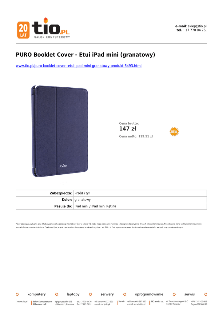 e-mail: [email protected] tel. : 17 770 04 76, PURO Booklet Cover - Etui iPad mini (granatowy) www.tio.pl/puro-booklet-cover--etui-ipad-mini-granatowy-produkt-5493.html Cena brutto: 147 zł Cena netto: 119.51 zł Zabezpiecza: Przód i tył Kolor: granatowy Pasuje do: iPad mini / iPad mini Retina *Ceny obowiązują wyłącznie przy składaniu zamówień przez sklep internetowy. Ceny w salonie TiO media mogą nieznacznie różnić się od cen prezentowanych na stronach sklepu internetowego. Przedstawiona oferta w sklepie internetowym nie stanowi oferty w rozumieniu Kodeksu Cywilnego, i jest jedynie zaproszeniem do rozpoczęcia rokowań (zgodnie z art. 71 k.c.). Zastrzegamy sobie prawo do niezrealizowania zamówień z ważnych przyczyn ekonomicznych.