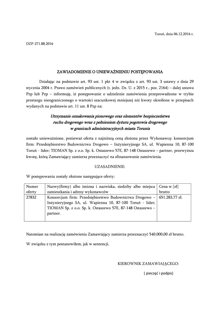 Toruń, dnia 06.12.2016 r. DZP-271.88.2016 ZAWIADOMIENIE O UNIEWAŻNIENIU POSTĘPOWANIA Działając na podstawie art. 93 ust. 1 pkt 4 w związku z art. 93 ust. 3 ustawy z dnia 29 stycznia 2004 r. Prawo zamówień publicznych (t. jedn. Dz. U. z 2015 r., poz. 2164) – dalej ustawa Pzp lub Pzp – informuję, iż postępowanie o udzielenie zamówienia przeprowadzone w trybie przetargu nieograniczonego o wartości szacunkowej mniejszej niż kwoty określone w przepisach wydanych na podstawie art. 11 ust. 8 Pzp na: Utrzymanie oznakowania pionowego oraz elementów bezpieczeństwa ruchu drogowego wraz z pełnieniem dyżuru pogotowia drogowego w granicach administracyjnych miasta Torunia zostało unieważnione, ponieważ oferta z najniższą ceną złożona przez Wykonawcę: konsorcjum firm: Przedsiębiorstwo Budownictwa Drogowo – Inżynieryjnego SA, ul. Wapienna 10, 87-100 Toruń - lider; TIOMAN Sp. z o.o. Sp. k. Ostaszewo 57E, 87-148 Ostaszewo – partner, przewyższa kwotę, którą Zamawiający zamierza przeznaczyć na sfinansowanie zamówienia. UZASADNIENIE: W postępowaniu zostały złożone następujące oferty: Numer oferty 27832 Nazwy(firmy) albo imiona i nazwiska, siedziby albo miejsca Cena w [zł] zamieszkania i adresy wykonawców brutto Konsorcjum firm: Przedsiębiorstwo Budownictwa Drogowo – 651.283,77 zł. Inżynieryjnego SA, ul. Wapienna 10, 87-100 Toruń - lider; TIOMAN Sp. z o.o. Sp. k. Ostaszewo 57E, 87-148 Ostaszewo – partner. Natomiast na realizację zamówienia Zamawiający zamierza przeznaczyć 540.000,00 zł brutto. W związku z tym postanowiłem, jak w sentencji. KIEROWNIK ZAMAWIAJĄCEGO: ( pieczęć i podpis)