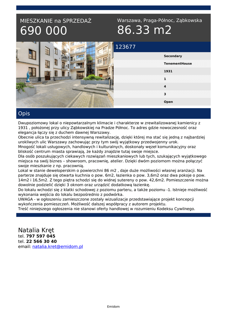 MIESZKANIE na SPRZEDAŻ 690 000 Warszawa, Praga-Północ, Ząbkowska 86.33 m2 123677 Secondary TenementHouse 1931 1 4 3 Open Opis Dwupoziomowy lokal o niepowtarzalnym klimacie i charakterze w zrewitalizowanej kamienicy z 1931 , położonej przy ulicy Ząbkowskiej na Pradze Północ. To adres gdzie nowoczesność oraz elegancja łączy się z duchem dawnej Warszawy. Obecnie ulica ta przechodzi intensywną rewitalizację, dzięki której ma stać się jedną z najbardziej urokliwych ulic Warszawy zachowując przy tym swój wyjątkowy przedwojenny urok. Mnogość lokali usługowych, handlowych i kulturalnych, doskonały węzeł komunikacyjny oraz bliskość centrum miasta sprawiają, że każdy znajdzie tutaj swoje miejsce. Dla osób poszukujących ciekawych rozwiązań mieszkaniowych lub tych, szukających wyjątkowego miejsca na swój biznes – showroom, pracownię, atelier. Dzięki dwóm poziomom można połączyć swoje mieszkanie z np. pracownią. Lokal w stanie deweloperskim o powierzchni 86 m2 , daje duże możliwości własnej aranżacji. Na parterze znajduje się otwarta kuchnia o pow. 6m2, łazienka o pow. 3,6m2 oraz dwa pokoje o pow. 14m2 i 16,5m2. Z tego piętra schodzi się do widnej sutereny o pow. 42,6m2. Pomieszczenie można dowolnie podzielić dzięki 3 oknom oraz urządzić dodatkową łazienkę. Do lokalu wchodzi się z klatki schodowej z poziomu parteru, a także poziomu -1. Istnieje możliwość wykonania wejścia do lokalu bezpośrednio z podwórka. UWAGA - w ogłoszeniu zamieszczone zostały wizualizacje przedstawiające projekt koncepcji wykończenia pomieszczeń. Możliwość dalszej współpracy z autorem projektu. Treść niniejszego ogłoszenia nie stanowi oferty handlowej w rozumieniu Kodeksu Cywilnego. Natalia Kręt tel. 797 597 045 tel. 22 566 30 40 email: [email protected] Emidom Powered by TCPDF (www.tcpdf.org)