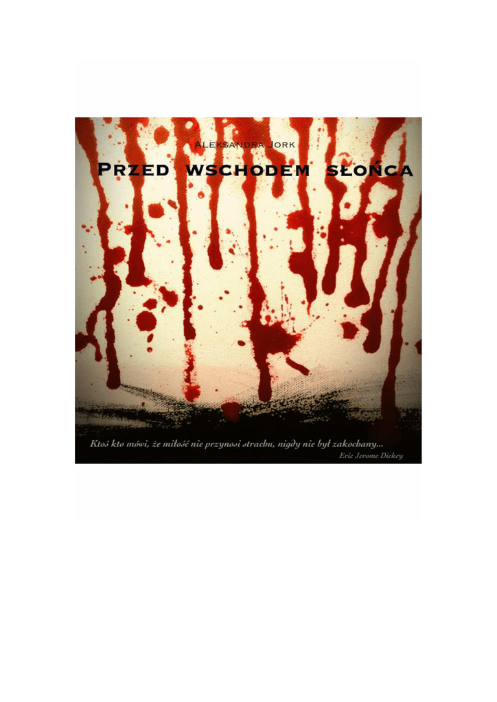 Przed wschodem słońca Autor Aleksandra Jork Od autorki Powieść ta została napisana dla samej przyjemności pisania i przelewania na papier moich niekiedy dziwacznych pomysłów. Żadne treści w niej uwzględnione nie opierają się jakichkolwiek moich wierzeniach, czy faktach. Powieść ta w całości jest historią fikcyjną i przeznaczoną dla dojrzałego, jedynie szukającego taniej rozrywki w stylu romansu fantasy czytelnika. Zaczęłam ją pisać jako młoda nastolatka publikująca posty na blogu. Teraz - po niemal sześciu latach od tego „pomysłu pisania w wolnych chwilach”, moje zdanie na wiele tematów zmieniło się, jak również spojrzenie na tę powieść. Gdyby pisanie jej nie zajęłoby mi wielu weekendów, a nawet wieczorów bądź poranków w tygodniu, oraz gdyby znaczna ilość czytelników bloga www.dead-affection.blogspot.com nie pisała do mnie maili z prośbą o wznowienie publikacji, zapewne porzuciłbym tę historię klasyfikując ją do miana „młodzieńczych bzdur”. Teraz jednak uwzględniając łatwość tworzenia ebooków i możliwość nieznacznego z nich zarobku, postanowiłam pokazać światu swoje dzieło w całości. Wszystkim Czytelnikom życzę udanej lektury! Pozdrawiam, A. Prolog “Pamiętaj także o tym, że kochałam i że to miłość skazała mnie na śmierć” - Halina Poświatowska “Ktoś, kto mówi, że miłość nie przynosi strachu, nigdy nie był zakochany” - Eric Jerome Dickey Spojrzałem na nią. Leżała otulona kołdrą, równo oddychając. Jej włosy rozsypane na poduszce tworzyły ognistą aureolę dookoła pięknej, rumianej twarzy. Jedną rękę trzymała nad głową, a dwa palce co jakiś czas lekko drgały. Przyglądałem się jej stojąc przy łóżku. Musiałem tu przyjść. Ostatni raz. Zobacz ją… pożegnać się. Usłyszeć jej oddech, poczuć ciepło ciała jeszcze jeden jedyny raz, zanim odejdę. Byłem gotów do drogi. Opuszczałem Stirling. Miałem zamiar wrócić do życia, jakie toczyłem zanim ją poznałem. Znów być anonimowym cieniem, chowającym się przed jasnością dnia… Wiedziałem, że już nigdy nie będzie jak dawniej. Jeśli jednak nie mogłem być z nią, pozostawało mi tylko udać się jak najdalej. Teraz już mnie nie potrzebuje. Ma swojego nowego obrońcę - człowieka, który jest w stanie zapewnić jej prawdziwe szczęście. Ja mogłem podarować jej tylko ból. Żałowałem, że tak późno to zrozumiałem. Zrobiłem nieśmiały krok w stronę łóżka. Nachyliłem się nad nią czując jeszcze wyraźniej zapach jej włosów, ciała. Słodki, podniecający… zakazany. Zacisnąłem powieki. Błagam, ostatni jej dotyk… Dotknąłem wargami jej czoła. Odsunąłem się na kilka milimetrów, otwierając oczy. Taka piękna… wspaniała. Przesunąłem wzrok na jej usta. Ostatni raz poczuć ich smak… Powoli dotknąłem jej warg. Pod lekkim naciskiem rozwarły się. - Will… Poderwałem się z miejsca jak rażony prądem. Nie, nie może się obudzić! Szybko jednak zdałem sobie sprawę, że wciąż śpi. Zacisnąłem mocno dłonie. Najwyższy czas odejść. - William… - kolejny szept, a za nim dreszcz przebiegający całe moje ciało. Poruszyła się, odrzucając na bok kołdrę. Z jękiem zauważyłem, że ma na sobie tylko krótką koszulę nocną. Mimowolnie zrobiłem krok w jej stronę. Instynkt chciał zapanować nad ciałem. Tym razem jednak prowadził mnie nie głód krwi, lecz najczystsza żądza. Siłą woli zatrzymałem się w miejscu. Nie… Nie mogę! Skomlałem w myślach, starając się panować nad sobą i nie patrzeć na jej ciało. - William… Opuściła rękę, nieświadomie przejeżdżając nią wzdłuż szyi, piersi… Nie-e… Błagam… Ostatkami sił utrzymywałem się w miejscu. - Will… - jej szept brzmiał jak jęk. Jakby mnie błagała… Wystawiała na pokuszenie. Cholera, Lee! Umrę, jeśli cię zaraz nie dotknę! Już leżałem na niej, całując słodkie usta. Odwzajemniała pocałunki. Mimo, iż wciąż śniła, wzdychała i ciężko oddychała, wijąc się w nieukrywanej rozkoszy. Po chwili objęła mnie nogami i zaczęła gorącymi dłońmi dotykać mojego ciała. Resztką racjonalnego umysłu przerwałem podnosząc się na rękach. Nieobecnym wzrokiem spojrzałem na ścianę. Nie… Nie… Błagam, nie… Niech mnie ktoś powstrzyma… Niech… Leeya nie przestawała mnie dotykać. Błądzić dłońmi… Rozpinać moje spodnie. - Cholera, Lee! - Jęknąłem czując ogień rozpalający moją krew. Już się nie powstrzymywałem. Podciągnąłem jej koszulę, starając się dać rozkosz o jaką prosiła. Złapałem jej ręce, przytrzymując nad głową. Wszedłem w nią, ściskając dłonią poduszkę. Jęknęła otwierając oczy. Zatrzymałem się. Spojrzałem na nią, nieruchomo wyczekując. Jej twarz płonęła, po czole spływała pojedyncza kropla potu, a oczy lśniły podniecającą ekscytacją. - To tylko sen, prawda? - Wyszeptała piskliwym, nienaturalnym głosem. Wiedziałem, że powinienem powiedzieć prawdę. Przerwać, co zaczęliśmy… Jednak nie potrafiłem. - Tak. Dotykałem jej, całowałem, próbowałem… Pragnąłem zapisać każdy fragment jej ciała w pamięci. Co chwilę szeptała moje imię, ostrymi paznokciami mocno przejeżdżając po moich plecach. - William! - Krzyknęła nagle i zadrżała. Szybko stłumiłem jej jęk głębokim pocałunkiem. Od teraz trzymałem dłoń na jej ustach, kiedy głośno wzdychała. - Cii, cii… - starałem się ją uspokajać, sam tracąc rozsądek i jęcząc z każdą chwilą, gdy mocniej oplatała mnie nogami w pasie. Wcale nie pragnąłem jej krwi. Nawet nie czułem takiego głodu. Zamiast niego był inny - pragnienie jej ciała, tak silne pragnienie jej… jej całej. Ogień palący nasze ciała łączył nas w jedność. Ruchy naszych bioder przyspieszyły. Wraz z nadchodzącym spełnieniem poczułem jej oddech na policzku. - Kocham cię… tak bardzo cię kocham, Will. Tak! Od