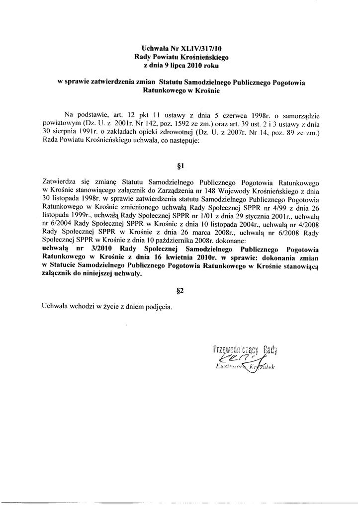 Uchwała Nr XLIV/317/10 Rady Powiatu Krośnieńskiego z dnia 9 lipca 201 O roku w sprawie zatwierdzenia zmian Statutu Samodzielnego Publicznego Pogotowia Ratunkowego w Krośnie Na podstawie, art. 12 pkt 11 ustawy z dnia 5 czerwca l 998r. o samorządzie powiatowym (Dz. U. z 200lr. Nr 142, poz. 1592 ze zm.) oraz art. 39 ust. 2 i 3 ustawy z dnia 30 sierpnia 1991r. o zakładach opieki zdrowotnej (Dz. U. z 2007r. Nr 14, poz. 89 ze zm.) Rada Powiatu Krośnieńskiego uchwala, co następuje: §1 Zatwierdza się zmianę Statutu Samodzielnego Publicznego Pogotowia Ratunkowego w Krośnie stanowiącego załącznik do Zarządzenia nr 148 Wojewody Krośnieńskiego z dnia 30 listopada 1998r. w sprawie zatwierdzenia statutu Samodzielnego Publicznego Pogotowia Ratunkowego w Krośnie zmienionego uchwałą Rady Społecznej SPPR nr 4/99 z dnia 26 listopada l 999r., uchwałą Rady Społecznej SPPR nr 1/01 z dnia 29 stycznia 2001 r., uchwałą nr 6/2004 Rady Społecznej SPPR w Krośnie z dnia I O listopada 2004r., uchwałą nr 4/2008 Rady Społecznej SPPR w Krośnie z dnia 26 marca 2008r., uchwałą nr 6/2008 Rady Społecznej SPPR w Krośnie z dnia I O października 2008r. dokonane: uchwałą nr 3/2010 Rady Społecznej Samodzielnego Publicznego Pogotowia Ratunkowego w Krośnie z dnia 16 kwietnia 2010r. w sprawie: dokonania zmian w Statucie Samodzielnego Publicznego Pogotowia Ratunkowego w Krośnie stanowiącą załącznik do niniejszej uchwały. §2 Uchwała wchodzi w życie z dniem podjęcia. Załącznik do Uchwały Nr XUV/317 /10 Rad y Pow iatu Krośnieńskiego z dnia 9 lipco 2010 roku Uchwała Nr 3 I 201 0 Rad y Społecznej iu Rat unk owy m w przy Sam odz ieln ym Pub licz nym Pog otow z dnia 16 kwi etni a 201 0 r. w sprawie~ Krośnie elne go Publ iczn ego Pogo towi a doko nani a zmia n ~· Statu cie Sam odzi Ratu nkow ego w Krośnie opie ki z dnia 30 sierp nia 199 l r. o z.akładach Na pods tawi e Ml. } 9 usL 2 1 3 ustaw y tu Statu 38 § i 37 § 89 z póź.n. zmia nam i) oraz zdro wotn ej (Dz. U. z 2007 r. Nr 14. poz. przy a eczn Społ nkow ego w Krośnie Rada Sam odzi elneg o Publ iczne go Pogo towi a Ratu ym w Krośnie uchwała co następuje: Sam odzi elny m Publ iczn ym Pogo towi u Ratu nkow wadz a Pogo towi a Ratu nkow ego w Krośnie wpro W Statu cie Sam odzi elne go Publ iczne go się następujące zmia ny: 1 w §2: 1/ punk t ! otrzy muje brnm enie : opie ki zdro wotn ej (Dz. U. z 2007 r. „usta wy z dnia 31 sierp nia 1991 r. o 1.akladach Nr 14, poz. 89 z. pófo . zmia nam i)'' 2/ punk t 2 otrzy muje brzm ienie : nych niach opie ki zdro wotn ej finan sowa „usta wy z dnia 27 sierp nia 2004 r. o świadcze i)" nam zmia . póź.n z 164, poz. 1027 ze środków publ icmy ch (Dz. U z 2008 r. Nr Ji punk t 4 otrzy muje brzm ienie : pacj enta i Rzec znik u Praw Pacj enta „ustawy z dnia 6 listo pada 2008 r. o praw ach nam i)" (Dz. U. z 2009 r. Nr 52, poz. 417 z póżn. zmia do 7. ą odpo wied nio numerację od 5 4/ doty chcz asow e punk ty od 4 do 6 otrzymuj 1. W § 9 doda je się punk ty 6 i 7 w brzm ieniu związku 1acji z nim zwiąanych. uzys kany ch w 61 zach owan ia w tajem nic) infom z. Y<ykonywaniem zawo du medy czne go. udzi elon ych zącei jego stanu z.drn wia oraz 71 dostępu do doku men tacji medy czne j dotyc mu świadczeń zdro wotn ych. 3. w § 10: ; sicr słowami „dh; · i otrzy muje on brzm ienie 1/ w punk cie 7 słowa „w pion ie" zastępuje sowy ch" ,.Sta nowi ska pracy dis ekon omic zno - finan ienie : słowami „dis' • i otrzy muje on brzm się puje zastę ie·· pion 2/ w punk cie 8 słowa „w cyjn ych i gosp odar czo „Sta now iska pracy dis tech nicz no eksp loata zaop atrze niow ych " i wpis uje się: „Kom órka bhp" 3i w punk cie 9 skreśla się słowo „Kie rowe y" ów" 4/ skreśla się punk t 11 · „Ma gazy n materiał . 4. § 40 otr.ly muje brnm enie y Statu cie mają z.astosowanie prze pisy ustaw „ W spra wach nieu regu lowa nych \-\I ej wotn zdro ki opie h y o zakładac o Państwowym Rato wnic twie Med ycrn ym. ustaw pisy prze jące iązu ptJWS7~chnie obow i przep isy wyd ane na icl1 pods ta""'i e ora7. inne praw a". Nr I do Statutu - ,.Schemat organizacyjny Samodzielnego Publicznego Pogotowia Ratunkowego w Krośnie" - otrzymuje brzmienie jak w załączeniu do niniejszej uchwały. 6. Załącznik Nr 2 do Statutu - „Wykaz jednostek opieki zdrowotnej Samodzielnego Publicznego Pogotowia Ratunkowego w Krośnie" - otrzymuje brzmienie jak w załączeniu do niniejszej uchwały. 5. Załącznik §2 Rady Społecznej do przekazania niniejszej celem zatwierdzenia zmian w Statucie. Zobowiązuje się Przewodniczącego Radzie Powiatu Krośnieńskiego Uchwały §3 Uchwała w życie wchodzi w życie z dniem podjęcia , a zmiany Statutu w niej zapisane po zatwierdzeniu przez Radę Powiatu Krośnieńskiego. wchodzą PRZEWODNIC ,ĄC'\ l111d11 S~oc;mej Sa:5fdzie«"!!.., P11bliconegq P'o.gol~~i.o ~k, e9 ·, \ \/~r~n ~ Andrfei Sz.czurek Zał~ptnik Nr 1 do S:tatu SCHEMAT ORGANIZACYJNY SAMODZIELNEGO PUBLICZNEGO POGOTOWIA RATUNKOWEGO w Krotnie DYREKTOR-~ -·--i- -- -·- --~----- . _„__ ____._.! BHP Pielęgniarka koordynująca i nadze rująca pracę As ystent Dyrektora '--·--·_J_._..,_...,.....,.._, ,_...................ou ... ' Komórka ·-·--·--·-······-·-·--·--·---------··--··1 --...l.____„_..,...._....., personel u medycznego __ „ ••. „ • Ii Samodzief ne stanowiske> dis pracownicz.ych i organizacyjnych ·--·--·-----·-............. -~--· ,_J_ ·-·-· ··· Samodzielne Stani:)Wiskci Informatyka Samodzielne stanowisko dis statystyki i analizy med. Samodzielne Stanowisko Radcy Prawnego Główny Księgowy . . __„......,_._ _ _ _........ ! _ _ . _ ._ _ _ _ _ _ _ _ ...._....__ .......... „ _,..........,.... . -,...- , !-„··----"'.··-----~------··---1-·---···~---,··-:::=::::::r::::::--::==:-=,·----"' tj l Stanowiska ds techniczno • eksploatac.)'jnyc h i gospodarczo~ zaopatrzeniowych 1 1-- BlURO WEZWAŃ I materiałój Magazyn I leków 