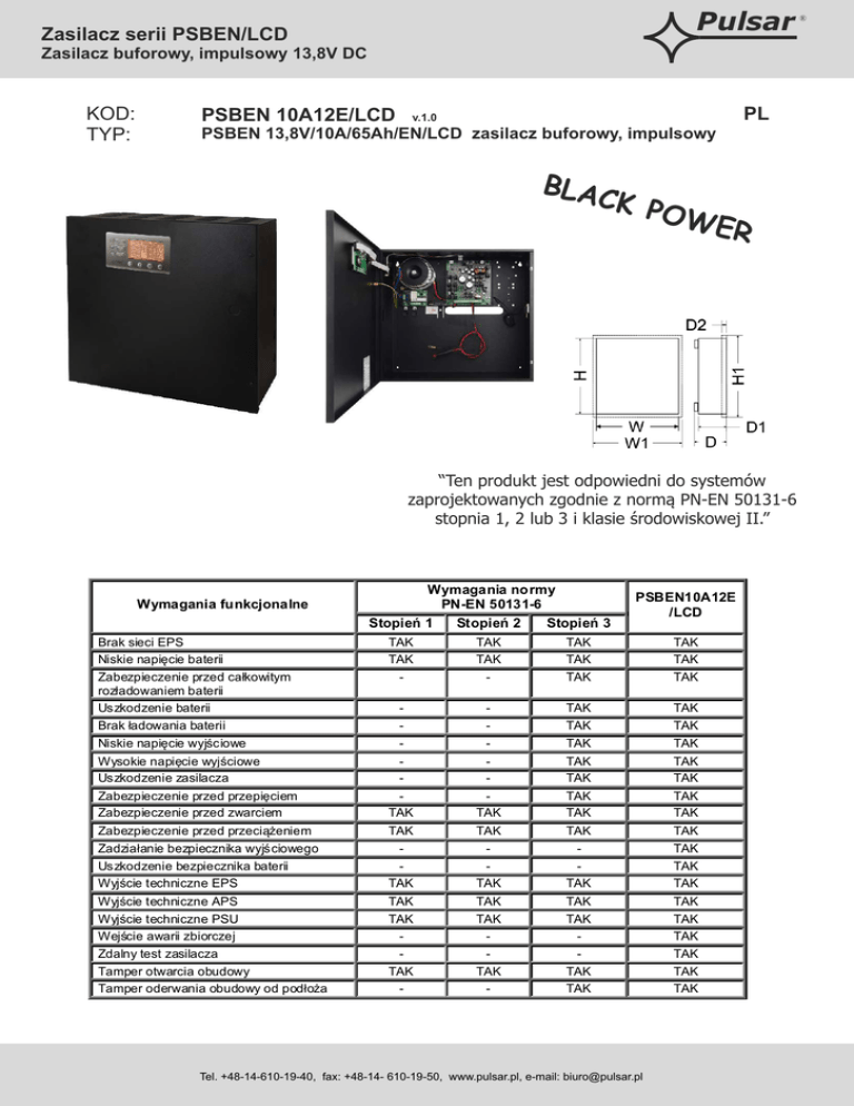 Pulsar Zasilacz serii PSBEN/LCD Zasilacz buforowy, impulsowy 13,8V DC KOD: TYP: PSBEN 10A12E/LCD PL v.1.0 PSBEN 13,8V/10A/65Ah/EN/LCD zasilacz buforowy, impulsowy BLAC K PO WER “Ten produkt jest odpowiedni do systemów zaprojektowanych zgodnie z normą PN-EN 50131-6 stopnia 1, 2 lub 3 i klasie środowiskowej II.” Wymagania funkcjonalne Wymagania normy PN-EN 50131-6 Stopień 1 Stopień 2 Stopień 3 PSBEN10A12E /LCD Brak sieci EPS Niskie napięcie baterii Zabezpieczenie przed całkowitym rozładowaniem baterii Uszkodzenie baterii TAK TAK - TAK TAK - TAK TAK TAK TAK TAK TAK - - TAK TAK Brak ładowania baterii Niskie napięcie wyjściowe Wysokie napięcie wyjściowe Uszkodzenie zasilacza Zabezpieczenie przed przepięciem Zabezpieczenie przed zwarciem Zabezpieczenie przed przeciążeniem Zadziałanie bezpiecznika wyjściowego TAK TAK - TAK TAK - TAK TAK TAK TAK TAK TAK TAK - TAK TAK TAK TAK TAK TAK TAK TAK Uszkodzenie bezpiecznika baterii Wyjście techniczne EPS Wyjście techniczne APS Wyjście techniczne PSU Wejście awarii zbiorczej Zdalny test zasilacza Tamper otwarcia obudowy Tamper oderwania obudowy od podłoża TAK TAK TAK TAK - TAK TAK TAK TAK - TAK TAK TAK TAK TAK TAK TAK TAK TAK TAK TAK TAK TAK Tel. +48-14-610-19-40, fax: +48-14- 610-19-50, www.pulsar.pl, e-mail: [email protected] ® Pulsar Zasilacz serii PSBEN/LCD Zasilacz buforowy, impulsowy 13,8V DC Cechy zasilacza: · zgodność z normą PN-EN50131-6 w stopniu 1÷3 i klasy środowiskowej II · napięcie zasilania 230VAC · bezprzerwowe zasilanie 13,8VDC · miejsce na akumulator 65Ah/12V · wysoka sprawność 80% · wydajność prądowa zasilacza: · 5,41A – dla stopnia 1 , 2 * · 2,16A – dla stopnia 3 ** · 10A – dla ogólnego zastosowania *** · niski poziom tętnień napięcia · mikroprocesorowy system automatyki · inteligentne zarządzanie wyjściowym stopniem mocy zasilacza · port szeregowy do komunikacji z komputerem poprzez program „Power security” · zdalny monitoring (opcja: WiFi, Ethernet, RS485, USB) · kontrola prądu obciążenia · kontrola napięcia wyjściowego · kontrola stanu bezpiecznika wyjściowego · dynamiczny test akumulatora · kontrola ciągłości obwodu akumulatora · kontrola napięć akumulatora · kontrola stanu bezpiecznika akumulatora · kontrola ładowania i konserwacji akumulatora · ochrona akumulatora przed nadmiernym rozładowaniem (UVP) · ochrona akumulatora przed przeładowaniem · zabezpieczenie wyjścia akumulatora przed zwarciem i odwrotnym podłączeniem · prąd ładowania akumulatora 0,6A/1,5A/2,2A/3A przełączany zworką · zdalny test zasilacza (wymagane dodatkowe moduły) · przycisk START załączenia akumulatora · przycisk STOP wyłączenia podczas pracy akumulatorowej · sygnalizacja optyczna – panel LCD · wskazania parametrów elektrycznych, np.: napięcie, prąd · sygnalizacja awarii · konfiguracja ustawień zasilacza z poziomu panelu · 3 poziomy dostępu zabezpieczone hasłami · historia pracy zasilacza · historia awarii · zegar czasu rzeczywistego z podtrzymaniem bateryjnym · optyczna sygnalizacja przeciążenia zasilacza OVL · sygnalizacja akustyczna awarii · wybór czasu sygnalizacji zaniku sieci AC · wejścia/wyjścia techniczne z izolacją galwaniczną · wejście awarii zbiorczej EXT IN · wyjście techniczne EPS sygnalizacji zaniku sieci AC · wyjście techniczne PSU sygnalizacji awarii zasilacza · wyjście techniczne APS sygnalizacji awarii akumulatora · wewnętrzna pamięć stanu pracy zasilacza · zabezpieczenia: · przeciwzwarciowe SCP · przeciążeniowe OLP · termiczne OHP · nadnapięciowe OVP · przepięciowe · antysabotażowe: otwarcie obudowy i oderwanie od podłoża · chłodzenie konwekcyjne · gwarancja - 5 lat od daty produkcji OPIS Zasilacz buforowy został zaprojektowany zgodnie z wymogami normy PN-EN 50131-6 w stopniu 1÷3 i klasie środowiskowej II. Zasilacz przeznaczony jest do nieprzerwanego zasilania urządzeń systemów alarmowych wymagających stabilizowanego napięcia 12VDC (±15%). W zależności od wymaganego stopnia zabezpieczenia systemu alarmowego w miejscu instalacji wydajność zasilacza oraz prąd ładowania akumulatora należy ustalić w sposób następujący: * Stopień 1, 2 - okres gotowości 12h Prąd wyjściowy 5,41A + 3A ładowanie akumulatora ** Stopień 3 - okres gotowości 30h jeżeli uszkodzenia podstawowego źródła zasilania są zgłaszane w alarmowym centrum odbiorczym ARC (zgodnie z 9.2 – PN-EN 50131-1). Prąd wyjściowy 2,16A + 3A ładowanie akumulatora - okres gotowości 60h jeżeli uszkodzenia podstawowego źródła zasilania nie są zgłaszane w alarmowym centrum odbiorczym ARC (zgodnie z 9.2 – PN-EN 50131-1). Prąd wyjściowy 1,08A + 3A ładowanie akumulatora *** Ogólnego zastosowania - jeżeli zasilacz nie jest montowany w instalacji spełniającej wymagania normy alarmowej wg PN-EN 50131 wówczas dopuszczalna wydajność prądowa zasilacza wynosi: 1. Prąd wyjściowy 10A + 0,6A ładowanie akumulatora 2. Prąd wyjściowy 9,1A + 1,5A ładowanie akumulatora 3. Prąd wyjściowy 8,4A + 2,2A ładowanie akumulatora 4. Prąd wyjściowy 7,6A + 3,0A ładowanie akumulatora Sumaryczny prąd odbiorników + akumulator wynosi max 10,6A W przypadku zaniku napięcia sieciowego następuje bezprzerwowe przełączenie na zasilanie akumulatorowe. Zasilacz umieszczony jest w obudowie metalowej (kolor RAL 9005 - czarny) z miejscem na akumulator 65Ah/12V. Obudowa wyposażona jest w mikroprzełączniki sygnalizujące otwarcie drzwiczek (czołówki) oraz oderwanie jej od podłoża. Tel. +48-14-610-19-40, fax: +48-14- 610-19-50, www.pulsar.pl, e-mail: [email protected] ® Pulsar Zasilacz serii PSBEN/LCD Zasilacz buforowy, impulsowy 13,8V DC DANE TECHNICZNE Typ zasilacza: Zasilanie: Pobór prądu: Moc zasilacza: Sprawność: Napięcie wyjściowe: A, stopień zabezpieczenia 1÷3, klasa środowiskowa II 230V AC 50Hz (-15%/+10%) 1,1A 146W 80% 11,0V ÷ 13,8V DC – praca buforowa 10,0V ÷ 13,8V DC – prac