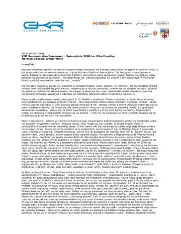 20 września 2008r. VIII Supermaraton Rowerowy – Świnoujście 2008 im. Olka Czaplika Maraton Dookoła Wyspy Wolin ~ wojtek Jeszcze niedawno stałem na starcie Trzebnickiego maratonu od którego zaczynałem ściganie w sezonie 2008, a już przyszedł czas na ostatni maraton z cyklu Pucharu Polski w Świnoujściu. Ceł był jeden - zwycięstwo w swojej kategorii. Wystarczyło przejechać 160km i już byłbym poza zasięgiem rywali. Jednak nie byłbym sobą jakbym nie powalczył do końca…. Doszedł drugi cel. Dobrze pojechać na 240km i być pierwszym w Pucharze Polski spośród wszystkich rowerów tzw. „innych”. Na maraton wyjazd w piątek ok. południa w składzie Radek, Julek, Leszek i ja (Wojtek). Do Świnoujścia trochę daleko, więc przyjeżdżamy pod wieczór, rejestracja w biurze zawodów, udanie się na miejsce noclegu i pójście na odprawę techniczną. Nocleg mamy na wyspie, a start już nie, więc organizator podał orientacje godziny kursowania promów. Wracając z odprawy co niektórzy pozwolili sobie na odrobinę luksusu ☺ . Rano ja jak zwykle mam spokój, startuje o 9:15, Radek z Leszkiem 10min wcześniej, a Jurek 5min po mnie, więc postanowili, że popłyną promem o 8:20 . Nie lubię jechać 30min przed startem i marznąć, czekać - skoro można jeszcze coś zjeść ☺ wiec planuje płynąć promem 8:40 . Widząc tempo z jakim chłopaki wybierają się na prom miałem wrażenie, że chyba się ode mnie zarazili i chcą być na starcie na ostatnią chwilę. Ze spokojem dokańczam śniadanie i udaje się na prom (wychodzę z kwatery o 8:35 wiec pędzę na prom). Dojeżdżam i widzę, że chłopaki w niebieskich strojach są na promie – miło mi, że zaczekali na mnie (jednak okazuje się że wcześniejszy prom na nich nie zaczekał). Start z Warszowa - jestem w trzeciej od końca grupie (organizator dobrał kolejność startu wg kolejności wpłat – nie powiem, oryginalny pomysł . Pogoda niezła, choć mogło by być cieplej. W mojej grupie widzę 3 potencjalnych kompanów do wspólnej jazdy. Z linii startu nikt się nie kwapi do jazdy więc daje długie zmiany narzucając tempo. Jakoś jedziemy niestety przy podjazdach zaczynających się za Międzyzdrojami pozostaje tylko z kolega z Gorzowa. Chłopak tłumaczy, że nie wie ile pociągnie bo wczoraj miał 390 C i leżał w łóżku, ale dajemy rade. Ostre tempo, mijam Leszka który dzielnie jedzie. Na odcinku z Międzywodzia do Wolina trochę wieje w plecy, prędkość nie spada poniżej 40km/h. We dwójkę dojeżdżamy do bufetu gdzie widzę Radka. Dołącza do nas i przez chwilę jedziemy w trójkę. Nagle nadjeżdża pociąg ☺ więc podczepiam swój wagonik do niego. Na liczniku ok. 40km/h, a jedziemy delikatnie pod wiatr. Myślę sobie dam radę, choćby te 25km do końca pierwszej pętli. Żeby nie być pasożytem, zaczynam współpracować z kolektywem. Wychodzę na zmianę i daje ostro. Po każdej zmianie co dziwne jestem trochę zgrzany. Odpuszczam dwie kolejki i znowu (masochista) i tak do czasu gdy 10km przed końcem pętli pytam „na ile wy jedziecie?” i słyszę „na 80km!”. No więc wszystko jasne. Postanawiam, że nie będę się wypruwał na ich dobry wynik i pojadę sobie z tyłu. Kończąc pierwszą pętle mijam z przeciwka głównego rywala – który jedzie na swojej ziem, patrzę na licznik i szacuje dystans – mam przewagę. Przed końcem pętli opróżniam bidony i szykuje się na tankowanie. Przejeżdżam bramkę zatrzymuje się, pytam gdzie bufet i słyszę że 100m przed bramką (nie będę się cofał pod górkę by napełnić bidon – organizatorom gratuluje pomysły). Więc pada „marchewka” i jadę dalej z pustym bakiem. Pierwsza pętla ze średnią ok. 36km/h, drugą jadę już sam, wpadam w swój rytm i mijam kolejnych uczestników. W Międzyzdrojach bufet. Tam biorę wodę w bidony, drożdżówkę i jadę dalej. Po paru km mijam kolarza w pomarańczowym stroju Rabobanku – twarz znajoma Piotr Ambroziak – organizator maratonu w Iławie (który uratował mi tyłek pożyczając swój kask bez którego nie mógłbym wystartować). Rzuca hasło „popracujemy” , więc pracujemy po dwóch zmianach każe mi jechać, bo on już się wypalił na pierwszej pętli i nie da rady w tym tempie jechać chyba, że nie mam nic przeciwko to on pojedzie mi na kole. Oczywiście, że nic przeciwko nie miałem. On pożyczył mi kask, więc teraz mogę spłacić dług. Tempo ok. 38km/h po paru minutach podjeżdża do mnie i mówi zdyszany „nieźle zapierdalasz” (nie powiem miło jest usłyszeć takie słowa), jednak po chwili Piotrek każe mi jechać, bo nie daje rady. Udaje mi się go namówić na jeszcze parę kilometrów. Na pięć km przed bufetem w Wolinie znów mi chce odpuścić więc krzyczę „jeszcze 2km do bufetu - dasz rade” . Małe kłamstwo z tymi kilometrami do bufetu, ale lepiej słyszeć 2 niż 5. Na bufecie dziękuje mi za dowiezienie (patrząc na to jak się zmęczył zastanawiałem się czy czem zamiast pomóc nie zaszkodziłem), woła mnie i daje mi coś co jak mówi przynosi szczęście. Wsadzam talizman do kieszeni i ruszam samotnie na końcowe 25km drugiej pętli. Kończąc druga pętle znów mijam z przeciwka konkurenta który wyjeżdża na trzecie okrążenie, więc spoglądam na zegarek i widzę że przewaga znacznie rośnie. Na początku ostatniego okrążenia dojeżdżam do jednego kolarza - pracujemy razem ok. 5km jednak na górkach za bufetem znów zostaje sam. Jadę jak automat, mimo że w kategorii miejsce już mam pierwsze, walczę o najlepszy wynik. Średnia prędkość trochę spada oscyluje ok. 33km/h. I dużo i mało ale jak na jazdę w pojedynkę jestem zadowolony. Walczę z wiatrem na drugiej połowie okrążenia, ostatnie kilometry zaciskam zęby i daje z siebie wszystko, może uda się jeszcze kogoś wyprzedzić. Przejeżdżam linie mety i widzę czas 7:18 – średnia niespełna 33km/h. Zmęczony ale zadowolony. Ostatni marato