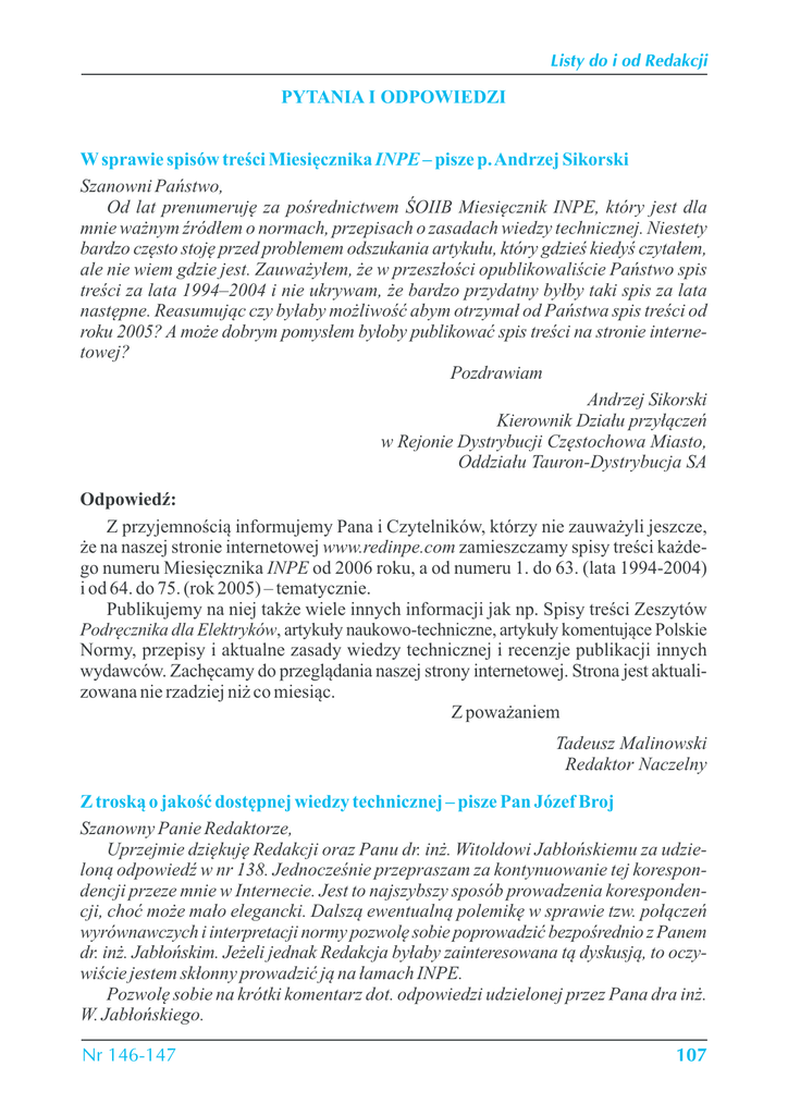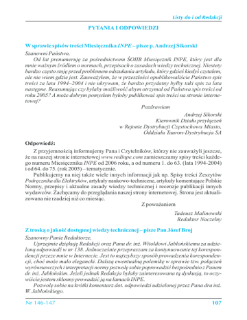 Listy do i od Redakcji PYTANIA I ODPOWIEDZI W sprawie spisów treści Miesięcznika INPE – pisze p. Andrzej Sikorski Szanowni Państwo, Od lat prenumeruję za pośrednictwem ŚOIIB Miesięcznik INPE, który jest dla mnie ważnym źródłem o normach, przepisach o zasadach wiedzy technicznej. Niestety bardzo często stoję przed problemem odszukania artykułu, który gdzieś kiedyś czytałem, ale nie wiem gdzie jest. Zauważyłem, że w przeszłości opublikowaliście Państwo spis treści za lata 1994–2004 i nie ukrywam, że bardzo przydatny byłby taki spis za lata następne. Reasumując czy byłaby możliwość abym otrzymał od Państwa spis treści od roku 2005? A może dobrym pomysłem byłoby publikować spis treści na stronie internetowej? Pozdrawiam Andrzej Sikorski Kierownik Działu przyłączeń w Rejonie Dystrybucji Częstochowa Miasto, Oddziału Tauron-Dystrybucja SA Odpowiedź: Z przyjemnością informujemy Pana i Czytelników, którzy nie zauważyli jeszcze, że na naszej stronie internetowej www.redinpe.com zamieszczamy spisy treści każdego numeru Miesięcznika INPE od 2006 roku, a od numeru 1. do 63. (lata 1994-2004) i od 64. do 75. (rok 2005) – tematycznie. Publikujemy na niej także wiele innych informacji jak np. Spisy treści Zeszytów Podręcznika dla Elektryków, artykuły naukowo-techniczne, artykuły komentujące Polskie Normy, przepisy i aktualne zasady wiedzy technicznej i recenzje publikacji innych wydawców. Zachęcamy do przeglądania naszej strony internetowej. Strona jest aktualizowana nie rzadziej niż co miesiąc. Z poważaniem Tadeusz Malinowski Redaktor Naczelny Z troską o jakość dostępnej wiedzy technicznej – pisze Pan Józef Broj Szanowny Panie Redaktorze, Uprzejmie dziękuję Redakcji oraz Panu dr. inż. Witoldowi Jabłońskiemu za udzieloną odpowiedź w nr 138. Jednocześnie przepraszam za kontynuowanie tej korespondencji przeze mnie w Internecie. Jest to najszybszy sposób prowadzenia korespondencji, choć może mało elegancki. Dalszą ewentualną polemikę w sprawie tzw. połączeń wyrównawczych i interpretacji normy pozwolę sobie poprowadzić bezpośrednio z Panem dr. inż. Jabłońskim. Jeżeli jednak Redakcja byłaby zainteresowana tą dyskusją, to oczywiście jestem skłonny prowadzić ją na łamach INPE. Pozwolę sobie na krótki komentarz dot. odpowiedzi udzielonej przez Pana dra inż. W. Jabłońskiego. Nr 146-147 107 Listy do i od Redakcji 1. Bardzo cenię sobie wypowiedzi i interpretacje Pana dra inż. W. Jabłońskiego w sprawie ochrony przeciwporażeniowej. Często również uczestniczę w sympozjach organizowanych przez SEP z jego udziałem. 2. W odpowiedzi na moje pytanie Pan dr inż. W. Jabłoński krytycznie wypowiada się na temat tłumaczenia normy z j. angielskiego na j. polski. Nie jest to pierwszy przypadek takiej lub podobnej w treści interpretacji przepisów względem normy. Podobne wypowiedzi składał również Pan dr inż. E. Musiał. Pytanie zatem brzmi następująco: czy to jest wystarczająco dobry sposób na wyjaśnienie wątpliwości, mając na względzie to, że normy różnej jakości są ogólnie dostępne, natomiast wydawane przez Waszą Redakcję bardzo cenne biuletyny INPE – niestety są w nakładzie tylko 5 500 egz. Spodziewam się tu ogromnej „dziury” na drodze w dotarciu do osób zajmujących się tymi zagadnieniami, co mogę potwierdzić w swojej codziennej praktyce (od 40 lat). Z wyrazami szacunku Józef Broj Odpowiedź: Chętnie zwiększylibyśmy nakład czasopisma, gdyby wzrosło zapotrzebowanie. Niestety na to się nie zanosi. Powszechny spadek czytelnictwa, niedocenianie skutków dynamicznej dezaktualizacji wiedzy technicznej i potrzeby ustawicznego doskonalenia zawodowego (poprzez szkolenie i samokształcenie) zarówno przez kierownictwo firm, jak i ich pracowników składają się na opisaną przez Pana rzeczywistość. Z nadzieją, że krytyczne wypowiedzi i artykuły dra W. Jabłońskiego i innych autorów ustrzegą uważnych Czytelników przed błędami w projektowaniu, wykonawstwie, czy też eksploatacji instalacji i urządzeń elektrycznych publikujemy je w Miesięczniku INPE i udostępniamy na naszej stronie internetowej www.redinpe.com. Zamieszczamy w nich także artykuły upowszechniające aktualne zasady wiedzy technicznej oraz opisujące błędy tłumaczeń i interpretacji norm i przepisów. (TM) O nadawaniu uprawnień eksploatacyjnych E i D, szkoleniach i nie tylko – pisze „Pablo”, zawiedziony elektryk: Od kilku lat pracuję w firmie produkującej sprzęt elektrotechniczny, jestem technikiem elektrykiem, wcześniej prowadziłem działalność gospodarczą – zajmowałem się eksploatacją i pomiarami, posiadam uprawnienia D i E. Chciałbym się odnieść do spraw, które opisuje Pan w swoich artykułach. Nigdy nie spotkałem się w swojej wieloletniej praktyce z wyłącznikami różnicowoprądowymi odłączonymi z powodu zbędnych zadziałań. Obecnie osoby przychodzące do pracy po liceum ogólnokształcącym z uprawnieniami i po szkoleniach, radzą sobie o wiele skuteczniej, przez odłączenie przewodu ochronnego... Spotykam się z tym wielokrotnie, między innymi w maszynach, w których wymieniono wyłączniki różnicowoprądowe o znamionowym prądzie zadziałania 300 mA na 30 mA, bo „nie było ochrony przeciwporażeniowej”. Argumenty, że takie wyłączniki zastosowali zawodowi projektanci, trafiają w próżnię u osób będących po szkoleniach organizowanych przed egzaminami kwalifikacyjnymi. 108 Listy do i od Redakcji Powszechne jest przekonanie, że ochrona przeciwporażeniowa jest tam gdzie są wyłączniki różnicowoprądowe 30 mA, wyłączniki o większych prądach znamionowych są uważane za wyłączniki przeciwpożarowe. Kilka lat temu znajomy – osoba w starszym wieku, prowadzący sporą firmę elektroinstalacyjną – wyznał mi pod wrażeniem „różnicówek”, że w Polsce przez 30 lat nie było ochrony przeciwporażeniowej. s