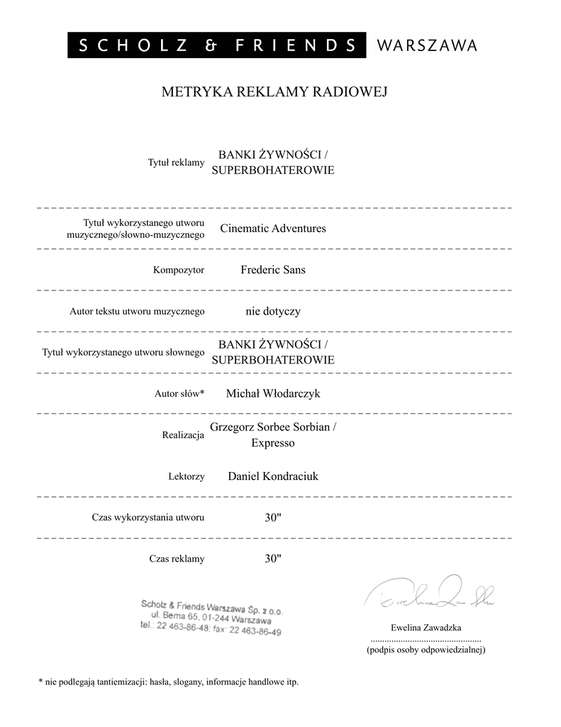 METRYKA REKLAMY RADIOWEJ Tytuł reklamy Tytuł wykorzystanego utworu muzycznego/słowno-muzycznego Kompozytor Autor tekstu utworu muzycznego Tytuł wykorzystanego utworu słownego Autor słów* Realizacja Lektorzy BANKI ŻYWNOŚCI / SUPERBOHATEROWIE Cinematic Adventures Frederic Sans nie dotyczy BANKI ŻYWNOŚCI / SUPERBOHATEROWIE Michał Włodarczyk Grzegorz Sorbee Sorbian / Expresso Daniel Kondraciuk Czas wykorzystania utworu 30" Czas reklamy 30" Ewelina Zawadzka ................................................ (podpis osoby odpowiedzialnej) * nie podlegają tantiemizacji: hasła, slogany, informacje handlowe itp.