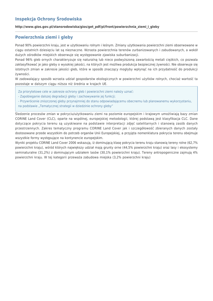 Inspekcja Ochrony Środowiska http://www.gios.gov.pl/stansrodowiska/gios/get_pdf/pl/front/powierzchnia_ziemi_i_gleby Powierzchnia ziemi i gleby Ponad 90% powierzchni kraju, jest w użytkowaniu rolnym i leśnym. Zmiany użytkowania powierzchni ziemi obserwowane w ciągu ostatnich dziesięciu lat są nieznaczne. Wzrasta powierzchnia terenów zurbanizowanych i zabudowanych, a wokół dużych ośrodków miejskich obserwuje się występowanie zjawiska suburbanizacji. Ponad 96% gleb ornych charakteryzuje się naturalną lub nieco podwyższoną zawartością metali ciężkich, co pozwala zaklasyfikować je jako gleby o wysokiej jakości, na których jest możliwa produkcja bezpiecznej żywności. Nie obserwuje się istotnych zmian w zakresie jakości gleb, które w sposób znaczący mogłyby wpłynąć na ich przydatność do produkcji żywności. W zadowalający sposób wzrasta udział gospodarstw ekologicznych w powierzchni użytków rolnych, chociaż wartość ta pozostaje w dalszym ciągu niższa niż średnia w krajach UE. Za priorytetowe cele w zakresie ochrony gleb i powierzchni ziemi należy uznać: - Zapobieganie dalszej degradacji gleby i zachowywanie jej funkcji; - Przywrócenie zniszczonej gleby przynajmniej do stanu odpowiadającemu obecnemu lub planowanemu wykorzystaniu, na podstawie „Tematycznej strategii w dziedzinie ochrony gleby” Śledzenie procesów zmian w pokryciu/użytkowaniu ziemi na poziomie europejskim i krajowym umożliwiają bazy zmian CORINE Land Cover (CLC), oparte na wspólnej, europejskiej metodologii, której podstawą jest klasyfikacja CLC. Dane dotyczące pokrycia terenu są uzyskiwane na podstawie interpretacji zdjęć satelitarnych i stanowią zasób danych przestrzennych. Zakres tematyczny programu CORINE Land Cover jak i szczegółowość zbieranych danych zostały dostosowane przede wszystkim do potrzeb organów Unii Europejskiej, a przyjęta nomenklatura pokrycia terenu obejmuje wszystkie formy występujące na kontynencie europejskim. Wyniki projektu CORINE Land Cover 2006 wskazują, iż dominującą klasę pokrycia terenu kraju stanowią tereny rolne (62,7% powierzchni kraju), wśród których największy udział mają grunty orne (44,5% powierzchni kraju) oraz lasy i ekosystemy seminaturalne (31,2%) z dominującym udziałem lasów (30,1% powierzchni kraju). Tereny antropogeniczne zajmują 4% powierzchni kraju. W tej kategorii przeważa zabudowa miejska (3,2% powierzchni kraju)