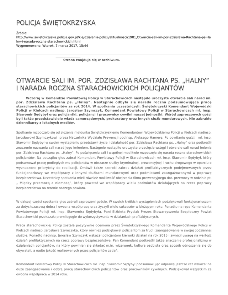 POLICJA ŚWIĘTOKRZYSKA Źródło: http://www.swietokrzyska.policja.gov.pl/kie/dzialania-policji/aktualnosci/1981,Otwarcie-sali-im-por-Zdzislawa-Rachtana-ps-Ha lny-i-narada-roczna-starachowickich.html Wygenerowano: Wtorek, 7 marca 2017, 15:44 Strona znajduje się w archiwum. OTWARCIE SALI IM. POR. ZDZISŁAWA RACHTANA PS. „HALNY” I NARADA ROCZNA STARACHOWICKICH POLICJANTÓW Wczoraj w Komendzie Powiatowej Policji w Starachowicach nastąpiło uroczyste otwarcie sali narad im. por. Zdzisława Rachtana ps. „Halny”. Następnie odbyła się narada roczna podsumowująca pracę starachowickich policjantów za rok 2014. W spotkaniu uczestniczyli: Świętokrzyski Komendant Wojewódzki Policji w Kielcach nadinsp. Jarosław Szymczyk, Komendant Powiatowy Policji w Starachowicach mł. insp. Sławomir Sędybył oraz policjantki, policjanci i pracownicy cywilni naszej jednostki. Wśród zaproszonych gości byli także przedstawiciele władz samorządowych, prokuratury oraz innych służb mundurowych. Nie zabrakło dziennikarzy z lokalnych mediów. Spotkanie rozpoczęło się od złożenia meldunku Świętokrzyskiemu Komendantowi Wojewódzkiemu Policji w Kielcach nadinsp. Jarosławowi Szymczykowi przez Naczelnika Wydziału Prewencji podinsp. Aleksego Hamerę. Po powitaniu gości, mł. insp. Sławomir Sędybył w swoim wystąpieniu przedstawił życie i działalność por. Zdzisława Rachtana ps. „Halny” oraz podkreślił znaczenie nazwania sali narad jego imieniem. Następnie nastąpiło uroczyste przecięcie wstęgi i otwarcie sali narad imienia por. Zdzisława Rachtana ps. „Halny”. Po poświęceniu sali i wspólnej modlitwie rozpoczęła się narada roczna starachowickich policjantów. Na początku głos zabrał Komendant Powiatowy Policji w Starachowicach mł. insp. Sławomir Sędybył, który podsumował pracę podległych mu policjantów w obszarze służby kryminalnej, prewencyjnej i ruchu drogowego w oparciu o wyznaczone priorytety do realizacji. Omówił także szeroki zakres działań profilaktycznych podejmowanych przez funkcjonariuszy we współpracy z innymi służbami mundurowymi oraz podmiotami zaangażowanymi w poprawę bezpieczeństwa. Uczestnicy spotkania mieli również możliwość obejrzenia filmu prewencyjnego dot. przemocy w rodzinie pt. „ Między przemocą a niemocą”, który powstał we współpracy wielu podmiotów działających na rzecz poprawy bezpieczeństwa na terenie naszego powiatu. W dalszej części spotkania głos zabrali zaproszeni goście. W swoich krótkich wystąpieniach podziękowali funkcjonariuszom za dotychczasową dobrą i owocną współpracę oraz życzyli wielu sukcesów w bieżącym roku. Ponadto na ręce Komendanta Powiatowego Policji mł. insp. Sławomira Sędybyła, Pani Elżbieta Pryciak Prezes Stowarzyszenia Bezpieczny Powiat Starachowicki przekazała promilogogle do wykorzystywania w działaniach profilaktycznych. Praca starachowickiej Policji została pozytywnie oceniona przez Świętokrzyskiego Komendanta Wojewódzkiego Policji w Kielcach nadinsp. Jarosława Szymczyka, który również podziękował policjantom za trud i zaangażowanie w swojej codziennej służbie. Ponadto nadinsp. Jarosław Szymczyk wskazał policjantom kierunki działań na rok 2015 i zwrócił uwagę na wartość działań profilaktycznych na rzecz poprawy bezpieczeństwa. Pan Komendant podkreślił także znaczenie profesjonalizmu w działaniach policjantów, na który powinien się składać m.in. wizerunek, kultura osobista oraz sposób odnoszenia się do obywateli, a nadto jakość realizowanych przez policjantów zadań. Komendant Powiatowy Policji w Starachowicach mł. insp. Sławomir Sędybył podsumowując odprawę jeszcze raz wskazał na duże zaangażowanie i dobrą pracę starachowickich policjantów oraz pracowników cywilnych. Podziękował wszystkim za owocna współpracę w 2014 roku. opr.M.K. źródło: KPP w Starachowicach Ocena: 5/5 (1) Tweetnij