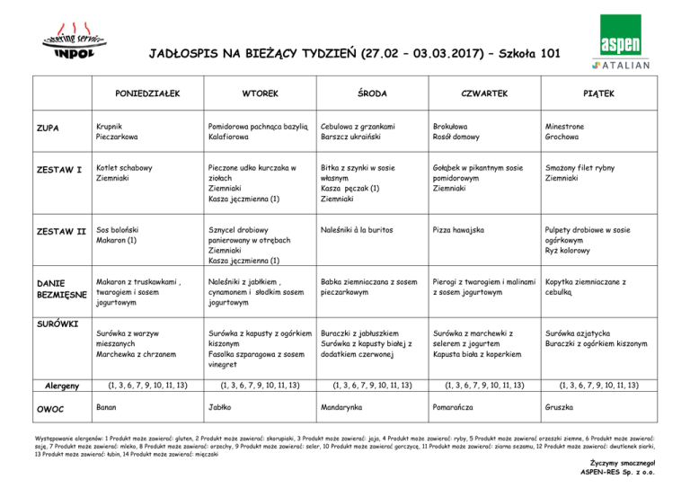 JADŁOSPIS NA BIEŻĄCY TYDZIEŃ (27.02 – 03.03.2017) – Szkoła 101 PONIEDZIAŁEK WTOREK ŚRODA CZWARTEK PIĄTEK ZUPA Krupnik Pieczarkowa Pomidorowa pachnąca bazylią Kalafiorowa Cebulowa z grzankami Barszcz ukraiński Brokułowa Rosół domowy Minestrone Grochowa ZESTAW I Kotlet schabowy Ziemniaki Pieczone udko kurczaka w ziołach Ziemniaki Kasza jęczmienna (1) Bitka z szynki w sosie własnym Kasza pęczak (1) Ziemniaki Gołąbek w pikantnym sosie pomidorowym Ziemniaki Smażony filet rybny Ziemniaki ZESTAW II Sos boloński Makaron (1) Sznycel drobiowy panierowany w otrębach Ziemniaki Kasza jęczmienna (1) Naleśniki à la buritos Pizza hawajska Pulpety drobiowe w sosie ogórkowym Ryż kolorowy DANIE BEZMIĘSNE Makaron z truskawkami , twarogiem i sosem jogurtowym Naleśniki z jabłkiem , cynamonem i słodkim sosem jogurtowym Babka ziemniaczana z sosem pieczarkowym Pierogi z twarogiem i malinami z sosem jogurtowym Kopytka ziemniaczane z cebulką Surówka z warzyw mieszanych Marchewka z chrzanem Surówka z kapusty z ogórkiem kiszonym Fasolka szparagowa z sosem vinegret Buraczki z jabłuszkiem Surówka z kapusty białej z dodatkiem czerwonej Surówka z marchewki z selerem z jogurtem Kapusta biała z koperkiem Surówka azjatycka Buraczki z ogórkiem kiszonym SURÓWKI Alergeny OWOC (1, 3, 6, 7, 9, 10, 11, 13) Banan (1, 3, 6, 7, 9, 10, 11, 13) Jabłko (1, 3, 6, 7, 9, 10, 11, 13) Mandarynka (1, 3, 6, 7, 9, 10, 11, 13) Pomarańcza (1, 3, 6, 7, 9, 10, 11, 13) Gruszka Występowanie alergenów: 1 Produkt może zawierać: gluten, 2 Produkt może zawierać: skorupiaki, 3 Produkt może zawierać: jaja, 4 Produkt może zawierać: ryby, 5 Produkt może zawierać orzeszki ziemne, 6 Produkt może zawierać: soję, 7 Produkt może zawierać: mleko, 8 Produkt może zawierać: orzechy, 9 Produkt może zawierać: seler, 10 Produkt może zawierać gorczycę, 11 Produkt może zawierać: ziarna sezamu, 12 Produkt może zawierać: dwutlenek siarki, 13 Produkt może zawierać: łubin, 14 Produkt może zawierać: mięczaki Życzymy smacznego! ASPEN-RES Sp. z o.o.