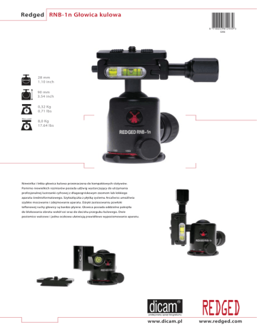 Redged RNB-1n Głowica kulowa EAN 28 mm 1.10 inch 90 mm 3.54 inch 0,32 Kg 0.71 lbs Max. Load 8,0 Kg 17.64 lbs Niewielka i lekka głowica kulowa przeznaczona do kompaktowych statywów. Pomimo niewielkich rozmiarów posiada udźwig wystarczający do utrzymania profesjonalnej lustrzanki cyfrowej z długoogniskowym zoomem lub lekkiego aparatu średnioformatowego. Szykozłączka z płytką systemu ArcaSwiss umożliwia szybkie mocowanie i zdejmowanie aparatu. Dzięki zastosowaniu powłoki teflonowej ruchy głowicy są bardzo płynne. Głowica posiada oddzielne pokrętła do blokowania obrotu wokół osi oraz do docisku przegubu kulowego. Dwie poziomice walcowe i jedna oczkowa ułatwiają prawidłowe wypoziomowanie aparatu. ® www.dicam.pl www.redged.com