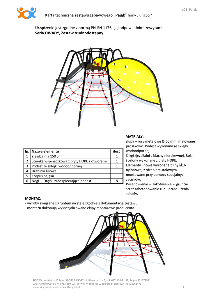 o03_Pająk Karta techniczna zestawu zabawowego „Pająk” firmy „Ringpol” Urządzenie jest zgodne z normą PN-EN 1176 i jej odpowiednimi zeszytami. Seria OWADY, Zestaw trudnodostępny lp. 1 2 3 4 5 6 Nazwa elementu Zjeżdżalnia 150 cm Ścianka wspinaczkowa z płyty HDPE z otworami Podest ze sklejki wodoodpornej Drabinki linowe Korpus pająka Nogi + Drążki zabezpieczające podest ilość 1 1 1 1 1 8 MATRIAŁY: Słupy – rury metalowe Ø 60 mm, malowane proszkowo. Podest wykonany ze sklejki wodoodpornej. Ślizgi zjeżdżalni z blachy nierdzewnej. Boki i osłony wykonane z płyty HDPE. Elementy linowe wykonane z liny Ø16 nylonowej z rdzeniem stalowym, montowane przy pomocy specjalnych zacisków. Posadowienie – zakotwienie w gruncie przez zabetonowanie rur – przedłużenia odnóży. MONTAŻ: - wyroby związane z gruntem na stałe zgodnie z dokumentacją zestawu, - montażu dokonują wyspecjalizowane ekipy montażowe producenta. RINGPOL Waldemar Kubiak, 38-540 ZAGÓRZ, ul. Bieszczadzka 5; NIP 687-100-21-52, Regon 371179951 Dział handlowy: tel.: +48 783 250 105, serwis: +48608455028; biuro projektów: +48502961473 www. ringpol.pl, mail: [email protected] 1 o03_Pająk Karta techniczna zestawu zabawowego „Pająk” firmy „Ringpol” DANE TECHNICZNE: - Grupa wiekowa do 13 lat - Gabaryty urządzenia 4,45 x 5,9 m - Strefa funkcjonowania 7,73 x 8,45 m - Wysokośd maksymalna ~ 2,27 m - Wysokośd podestów 1,5m - Głębokośd posadowienia -0,7 m - Wysokośd swobodnego upadku ≤ 1,9 m Uwaga: należy unikad południowej ekspozycji zjeżdżalni metalowych. INSTRUKCJA UŻYTKOWANIA: Urządzenie przeznaczone jest do montażu na przestrzeni ogólnodostępnej. Zestaw zabawowy jest trudnodostępny dla wszystkich grup wiekowych Wiek użytkowników mogących korzystad samodzielnie z urządzenia powyżej 3 lat. Korzystanie z urządzenia powinno odbywad się pod nadzorem osoby dorosłej. Liczba dzieci jednocześnie przebywających na urządzeniu nie powinna przekraczad 8. Urządzenie powinno byd użytkowane zgodnie z przeznaczeniem. RINGPOL Waldemar Kubiak, 38-540 ZAGÓRZ, ul. Bieszczadzka 5; NIP 687-100-21-52, Regon 371179951 Dział handlowy: tel.: +48 783 250 105, serwis: +48608455028; biuro projektów: +48502961473 www. ringpol.pl, mail: [email protected] 2