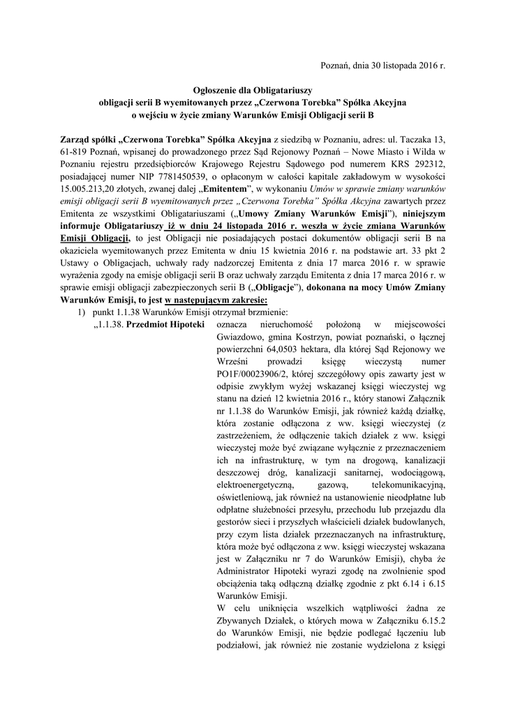 Poznań, dnia 30 listopada 2016 r. Ogłoszenie dla Obligatariuszy obligacji serii B wyemitowanych przez „Czerwona Torebka” Spółka Akcyjna o wejściu w życie zmiany Warunków Emisji Obligacji serii B Zarząd spółki „Czerwona Torebka” Spółka Akcyjna z siedzibą w Poznaniu, adres: ul. Taczaka 13, 61-819 Poznań, wpisanej do prowadzonego przez Sąd Rejonowy Poznań – Nowe Miasto i Wilda w Poznaniu rejestru przedsiębiorców Krajowego Rejestru Sądowego pod numerem KRS 292312, posiadającej numer NIP 7781450539, o opłaconym w całości kapitale zakładowym w wysokości 15.005.213,20 złotych, zwanej dalej „Emitentem”, w wykonaniu Umów w sprawie zmiany warunków emisji obligacji serii B wyemitowanych przez „Czerwona Torebka” Spółka Akcyjna zawartych przez Emitenta ze wszystkimi Obligatariuszami („Umowy Zmiany Warunków Emisji”), niniejszym informuje Obligatariuszy iż w dniu 24 listopada 2016 r. weszła w życie zmiana Warunków Emisji Obligacji, to jest Obligacji nie posiadających postaci dokumentów obligacji serii B na okaziciela wyemitowanych przez Emitenta w dniu 15 kwietnia 2016 r. na podstawie art. 33 pkt 2 Ustawy o Obligacjach, uchwały rady nadzorczej Emitenta z dnia 17 marca 2016 r. w sprawie wyrażenia zgody na emisje obligacji serii B oraz uchwały zarządu Emitenta z dnia 17 marca 2016 r. w sprawie emisji obligacji zabezpieczonych serii B („Obligacje”), dokonana na mocy Umów Zmiany Warunków Emisji, to jest w następującym zakresie: 1) punkt 1.1.38 Warunków Emisji otrzymał brzmienie: „1.1.38. Przedmiot Hipoteki oznacza nieruchomość położoną w miejscowości Gwiazdowo, gmina Kostrzyn, powiat poznański, o łącznej powierzchni 64,0503 hektara, dla której Sąd Rejonowy we Wrześni prowadzi księgę wieczystą numer PO1F/00023906/2, której szczegółowy opis zawarty jest w odpisie zwykłym wyżej wskazanej księgi wieczystej wg stanu na dzień 12 kwietnia 2016 r., który stanowi Załącznik nr 1.1.38 do Warunków Emisji, jak również każdą działkę, która zostanie odłączona z ww. księgi wieczystej (z zastrzeżeniem, że odłączenie takich działek z ww. księgi wieczystej może być związane wyłącznie z przeznaczeniem ich na infrastrukturę, w tym na drogową, kanalizacji deszczowej dróg, kanalizacji sanitarnej, wodociągową, elektroenergetyczną, gazową, telekomunikacyjną, oświetleniową, jak również na ustanowienie nieodpłatne lub odpłatne służebności przesyłu, przechodu lub przejazdu dla gestorów sieci i przyszłych właścicieli działek budowlanych, przy czym lista działek przeznaczanych na infrastrukturę, która może być odłączona z ww. księgi wieczystej wskazana jest w Załączniku nr 7 do Warunków Emisji), chyba że Administrator Hipoteki wyrazi zgodę na zwolnienie spod obciążenia taką odłączną działkę zgodnie z pkt 6.14 i 6.15 Warunków Emisji. W celu uniknięcia wszelkich wątpliwości żadna ze Zbywanych Działek, o których mowa w Załączniku 6.15.2 do Warunków Emisji, nie będzie podlegać łączeniu lub podziałowi, jak również nie zostanie wydzielona z księgi wieczystej PO1F/00023906/2, z zastrzeżeniem iż nie dotyczy to przypadku, kiedy nastąpi to w związku ze zbyciem takiej działki z zachowaniem postanowień punktów 6.14 i 6.15 Warunków Emisji.” 2) punkt 13.4 Warunków Emisji otrzymał brzmienie: „13.4 Załączniki: 13.4.1. Załącznik 1.1.38 - odpis z księgi wieczystej Przedmiotu Hipoteki; 13.4.2. Załącznik 1.1.42 – Regulamin Zgromadzenia Obligatariuszy; 13.4.3. Załącznik 6.5 – Wycena Przedmiotu Hipoteki; 13.4.4. Załącznik 6.15.2 – minimalna Cena Sprzedaży; 13.4.5. Załącznik 7 – lista działek przeznaczonych na infrastrukturę.” 3) nadano prawidłową nazwę / numerację załącznika 6.15.2 z „załącznika 6.15.12” na „załącznik 6.15.2” 4) dodano do Warunków Emisji załącznik 7 – lista działek przeznaczonych na infrastrukturę, o treści zgodnej z załącznikiem nr 2 do Umowy. Zwroty i wyrażenia pisane w niniejszym ogłoszeniu wielką literą, a w nim nie zdefiniowane mają znaczenie nadane im w warunkach emisji Obligacji.