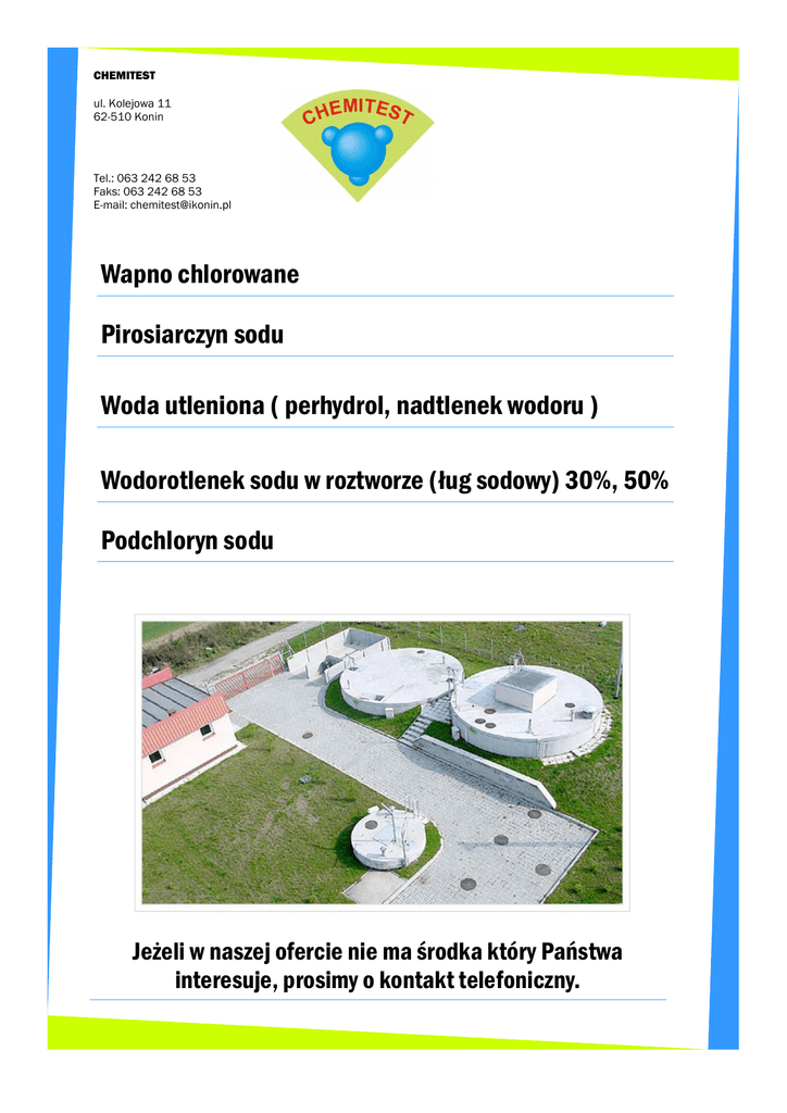 CHEMITEST ul. Kolejowa 11 62-510 Konin Tel.: 063 242 68 53 Faks: 063 242 68 53 E-mail: [email protected] Wapno chlorowane Pirosiarczyn sodu Woda utleniona ( perhydrol, nadtlenek wodoru ) Wodorotlenek sodu w roztworze (ług sodowy) 30%, 50% Podchloryn sodu Jeżeli w naszej ofercie nie ma środka który Państwa interesuje, prosimy o kontakt telefoniczny.