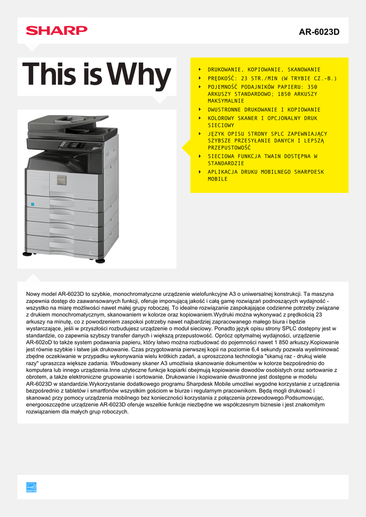 AR-6023D DRUKOWANIE, KOPIOWANIE, SKANOWANIE PRĘDKOŚĆ: 23 STR./MIN (W TRYBIE CZ.-B.) POJEMNOŚĆ PODAJNIKÓW PAPIERU: 350 ARKUSZY STANDARDOWO; 1850 ARKUSZY MAKSYMALNIE DWUSTRONNE DRUKOWANIE I KOPIOWANIE KOLOROWY SKANER I OPCJONALNY DRUK SIECIOWY JĘZYK OPISU STRONY SPLC ZAPEWNIAJĄCY SZYBSZE PRZESYŁANIE DANYCH I LEPSZĄ PRZEPUSTOWOŚĆ SIECIOWA FUNKCJA TWAIN DOSTĘPNA W STANDARDZIE APLIKACJA DRUKU MOBILNEGO SHARPDESK MOBILE Nowy model AR-6023D to szybkie, monochromatyczne urządzenie wielofunkcyjne A3 o uniwersalnej konstrukcji. Ta maszyna zapewnia dostęp do zaawansowanych funkcji, oferuje imponującą jakość i całą gamę rozwiązań podnoszących wydajność wszystko na miarę możliwości nawet małej grupy roboczej. To idealne rozwiązanie zaspokajające codzienne potrzeby związane z drukiem monochromatycznym, skanowaniem w kolorze oraz kopiowaniem.Wydruki można wykonywać z prędkością 23 arkuszy na minutę, co z powodzeniem zaspokoi potrzeby nawet najbardziej zapracowanego małego biura i będzie wystarczające, jeśli w przyszłości rozbudujesz urządzenie o moduł sieciowy. Ponadto język opisu strony SPLC dostępny jest w standardzie, co zapewnia szybszy transfer danych i większą przepustowość. Oprócz optymalnej wydajności, urządzenie AR-602oD to także system podawania papieru, który łatwo można rozbudować do pojemności nawet 1 850 arkuszy.Kopiowanie jest równie szybkie i łatwe jak drukowanie. Czas przygotowania pierwszej kopii na poziomie 6,4 sekundy pozwala wyeliminować zbędne oczekiwanie w przypadku wykonywania wielu krótkich zadań, a uproszczona technologia "skanuj raz - drukuj wiele razy" upraszcza większe zadania. Wbudowany skaner A3 umożliwia skanowanie dokumentów w kolorze bezpośrednio do komputera lub innego urządzenia.Inne użyteczne funkcje kopiarki obejmują kopiowanie dowodów osobistych oraz sortowanie z obrotem, a także elektroniczne grupowanie i sortowanie. Drukowanie i kopiowanie dwustronne jest dostępne w modelu AR-6023D w standardzie.Wykorzystanie dodatkowego programu Sharpdesk Mobile umożliwi wygodne korzystanie z urządzenia bezpośrednio z tabletów i smartfonów wszystkim gościom w biurze i regularnym pracownikom. Będą mogli drukować i skanować przy pomocy urządzenia mobilnego bez konieczności korzystania z połączenia przewodowego.Podsumowując, energooszczędne urządzenie AR-6023D oferuje wszelkie funkcje niezbędne we współczesnym biznesie i jest znakomitym rozwiązaniem dla małych grup roboczych. KOPIARKA OGÓLNE Szybkość urządzenia, tryb cz.-b. w str./min (A4): 20 Szybkość urządzenia, tryb cz.-b. w str./min (A3): 12 Format papieru: min.- maks.: A6 - A3 Gramatura papieru (g/m²): 55 - 200 Pojemność: standardowa (arkuszy): 350 Pojemność: maks. (arkuszy): 1850 Czas nagrzewania (w sekundach): 25 Pamięć ogólna min./maks. (MB): 64 - 192 Dupleks: STD Wymagania dotyczące źródła zasilania - sieciowe napięcie lokalne (Hz): 220 - 240V, 50/60Hz Pobór mocy (kW): 1,2 Wymiary (mm): 599 x 612 x 511 Waga (kg): 28,2 PODAJNIK DOKUMENTÓW Pojemność podajnika oryginałów (kartek): OPT 100 Format oryginału (maks.): A3 Czas pierwszej kopii cz.-b. (sek.): 6,4 Sorter elektroniczny (standard): Kopiowanie ciągłe (maks. kopii): 999 Rozdzielczość skanowania w trybie cz.-b. (dpi): 600 x 600 Rozdzielczość druku (dpi): 600 x 600 Gradacja (liczba odcieni) - tryb czarno-biały: 256 Zakres regulacji skali (%): 25 - 400 Zaprogramowane skale kopiowania: 10 SKANER Skaner sieciowy (std./opcja): STD Skanowanie w trybach "pull scan" i "push scan": Rozdzielczość w trybie "push scan" (dpi): 50 - 9600 Rozdzielczość w trybie "pull scan" (dpi): 75,100, 150,200, 300,400, 600 Formaty plików: TIFF, PDF, JPG, BMP Narzędzia skanera: Sharpdesk (OPT) Skanowanie na pulpit: Skanowanie do pamięci USB: DRUKARKA OPCJE WYKAŃCZANIA Rozdzielczość (dpi): 600 x 600 Drukarka sieciowa (std./opcja): Opcja Interfejs standardowy/opcjonalny: Standard: 10Base-T/100Base-TX Obsługiwane systemy operacyjne - standardowo: Windows Server 2003, Windows Server 2008, Windows Server 2008 R2, Windows Server 2012, Windows Server 2012 R2, Windows Vista, Windows 7, Windows 8, Windows 8.1, Mac OS X 10.4,10.5,10.6,10.7,10.8,10.9,10.10 Protokoły sieciowe: protokół TCP/IP Protokoły druku: LPR, Raw TCP, IPP (opcja) PDL std./opcja: Std:SPLC, PCL6 emulation, Opt: PostScript® 3 ™ emulation Dostępne czcionki: 80 fonts for PCL, 136 fonts for PostScript® 3™ emulation www.sharp.pl Powered by TCPDF (www.tcpdf.org) Maksymalna wydajność wyjściowa: 250 sheets SHARP ELECTRONICS (EUROPE) GMBH SPółKA Z O. O. ODDZIAł W POLSCE UL. POLECZKI 33 BUDYNEK A2 02-822 WARSZAWA TEL.: +48 22 545 81 00 FAKS: +48 22 545 81 00 FAKS: +48 22 545 81 05 WWW.SHARP.PL