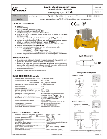 Zawór elektromagnetyczny klasa A grupa 1 bezpośredniego działania 2/2 drogowy typu Zakresy średnic przyłącze gwintowe Medium ZEA Rp 3/8 ¸ Rp 2 1/2 przyłącze kołnierzowe paliwa gazowe (gazy wg PN-EN 437) , powietrze, gazy nieagresywne CHARAKTERYSTYKA: ! ! ! ! ! ! ! ! ! ! ! ! DN 50 ¸ DN 100 1450 grzybkowy budowy zwykłej jednostopniowy, jednokierunkowy w stanie bezprądowym zamknięty -NC o stałym przepływie - wykonanie standardowe ręczna regulacja przepływu (przepustowości) - opcja na życzenie zamawiającego nie wymaga minimalnego ciśnienia różnicowego (DPmin= 0 bar) maksymalna różnica ciśnień DPmax jaka może występować na zaworze zależy od średnicy nominalnej zaworu (patrz -TABELA 1) filtr siatkowy wbudowany na stałe (za wyjątkiem ZEA-10 i ZEA-15) spełnia wymagania normy PN-EN 161 spełnia wymagania zasadnicze zawarte w Dyrektywach UE: - 90/396/EWG (gazowa) - 2006/95WE (niskonapięciowa) - 2004/108/WE (kompatybilności elektromagnetycznej) posiada certyfikat znaku bezpieczeństwa “B” wydany przez INiG Kraków Symbol funkcyjny ZASTOSOWANIE: A ! do wszelkiego rodzaju instalacji i rządzeń gazowych (np. palniki, kotły grzewcze), zasilanych z sieci o niskim ciśnieniu gazu ! wchodzą w skład tak zwanych ścieżek gazowych zasilających w/w urządzenia, gdzie pełnią rolą automatycznych zaworów odcinających klasy A - spełniają wymagania normy PN-EN 746-2 ! w układach klimatyzacji ! w układach sterowania pneumatycznego NC P Podłączenie elektryczne przyłącze cewki DANE TECHNICZNE - zawór 2 PMAX patrz TABELA 1 DPmin= 0 bar DPmax= patrz TABELA 1 PS = patrz TABELA 1 < 1s < 1s 0% ¸ 100% -10oC ¸ 60oC Rp - wewnętrzny gwint walcowy zgodny z normą PN-ISO 7-1 przyłącze rurowe kołnierzowe ....... kołnierze przyłączy [PN16, 01, B] wg normy PN-ISO 7005-1 pozycja zabudowy zaworu ............ cewką do góry dopuszczalne odchylenie od pionu - do 90O wymienna (łącznie z przyłączem) cewka elektromagnesu......... ......... wymiana cewki.............................. bez demontażu zaworu położenie cewki na zaworze .... .... dowolne (360 obrotu wokół osi) O PE ZEA - karta katalogowa L N 1 2 DC 1 1 wydanie 2/2010/KK 2 Możliwe są 4 położenia gniazda wtykowego (co 90O) AC DC 2 1 PE L N PE P Mp 2 1 max 3x1,5 230V 110V 24V 24V 12V -15%; +10% -10oC ¸ 60oC S1 ciągła złącze elektryczne trójstykowe I (uziemienie) IP54 patrz karta katalog. CEWKI F cewki zalewane żywicą 2 gniazdo wtyczkowe DANE TECHNICZNE - cewka napięcie sterujące zmienne AC(50Hz) .... stałe DC ............... zakres zmian napięcia ........... .................. temperatura otoczenia .................... ......... rodzaj pracy .............................................. przyłącze elektryczne ............................... klasa bezpieczeństwa ............ .................. stopień ochrony (wg PN-EN 60529) ......... ...... typy cewek (pozostałe dane) .......................... klasa izolacji ............................................. budowa (zintegrowana) ................................. 1 AC PG11 max 3x1,5 maksymalne ciśnienie pracy .......... ciśnienie różnicowe minimalne ...... maksymalne... bezpieczne ciśnienie statyczne ...... czas otwarcia..................... ........... czas zamknięcia ....................... .... zakres regulacji przepływu ...... ..... temperatura otoczenia i medium.. .. przyłącze rurowe gwintowe .... ...... Polaryzacja żył w przewodzie - obojętna (za wyjątkiem PE); zalecana - jak na rysunku strona 1/4 Typ zaworu DN Ciśn. różnicowe DP [bar] DPmin DPmax Rp Typ cewki PMAX PS [bar] [bar] napięcie AC(50Hz) 230V napięcie DC 110V 24V 24V 12V AC 110/25 AC 110/25 AC 110/25 AC 110/25B AC 110/25 AC 110/25B AC 110/32 AC 110/50 AC 24/25 AC 24/25 AC 24/25 AC 24/25B AC 24/25 AC 24/25B AC 24/32 AC 24/50 DC 24/25 DC 24/25 DC 24/25 DC 24/25B DC 24/25 DC 24/25B DC 24/32 DC 24/50 DC 12/25 DC 12/25 DC 12/25 DC 12/25B DC 12/25 DC 12/25B DC 12/32 DC 12/50 AC 110/50 AC 24/50 DC 24/50 DC 12/50 AC 110/80 AC 24/80 DC 24/80 DC 12/80 AC 110/50 AC 24/50 DC 24/50 DC 12/50 AC 110/80 AC 110/100 AC 110/100 AC 24/80 AC 24/100 AC 24/100 DC 24/80 DC 24/100 DC 24/100 DC 12/80 DC 12/100 DC 12/100 ZEA-80k ZEA-100k TABELA 1 zawory z przyłączem gwintowym ZEA-10 ZEA-15 10 15 3/8 1/2 0 0 ZEA-20 20 3/4 0 ZEA-25 25 1 0 ZEA-32 ZEA-40 32 40 1 1/4 1 1/2 0 0 ZEA-50 50 2 0 ZEA-65 65 65 2 1/2 0 ZEA-50k 1,20 1,20 0,26 0,35 0,17 0,30 0,14 0,25 0,14 0,20 0,25 1,20 1,20 5 5 0,35 2 0,30 2 0,14 0,25 2 2 0,20 2 0,25 2 AC 230/25 AC 230/25 AC 230/25 AC 230/25B AC 230/25 AC 230/25B AC 230/32 AC 230/50 AC 230/50 AC 230/65 AC 230/80 zawory z przyłączem kołnierzowym [PN16, 01, B] 50 0 ZEA-65k 65 ZEA-80k 80 ZEA -100k 100 0 0 0 0,14 0,20 0,25 0,11 0,11 0,20 2 0,25 0,11 0,11 2 2 2 AC 230/50 AC 230/65 AC 230/80 AC 230/100 AC 230/100 WYMIARY GABARYTOWE (mm), MASA (kg) Typ ZEA-10 ZEA-15 ZEA-20 ZEA-25 ZEA-32 ZEA-40 ZEA-50 ZEA-65 zawory z przyłączem gwintowym 15 1/2 110 121 14 147 162 41 72 93 11 1,66 20 3/4 127 138 22 153 168 77 105 93 11 1,80 25 1 136 147 28 160 175 80 115 93 11 2,05 32 1 1/4 174 195 37 207 220 101 145 100 11 4,08 40 1 1/2 195 217 43 235 255 110 180 110 11 5,80 ZEA-65k zawory z przyłączem kołnierzowym [PN16, 01, B] 50 2 205 228 41 250 270 140 193 110 11 6,40 65 2 1/2 261 301 61 318 358 170 240 130 11 14,80 P 50 65 80 100 240 260 78 245 265 165 230 110 11 7,40 286 326 83 313 353 185 270 130 11 17,15 315 355 94 335 375 200 310 145 11 23,65 340 380 103 335 375 220 350 145 11 27,10 A A C C P B DN B 10 3/8 109 120 14 145 160 41 62 93 11 1,64 (1) wymiar związany z demontażem cewki * wymiar dla zaworów z regulacją DN Rp A A* B C(1) C* E L P Pg Masa ZEA-50k L E L E WYPOSAŻENIE DODATKOWE - opcje (dostępne na życzenie zamawiającego) ! wykonania dla innych wartości napięć sterujących ! ręczna regulacja przepływu ! korki G1/8 lub G1/4 (poz. 24) wraz z uszczelkami W wykonaniu podstawowym zawory nie posiadają otworów pod korki. ! przeciwkołnierze z kró