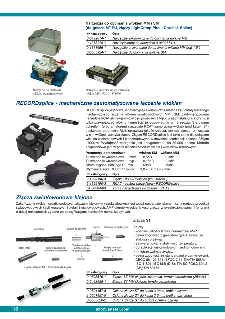Narzêdzia do obcinania w³ókien MM i SM (do gniazd MT-RJ, z³¹czy LightCrimp Plus i Corelink Splice) Nr katalogowy 0-0492674-1 0-1278219-1 0-1871696-1 0-0503924-1 Narzêdzie do obcinania w³ókna jednomodowego Opis Narzędzie ekonomiczne do obcinania włókna MM NóŜ wymienny do narzędzia 0-0492674-1 Narzędzie uniwersalne do obcinania włókna MM (kąt 1.5°) Narzędzie do obcinania włókna SM Narzêdzie uniwersalne do obcinania w³ókna MM, PN. 0-1871696 RECORDsplice - mechaniczne zautomatyzowane ³¹czenie w³ókien RECORDsplice jest now¹, innowacyjn¹ i ekonomiczn¹ metod¹ zautomatyzowanego mechanicznego ³¹czenia w³ókien œwiat³owodowych MM i SM. Zautomatyzowane narzêdzie RCAT eliminuje mo¿liwoœci pope³nienia b³êdu przez Instalatora, który musi tylko przygotowaæ w³ókno i umieœciæ je odpowiednio w narzêdziu. Sterowane pokrêt³em (programatorem) narzêdzie RCAT samo ucina w³ókno (pod k¹tem 8O doskona³e parametry RL!), sprawdza jakoœæ uciêcia, otwiera z³¹cze, umieszcza w nim w³ókno i zamyka z³¹cze. Z³¹cze RECORDsplice jest takie samo dla po³¹czeñ w³ókien wielomodowych i jednomodowych w dowolnej kombinacji os³onek 250µm i 900µm. Wydajnoœæ narzêdzia jest przygotowana na 20.000 obciêæ. Metoda po³¹czeniowa jest w pe³ni niezale¿na od zasilania i warunków terenowych. Parametry po³¹czeniowe: w³ókno SM w³ókno MM T³umiennoœæ wtr¹ceniowa IL max. 0,5dB 0,3dB T³umiennoœæ wtr¹ceniowa IL typ. 0,15dB 0,1dB Strata sygna³u odbitego RL min. 60dB 30dB Wymiary z³¹cza RECORDsplice: 3,8 x 3,8 x 46,2 mm Nr katalogowy 2-1899190-4 2-1899190-3 CB3626-000 Opis Złącze RECORDsplice (kpl. 100szt.) RCAT - zestaw narzędziowy RECORDsplice Torba narzędziowa do zestawu RCAT Z³¹cza œwiat³owodowe klejone Zakañczanie w³ókien œwiat³owodowych z³¹czami klejonymi (epoksydowymi) jest wci¹¿ najbardziej ekonomiczn¹ metod¹ produkcji œwiat³owodowych kabli krosowych i pigtaili œwiat³owodowych. AMP oferuje wysokiej jakoœci z³¹cza, z wyselekcjonowanymi ferrulami o du¿ej dok³¹dnoœci, zgodne ze specyfikacjami komitetów normalizacyjnych. Z³¹cza ST Z³¹cze klejone ST - komponenty z³¹cza 132 Nr katalogowy Opis Zalety: • wysokiej jakoœci ferrula ceramiczna AMP, • pe³na zgodnoœæ z gniazdem typu Bayonet ze stalow¹ sprê¿yn¹, • zagwarantowana stabilnoœæ temperatury, • do aplikacji wielomodowych i jednomodowych, • mniejsze zu¿ycie ¿ywicy, • pe³na zgodnoœæ ze standardami przemys³owymi: CECC 86-123-801 (BFOC 2.5); EIA/TIA 568A; ISO 11801; IEC 86B (DIS); TIA SC FO6.3 604.2 (SP); EN 50173 0-0503676-1 0-5492458-1 Złącze ST MM klejone, overmold, ferrula ceramiczna (250szt.) Złącze ST MM klejone, ferrula ceramiczna 0-0501457-8 1-0501457-0 0-5503628-2 Osłona złącza ST do kabla 3.0mm, krótka, czarna Osłona złącza ST do kabla 3.0mm, krótka, czerwona Osłona złącza ST do bufora 0.9mm, czarna [email protected]