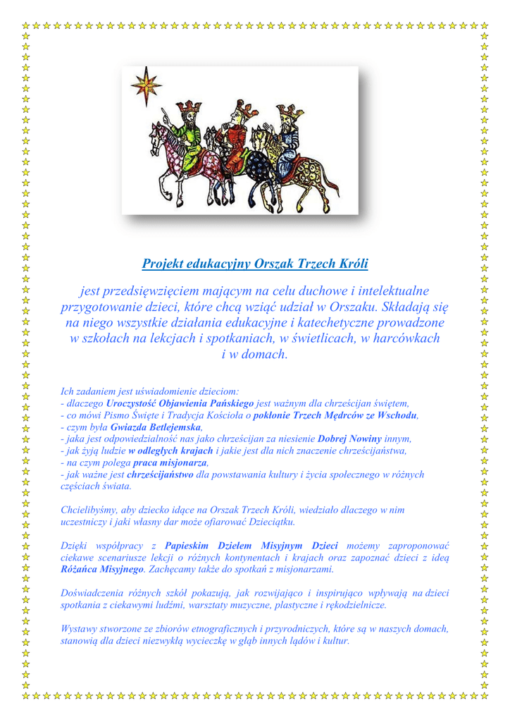Projekt edukacyjny Orszak Trzech Króli jest przedsięwzięciem mającym na celu duchowe i intelektualne przygotowanie dzieci, które chcą wziąć udział w Orszaku. Składają się na niego wszystkie działania edukacyjne i katechetyczne prowadzone w szkołach na lekcjach i spotkaniach, w świetlicach, w harcówkach i w domach. Ich zadaniem jest uświadomienie dzieciom: - dlaczego Uroczystość Objawienia Pańskiego jest ważnym dla chrześcijan świętem, - co mówi Pismo Święte i Tradycja Kościoła o pokłonie Trzech Mędrców ze Wschodu, - czym była Gwiazda Betlejemska, - jaka jest odpowiedzialność nas jako chrześcijan za niesienie Dobrej Nowiny innym, - jak żyją ludzie w odległych krajach i jakie jest dla nich znaczenie chrześcijaństwa, - na czym polega praca misjonarza, - jak ważne jest chrześcijaństwo dla powstawania kultury i życia społecznego w różnych częściach świata. Chcielibyśmy, aby dziecko idące na Orszak Trzech Króli, wiedziało dlaczego w nim uczestniczy i jaki własny dar może ofiarować Dzieciątku. Dzięki współpracy z Papieskim Dziełem Misyjnym Dzieci możemy zaproponować ciekawe scenariusze lekcji o różnych kontynentach i krajach oraz zapoznać dzieci z ideą Różańca Misyjnego. Zachęcamy także do spotkań z misjonarzami. Doświadczenia różnych szkół pokazują, jak rozwijająco i inspirująco wpływają na dzieci spotkania z ciekawymi ludźmi, warsztaty muzyczne, plastyczne i rękodzielnicze. Wystawy stworzone ze zbiorów etnograficznych i przyrodniczych, które są w naszych domach, stanowią dla dzieci niezwykłą wycieczkę w głąb innych lądów i kultur. Uczniowie z ogromną wrażliwością reagują na potrzeby dzieci z krajów misyjnych, gdy okazuje się, że oni sami mogą też odrobinę pomóc – swoją modlitwą i swoimi darami. Na tej stronie nauczyciele i animatorzy znajdą przykładowe scenariusze lekcji do pobrania oraz prezentacje ukazujące Orszak i jego przesłanie. Proponujemy też zapoznanie się z tekstami popularyzującymi wiedzę o Uroczystości Objawienia Pańskiego, w bibliotece linków.