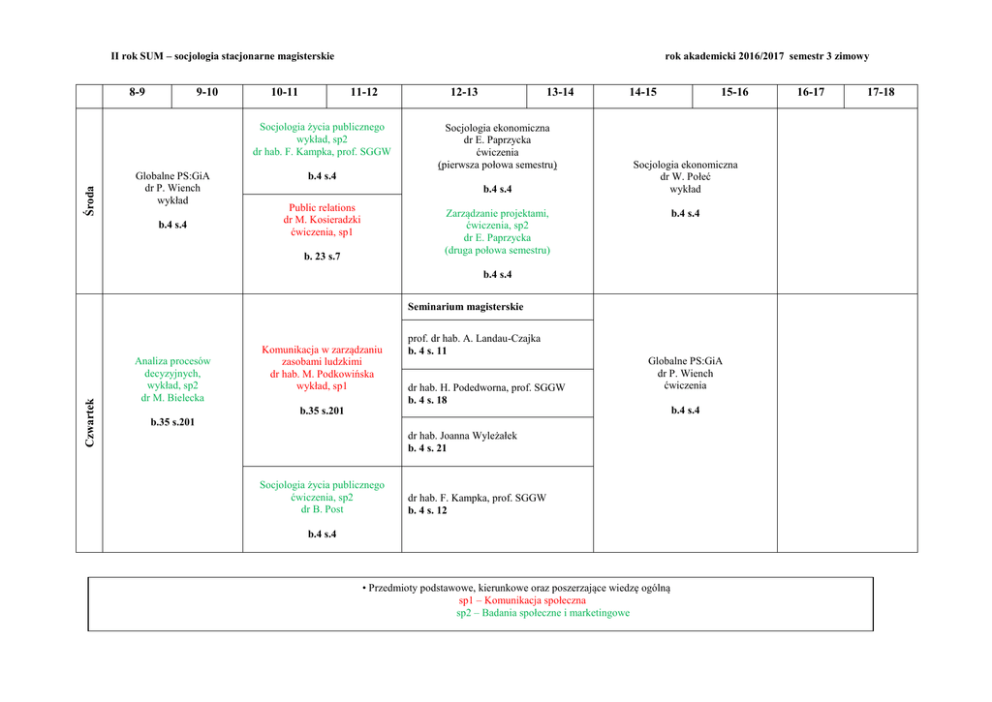 II rok SUM – socjologia stacjonarne magisterskie 8-9 9-10 10-11 rok akademicki 2016/2017 semestr 3 zimowy 11-12 Środa Socjologia życia publicznego wykład, sp2 dr hab. F. Kampka, prof. SGGW Globalne PS:GiA dr P. Wiench wykład b.4 s.4 12-13 13-14 Socjologia ekonomiczna dr E. Paprzycka ćwiczenia (pierwsza połowa semestru) b.4 s.4 b.4 s.4 Public relations dr M. Kosieradzki ćwiczenia, sp1 14-15 Socjologia ekonomiczna dr W. Połeć wykład Zarządzanie projektami, ćwiczenia, sp2 dr E. Paprzycka (druga połowa semestru) b. 23 s.7 15-16 b.4 s.4 b.4 s.4 Czwartek Seminarium magisterskie Analiza procesów decyzyjnych, wykład, sp2 dr M. Bielecka Komunikacja w zarządzaniu zasobami ludzkimi dr hab. M. Podkowińska wykład, sp1 prof. dr hab. A. Landau-Czajka b. 4 s. 11 dr hab. H. Podedworna, prof. SGGW b. 4 s. 18 Globalne PS:GiA dr P. Wiench ćwiczenia b.4 s.4 b.35 s.201 b.35 s.201 dr hab. Joanna Wyleżałek b. 4 s. 21 Socjologia życia publicznego ćwiczenia, sp2 dr B. Post dr hab. F. Kampka, prof. SGGW b. 4 s. 12 b.4 s.4 • Przedmioty podstawowe, kierunkowe oraz poszerzające wiedzę ogólną sp1 – Komunikacja społeczna sp2 – Badania społeczne i marketingowe 16-17 17-18