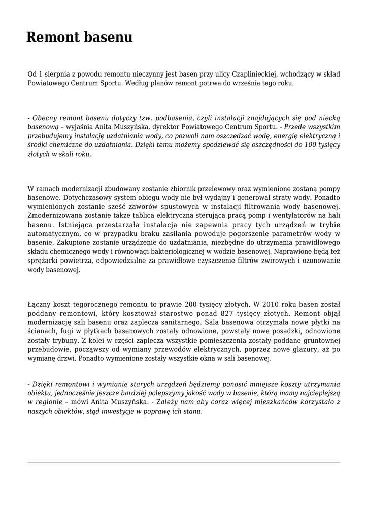 Remont basenu Od 1 sierpnia z powodu remontu nieczynny jest basen przy ulicy Czaplinieckiej, wchodzący w skład Powiatowego Centrum Sportu. Według planów remont potrwa do września tego roku. - Obecny remont basenu dotyczy tzw. podbasenia, czyli instalacji znajdujących się pod niecką basenową – wyjaśnia Anita Muszyńska, dyrektor Powiatowego Centrum Sportu. - Przede wszystkim przebudujemy instalację uzdatniania wody, co pozwoli nam oszczędzać wodę, energię elektryczną i środki chemiczne do uzdatniania. Dzięki temu możemy spodziewać się oszczędności do 100 tysięcy złotych w skali roku. W ramach modernizacji zbudowany zostanie zbiornik przelewowy oraz wymienione zostaną pompy basenowe. Dotychczasowy system obiegu wody nie był wydajny i generował straty wody. Ponadto wymienionych zostanie sześć zaworów spustowych w instalacji filtrowania wody basenowej. Zmodernizowana zostanie także tablica elektryczna sterująca pracą pomp i wentylatorów na hali basenu. Istniejąca przestarzała instalacja nie zapewnia pracy tych urządzeń w trybie automatycznym, co w przypadku braku zasilania powoduje pogorszenie parametrów wody w basenie. Zakupione zostanie urządzenie do uzdatniania, niezbędne do utrzymania prawidłowego składu chemicznego wody i równowagi bakteriologicznej w wodzie basenowej. Naprawione będą też sprężarki powietrza, odpowiedzialne za prawidłowe czyszczenie filtrów żwirowych i ozonowanie wody basenowej. Łączny koszt tegorocznego remontu to prawie 200 tysięcy złotych. W 2010 roku basen został poddany remontowi, który kosztował starostwo ponad 827 tysięcy złotych. Remont objął modernizację sali basenu oraz zaplecza sanitarnego. Sala basenowa otrzymała nowe płytki na ścianach, fugi w płytkach basenowych zostały odnowione, powstały nowe posadzki, odnowione zostały trybuny. Z kolei w części zaplecza wszystkie pomieszczenia zostały poddane gruntownej przebudowie, począwszy od wymiany przewodów elektrycznych, poprzez nowe glazury, aż po wymianę drzwi. Ponadto wymienione zostały wszystkie okna w sali basenowej. - Dzięki remontowi i wymianie starych urządzeń będziemy ponosić mniejsze koszty utrzymania obiektu, jednocześnie jeszcze bardziej polepszymy jakość wody w basenie, którą mamy najcieplejszą w regionie – mówi Anita Muszyńska. - Zależy nam aby coraz więcej mieszkańców korzystało z naszych obiektów, stąd inwestycje w poprawę ich stanu. Krzysztof Borowski Rzecznik Prasowy
