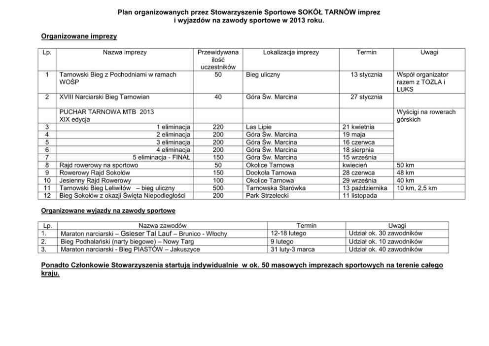 Plan organizowanych przez Stowarzyszenie Sportowe SOKÓŁ TARNÓW imprez i wyjazdów na zawody sportowe w 2013 roku. Organizowane imprezy Lp. Nazwa imprezy 1 Tarnowski Bieg z Pochodniami w ramach WOŚP 2 XVIII Narciarski Bieg Tarnowian Przewidywana ilość uczestników 50 40 Lokalizacja imprezy Termin Bieg uliczny 13 stycznia Góra Św. Marcina 27 stycznia 1 eliminacja 2 eliminacja 3 eliminacja 4 eliminacja 5 eliminacja - FINAŁ Rajd rowerowy na sportowo Rowerowy Rajd Sokołów Jesienny Rajd Rowerowy Tarnowski Bieg Leliwitów – bieg uliczny Bieg Sokołów z okazji Święta Niepodległości Współ organizator razem z TOZLA i LUKS Wyścigi na rowerach górskich PUCHAR TARNOWA MTB 2013 XIX edycja 3 4 5 6 7 8 9 10 11 12 Uwagi 220 200 200 200 150 50 150 100 500 200 Las Lipie Góra Św. Marcina Góra Św. Marcina Góra Św. Marcina Góra Św. Marcina Okolice Tarnowa Dookoła Tarnowa Okolice Tarnowa Tarnowska Starówka Park Strzelecki 21 kwietnia 19 maja 16 czerwca 18 sierpnia 15 września kwiecień 28 czerwca 29 września 13 października 11 listopada 50 km 48 km 40 km 10 km, 2,5 km Organizowane wyjazdy na zawody sportowe Lp. 1. 2. 3. Nazwa zawodów Maraton narciarski – Gsieser Tal Lauf – Brunico - Włochy Bieg Podhalański (narty biegowe) – Nowy Targ Maraton narciarski - Bieg PIASTÓW – Jakuszyce Termin 12-18 lutego 9 lutego 31 luty-3 marca Uwagi Udział ok. 30 zawodników Udział ok. 10 zawodników Udział ok. 40 zawodników Ponadto Członkowie Stowarzyszenia startują indywidualnie w ok. 50 masowych imprezach sportowych na terenie całego kraju.