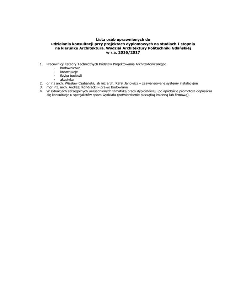 Lista osób uprawnionych do udzielania konsultacji przy projektach dyplomowych na studiach I stopnia na kierunku Architektura, Wydział Architektury Politechniki Gdańskiej w r.a. 2016/2017 1. 2. 3. 4. Pracownicy Katedry Technicznych Podstaw Projektowania Architektonicznego; budownictwo konstrukcje fizyka budowli akustyka dr inż arch. Wiesław Czabański, dr inż arch. Rafał Janowicz – zaawansowane systemy instalacyjne mgr inż. arch. Andrzej Kondracki – prawo budowlane W sytuacjach szczególnych uzasadnionych tematyką pracy dyplomowej i po aprobacie promotora dopuszcza się konsultacje u specjalistów spoza wydziału (potwierdzenie pieczątką imienną lub firmową).