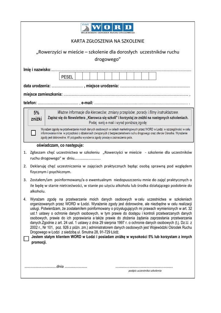 KARTA ZGŁOSZENIA NA SZKOLENIE „Rowerzyści w mieście – szkolenie dla dorosłych uczestników ruchu drogowego” Imię i nazwisko:.......................................................................................................................................... PESEL data urodzenia: ............................... , miejsce urodzenia: ..................................................................... miejsce zamieszkania: ........................................................................................................................... , telefon: ........................................ , e-mail: ……………………………..…..………..……………………… . oświadczam, co następuje: 1. Zgłaszam chęć uczestnictwa w szkoleniu „Rowerzyści w mieście - szkolenie dla uczestników ruchu drogowego” w dniu………………………. 2. Deklaruję chęć uczestniczenia w zajęciach praktycznych będąc osobą sprawną pod względem fizycznym i psychicznym. 3. Zostałem/am poinformowany/a o ewentualnym niedopuszczeniu mnie do zajęć praktycznych o ile będę w stanie nietrzeźwości, w stanie po użyciu alkoholu lub środka działającego podobnie do alkoholu. 4. Wyrażam zgodę na przetwarzanie moich danych osobowych w celu uczestnictwa w szkoleniach organizowanych przez WORD w Łodzi. Wyrażenie zgody jest dobrowolne, ale niezbędne w celu realizacji usługi. Potwierdzam, że zostałam/łem poinformowany o przysługujących mi prawach wymienionych w art. 32 ust.1 ustawy o ochronie danych osobowych, w tym prawie do dostępu i kontroli przetwarzanych danych osobowych, prawie do ich poprawiania a także prawie do złożenia żądania zaprzestania przetwarzania danych.Zgodnie z art. 24 ust. 1 ustawy z dnia 29 sierpnia 1997 r. o ochronie danych osobowych (t.j. Dz.U. z 2002 r., Nr 101, poz. 926 z późn. zm.) administratorem danych osobowych jest Wojewódzki Ośrodek Ruchu Drogowego w Łodzi z siedzibą ul. Smutna 28, 91-729 Łódź. Jestem stałym klientem WORD w Łodzi i posiadam zniżkę w wysokości 5% lub korzystam z innych promocji. …………………………….dnia …………………… ……………………………………………………. podpis uczestnika szkolenia