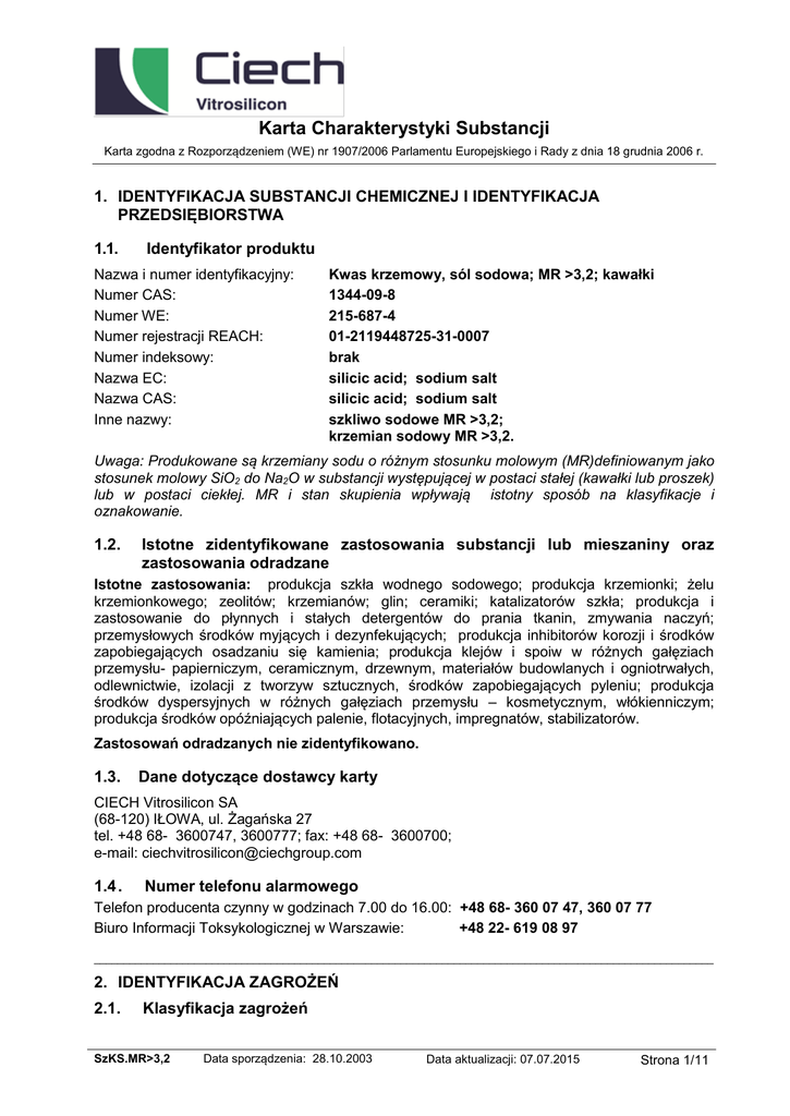 Karta Charakterystyki Substancji Karta zgodna z Rozporządzeniem (WE) nr 1907/2006 Parlamentu Europejskiego i Rady z dnia 18 grudnia 2006 r. 1. IDENTYFIKACJA SUBSTANCJI CHEMICZNEJ I IDENTYFIKACJA PRZEDSIĘBIORSTWA 1.1. Identyfikator produktu Nazwa i numer identyfikacyjny: Numer CAS: Numer WE: Numer rejestracji REACH: Numer indeksowy: Nazwa EC: Nazwa CAS: Inne nazwy: Kwas krzemowy, sól sodowa; MR >3,2; kawałki 1344-09-8 215-687-4 01-2119448725-31-0007 brak silicic acid; sodium salt silicic acid; sodium salt szkliwo sodowe MR >3,2; krzemian sodowy MR >3,2. Uwaga: Produkowane są krzemiany sodu o różnym stosunku molowym (MR)definiowanym jako stosunek molowy SiO2 do Na2O w substancji występującej w postaci stałej (kawałki lub proszek) lub w postaci ciekłej. MR i stan skupienia wpływają istotny sposób na klasyfikacje i oznakowanie. 1.2. Istotne zidentyfikowane zastosowania substancji lub mieszaniny oraz zastosowania odradzane Istotne zastosowania: produkcja szkła wodnego sodowego; produkcja krzemionki; żelu krzemionkowego; zeolitów; krzemianów; glin; ceramiki; katalizatorów szkła; produkcja i zastosowanie do płynnych i stałych detergentów do prania tkanin, zmywania naczyń; przemysłowych środków myjących i dezynfekujących; produkcja inhibitorów korozji i środków zapobiegających osadzaniu się kamienia; produkcja klejów i spoiw w różnych gałęziach przemysłu- papierniczym, ceramicznym, drzewnym, materiałów budowlanych i ogniotrwałych, odlewnictwie, izolacji z tworzyw sztucznych, środków zapobiegających pyleniu; produkcja środków dyspersyjnych w różnych gałęziach przemysłu – kosmetycznym, włókienniczym; produkcja środków opóźniających palenie, flotacyjnych, impregnatów, stabilizatorów. Zastosowań odradzanych nie zidentyfikowano. 1.3. Dane dotyczące dostawcy karty CIECH Vitrosilicon SA (68-120) IŁOWA, ul. Żagańska 27 tel. +48 68- 3600747, 3600777; fax: +48 68- 3600700; e-mail: [email protected] 1.4 . Numer telefonu alarmowego Telefon producenta czynny w godzinach 7.00 do 16.00: +48 68- 360 07 47, 360 07 77 Biuro Informacji Toksykologicznej w Warszawie: +48 22- 619 08 97 _________________________________________________________________________________________________________ 2. IDENTYFIKACJA ZAGROŻEŃ 2.1. Klasyfikacja zagrożeń SzKS.MR>3,2 Data sporządzenia: 28.10.2003 Data aktualizacji: 07.07.2015 Strona 1/11 Karta Charakterystyki Substancji Karta zgodna z Rozporządzeniem (WE) nr 1907/2006 Parlamentu Europejskiego i Rady z dnia 18 grudnia 2006 r. Klasyfikacja zgodna z rozporządzeniem (WE) 1272/2008 [CLP/GHS] Substancja nie sklasyfikowana 2.1.1. 2.1.2. Klasyfikacja zgodna z dyrektywą DSD i rozporządzeniem MZ w sprawie kryteriów i sposobu klasyfikacji substancji chemicznych i ich mieszanin (Dz.U.12.1018) Substancja nie sklasyfikowana 2.2. Elementy oznakowania 2.2.1. Oznakowane według z rozporządzeniem (WE) Nr 1272/2008 [CLP/GHS] Substancja nie wymaga oznakowania 2.2.2. Oznakowanie według Dyrektywy DSD i rozporządzenia MZ w sprawie oznakowania opakowań substancji niebezpiecznych i preparatów niebezpiecznych oraz niektórych preparatów chemicznych (Dz.U. 12.445) Substancja nie wymaga oznakowania 2.2. Inne zagrożenia Substancja nie spełnia kryteriów PBT lub vPvB świetle załącznika XIII rozporządzenia REACH. __________________________________________________________________________________________________________________ 3. SKŁAD / INFORMACJA O SKŁADNIKACH Nazwa chemiczna: Kwas krzemowy, sól sodowa o module MR >3,2 Zawartość czystej substancji: 99%ww (Na2O+SiO2) Zwyczajowa nazwa własna: szkliwo sodowe o module molowym >3,2 Nazwa EC: silicic acid, sodium salt; Nr WE: 215-687-4 Nazwa CAS: silicic acid, sodium salt; nr CAS: 1344-09-8 Nazwa IUPAC: sodium hydroxy(oxo)silanolate Inne nazwy: krzemian sodu Wzór chemiczny: Na2O x nSiO2 Opis substancji: Substancja nieorganiczna typu UVCB. Jest kompozycją oligomerów anionów krzemianowych SiO4 połączonych z kationami sodu. Budowa strukturalna substancji i jej właściwości zależą od stosunku molowego SiO2 do Na2O zwanego modułem molowym MR. Opisywany produkt o MR >3,2 (dla stężenia 100% substancji Na2O x nSiO2) zawiera: Moduł molowy (MR) SiO2 : Na2O > 3,2 Zawartość SiO2 > 67% Zawartość Na2O < 33% Opis zanieczyszczeń: Występujące, w ilości poniżej 1%ww, zanieczyszczenia nie mają wpływu na klasyfikację substancji. Są to tlenki metali pochodzące z surowców (piasku kwarcowego) np. tlenki: wapnia, magnezu, glinu, tytanu, żelaza itp. _________________________________________________________________________________________________________ 4. ŚRODKI PIERWSZEJ POMOCY 4.1. Opis środków pierwszej pomocy SzKS.MR>3,2 Data sporządzenia: 28.10.2003 Data aktualizacji: 07.07.2015 Strona 2/11 Karta Charakterystyki Substancji Karta zgodna z Rozporządzeniem (WE) nr 1907/2006 Parlamentu Europejskiego i Rady z dnia 18 grudnia 2006 r. Substancja nie jest niebezpieczna dla ludzi. Należy unikać kontaktu z nieosłoniętą skórą lub oczami. W przypadku kontaktu ze skórą: spłukać skórę pod strumieniem wody lub prysznicem. W przypadku dostania się substancji do oczu: ostrożnie płukać wodą przez co najmniej 10 minut. Wyjąć soczewki kontaktowe, jeżeli są i można je łatwo usunąć. Wezwać lekarza – okulistę. W przypadku połknięcia: wypłukać usta, nie wywoływać wymiotów. Po wdychaniu: w przypadku złego samopoczucia, wyprowadzić osobę poszkodowaną na świeże powietrze. 4.2. Najważniejsze ostre oraz opóźnione objawy oraz skutki narażenia Substancja stała, słabo rozpuszczalna w wodzie. Na powierzchni może wytwarzać się warstwa rozpuszczalnego, alkalicznego Na2CO3 na skutek kontaktu z CO2 z powietrza. Kontakt ze skórą może powodować niegroźne podrażnienia. Przypadkowe wprowadzenie substancji do oka grozi jego podrażnieniem. Połknięcie może spowodować uszkodzenie śluzówki. 4.3. Wskazania dotyczące wszelkiej natychmia