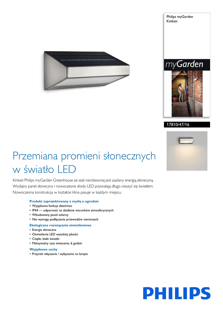 Philips myGarden Kinkiet myGarden 17810/47/16 Przemiana promieni słonecznych w światło LED Kinkiet Philips myGarden Greenhouse ze stali nierdzewnej jest zasilany energią słoneczną. Wydajny panel słoneczny i nowoczesne diody LED pozwalają długo cieszyć się światłem. Nowoczesna konstrukcja w kształcie klina pasuje w każdym miejscu. Produkt zaprojektowany z myślą o ogrodzie • Wyjątkowa funkcja dzień/noc • IP44 — odporność na działanie warunków atmosferycznych • Wbudowany panel solarny • Nie wymaga podłączania przewodów sieciowych Ekologiczne rozwiązania oświetleniowe • Energia słoneczna • Oświetlenie LED wysokiej jakości • Ciepłe, białe światło • Maksymalny czas świecenia: 6 godzin Wyjątkowe cechy • Przycisk włączania / wyłączania na lampie 178104716 Kinkiet Zalety Oświetlenie LED wysokiej jakości Technologia LED zastosowana w tej lampie firmy Philips to wyjątkowe rozwiązanie opracowane przez firmę Philips. Natychmiast się włącza, pozwala na uzyskanie optymalnej wydajności oświetlenia oraz podkreśla i ożywia kolory w Twoim domu. Ciepłe, białe światło IP44 — odporność na działanie warunków atmosferycznych Nie wymaga podłączania przewodów sieciowych Ta lampa zewnętrzna Philips została zaprojektowana pod kątem wilgotnych miejsc i przeszła rygorystyczne testy, które potwierdziły jej odporność na wodę. Poziom IP określają dwie liczby: pierwsza to poziom ochrony przeciw kurzowi, a druga przeciw wodzie. Poziom IP44 oznacza, że lampa ta jest odporna na zachlapania. To czyni z niej idealną lampę do ogólnych zastosowań na zewnątrz. Montaż lamp Philips myGarden Solar jest dziecinnie prosty — nawet nie mając wcześniejszego doświadczenia w zakresie montażu oświetlenia, wystarczy poświęcić kilka minut, aby rozmieścić je w ogrodzie. Nie trzeba martwić się o przewody zasilające, co oznacza znaczną swobodę wyboru miejsca, w jakim ma zostać zamontowana lampa. Energia słoneczna Wbudowany panel solarny Światło może mieć różne temperatury barwowe oznaczane za pomocą jednostek zwanych kelwinami (K). Lampy o niskiej wartości kelwinów zapewniają ciepłe, bardziej przytulne światło, natomiast lampy o wysokiej wartości kelwinów dają chłodne, bardziej pobudzające światło. Ta lampa firmy Philips rzuca ciepłe, białe światło, które zapewnia przytulną atmosferę. Ta lampa Philips myGarden Solar jest wyposażona we wbudowane panele solarne. Nie wymaga ona podłączania żadnych przewodów i emituje światło o jasności do 100 lumenów, które wystarczy, aby oświetlić wydzielony obszar lub podkreślić wybrane walory architektoniczne. Lampy Philips myGarden Solar zostały zaprojektowane z myślą o optymalnym wykorzystaniu zgromadzonej energii słonecznej i zapewnieniu oświetlenia na długi czas. Całkowity brak poboru prądu pozwala zmniejszyć rachunki za prąd i przyczynia się do ochrony środowiska. 178104716 Kinkiet Dane techniczne Stylistyka i wykończenie • Materiał: stal szlachetna • Kolor: stal nierdzewna Dodatkowe funkcje/akcesoria w zestawie • Czujnik światła dziennego • Odporność na warunki pogodowe • Energia słoneczna Wymiary i waga produktu • • • • Wysokość: 9,0 cm Długość: 18 cm Szerokość: 10,8 cm Waga netto: 0,088 kg Specyfikacja techniczna • • • • Zasilanie sieciowe: Przedział 220–240 V Liczba źródeł światła: 1 Moc źródła światła w zestawie: 1,5 W Maksymalna moc wymiennego źródła światła: 1,5 W • Współczynnik IP: IP44, ochrona przed przedmiotami powyżej 1 mm, ochrona przed rozchlapaną wodą • Klasa ochronności: III — bezpieczne, bardzo niskie napięcie Serwis • Gwarancja: 2 lata Wymiary i waga opakowania • • • • Wysokość: 19,8 cm Długość: 13,3 cm Szerokość: 11,3 cm Waga: 0,598 kg Różne • Opracowano z myślą o: Ogród i patio • Styl: Nowoczesne • Typ: Kinkiet • Data wydania 2014-03-13 © 2014 Koninklijke Philips N.V. Wszelkie prawa zastrzeżone. Wersja: 1.0.1 Dane techniczne mogą ulec zmianie bez powiadomienia. Znaki towarowe są własnością Koninklijke Philips N.V. lub własnością odpowiednich firm. 12 NC: 9150 043 47801 EAN: 87 18291 48945 0 www.philips.com