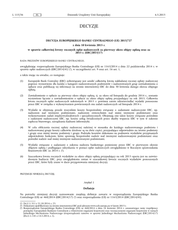 L 115/36 Dziennik Urzędowy Unii Europejskiej PL 6.5.2015 DECYZJE DECYZJA EUROPEJSKIEGO BANKU CENTRALNEGO (UE) 2015/727 z dnia 10 kwietnia 2015 r. w sprawie całkowitej kwoty rocznych opłat nadzorczych za pierwszy okres objęty opłatą oraz za 2015 r. (EBC/2015/17) RADA PREZESÓW EUROPEJSKIEGO BANKU CENTRALNEGO, uwzględniając rozporządzenie Europejskiego Banku Centralnego (UE) nr 1163/2014 z dnia 22 października 2014 r. w sprawie opłat nadzorczych (EBC/2014/41) (1), w szczególności art. 9 oraz art. 16 ust. 1, a także mając na uwadze, co następuje: (1) Europejski Bank Centralny (EBC) zobowiązany jest ustalić całkowitą kwotę nakładanej rocznej opłaty nadzorczej poprzez wystawienie dla każdej z kategorii nadzorowanych podmiotów i nadzorowanych grup zawiadomienia o opłacie oraz publikację tej informacji na stronie internetowej EBC do dnia 30 kwietnia danego okresu objętego opłatą. (2) Zawiadomienie o opłacie za pierwszy okres objęty opłatą, tj. za okres od listopada do grudnia 2014 r., zostanie wystawione łącznie z zawiadomieniem o opłacie za okres objęty opłatą przypadający na rok 2015. Całkowita kwota rocznych opłat nadzorczych nałożonych w 2015 r. powinna zatem odzwierciedlać wydatki ponoszone przez EBC w związku z wykonywaniem powierzonych mu zadań nadzorczych od listopada 2014 r. (3) Wydatki te obejmują przede wszystkim koszty bezpośrednio związane z zadaniami nadzorczymi EBC, np. nadzorem nad istotnymi podmiotami, nadzorem zwierzchnim nad mniej istotnymi podmiotami oraz wykonywaniem zadań międzywydziałowych i specjalistycznych. Obejmują one także koszty związane pośrednio z zadaniami nadzorczymi EBC, np. koszty usług świadczonych przez służby wsparcia EBC w tym w zakresie zaplecza biurowego, zarządzania kadrami informatyki. (4) W celu obliczenia rocznej opłaty nadzorczej należnej w stosunku do każdego nadzorowanego podmiotu i nadzorowanej grupy koszty całkowite dzielone są na dwie części, przypadające odpowiednio na istotne podmioty i grupy oraz mniej istotne podmioty i grupy. Podziału kosztów dokonano na podstawie wydatków przypisanych odpowiednim funkcjom, które sprawują bezpośredni nadzór nad istotnymi nadzorowanymi podmiotami oraz pośredni nadzór nad mniej istotnymi nadzorowanymi podmiotami. (5) Wydatki związane z zadaniami z zakresu nadzoru bankowego poniesione przez EBC w pierwszym okresie objętym opłatą i podlegające odzyskaniu w postaci opłat nadzorczych uwzględniono w Rocznym sprawozdaniu finansowym EBC za 2014 r. (2). (6) Szacunkowa kwota rocznych wydatków za okres objęty opłatą przypadający na rok 2015 oparta jest na zatwier dzonym budżecie EBC, przy uwzględnieniu zmian w szacunkowej kwocie rocznych wydatków ponoszonych przez EBC, które były znane w dacie przygotowania niniejszej decyzji, PRZYJMUJE NINIEJSZĄ DECYZJĘ: Artykuł 1 Definicje Na potrzeby niniejszej decyzji zastosowanie znajdują definicje zawarte w rozporządzeniu Europejskiego Banku Centralnego (UE) nr 468/2014 (EBC/2014/17) (3) oraz rozporządzeniu (UE) nr 1163/2014 (EBC/2014/41). (1) Dz.U. L 311 z 31.10.2014, s. 23. (2) Dokument opublikowany na stronie internetowej EBC pod adresem www.ecb.europa.eu w lutym 2015 r. (3) Rozporządzenie Europejskiego Banku Centralnego (UE) nr 468/2014 z dnia 16 kwietnia 2014 r. ustanawiające ramy współpracy pomiędzy Europejskim Bankiem Centralnym a właściwymi organami krajowymi oraz wyznaczonymi organami krajowymi w ramach Jednolitego Mechanizmu Nadzorczego (rozporządzenie ramowe w sprawie Jednolitego Mechanizmu Nadzorczego) (EBC/2014/17) (Dz.U. L 141 z 14.5.2014, s. 1). 6.5.2015 PL Dziennik Urzędowy Unii Europejskiej L 115/37 Artykuł 2 Całkowita kwota rocznych opłat nadzorczych za pierwszy okres objęty opłatą oraz za 2015 r. 1. Całkowita kwota rocznych opłat nadzorczych za pierwszy okres objęty opłatą oraz za 2015 r. wynosi 325 986 085 EUR i odpowiada faktycznym kosztom poniesionym przez EBC od listopada do grudnia 2014 oraz szacunkowym rocznym kosztom za 2015 rok, zgodnie z załącznikiem I do niniejszej decyzji. 2. Każda z kategorii nadzorowanych podmiotów i nadzorowanych grup opłaca całkowitą kwotę rocznych opłat nadzorczych zgodnie z załącznikiem II do niniejszej decyzji. Artykuł 3 Wejście w życie Niniejsza decyzja wchodzi w życie z dniem 29 kwietnia 2015 r. Sporządzono we Frankfurcie nad Menem dnia 10 kwietnia 2015 r. Mario DRAGHI Prezes EBC L 115/38 PL Dziennik Urzędowy Unii Europejskiej 6.5.2015 ZAŁĄCZNIK I (EUR) 2014 2015 Łącznie 18 456 945 151 665 635 170 122 580 Wynajem i utrzymanie budynku 2 199 243 22 563 517 24 762 760 Pozostałe koszty operacyjne 9 316 824 121 783 921 131 100 745 29 973 012 296 013 073 325 986 085 Wynagrodzenia i świadczenia Łącznie ZAŁĄCZNIK II (EUR) 2014 2015 Łącznie 29 973 012 296 013 073 325 986 085 Opłaty nałożone na znaczące podmioty lub znaczące grupy 25 622 812 264 068 941 289 691 753 Opłaty nałożone na mniej znaczące pod mioty lub mniej znaczące grupy 4 350 200 31 944 132 36 294 332 Opłaty nadzorcze w tym: