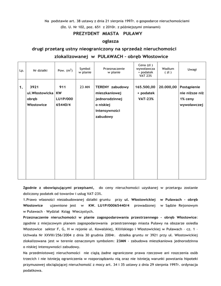 Na podstawie art. 38 ustawy z dnia 21 sierpnia 1997r. o gospodarce nieruchomościami (Dz. U. Nr 102, poz. 651 z 2010r. z późniejszymi zmianami) PREZYDENT MIASTA PUŁAWY ogłasza drugi przetarg ustny nieograniczony na sprzedaŜ nieruchomości zlokalizowanej w PUŁAWACH – obręb Włostowice Lp. 1. Nr działki 3921 2 Pow. (m ) 911 Symbol w planie 23 MN Przeznaczenie w planie TERENY zabudowy Cena (zł ) wywoławcza + podatek VAT 23% Wadium ( zł ) Uwagi 165.500,00 20.000,00 Postąpienie ul.Włostowicka KW mieszkaniowej + podatek obręb LU1P/000 jednorodzinnej VAT-23% Włostowice 65440/4 o niskiej nie niŜsze niŜ 1% ceny wywoławczej intensywności zabudowy Zgodnie z obowiązującymi przepisami, do ceny nieruchomości uzyskanej w przetargu zostanie doliczony podatek od towarów i usług VAT-23%. 1.Prawo własności niezabudowanej działki gruntu Włostowice ujawnione jest w przy ul. Włostowickiej KW. LU1P/00065440/4 prowadzonej w Puławach – obręb w Sądzie Rejonowym w Puławach – Wydział Ksiąg Wieczystych. Przeznaczenie nieruchomości w planie zagospodarowania przestrzennego – obręb Włostowice: zgodnie z miejscowym planem zagospodarowania przestrzennego miasta Puławy na obszarze osiedla Włostowice sektor F, G, H w rejonie ul. Kowalskiej, Kilińskiego i Wlostowickiej w Puławach – cz. 1 – Uchwała Nr XXVIII/256/2004 z dnia 30 grudnia 2004r. działka gruntu nr 3921 przy ul. Włostowickiej zlokalizowana jest w terenie oznaczonym symbolem: 23MN - zabudowa mieszkaniowa jednorodzinna o niskiej intensywności zabudowy. Na przedmiotowej nieruchomości nie ciąŜą Ŝadne ograniczone prawa rzeczowe ani roszczenia osób trzecich i nie istnieją ograniczenia w rozporządzaniu nią oraz nie istnieją warunki powstania hipoteki przymusowej obciąŜającej nieruchomość z mocy art. 34 i 35 ustawy z dnia 29 sierpnia 1997r. ordynacja podatkowa. Przetarg odbędzie się w dniu 20 grudnia 2011r. o godzinie 1200, w sali konferencyjnej w Urzędzie Miasta Puławy przy ul. Lubelskiej 5. Pierwszy przetarg odbył się w dniu 6 czerwca 2011 r. Zakończył się wynikiem negatywnym. W przetargu mogą uczestniczyć krajowe i zagraniczne osoby fizyczne i prawne, jeŜeli wpłacą wadium. Wadium w pieniądzu naleŜy wpłacić na konto Urzędu Miasta Puławy 15 1560 1195 2311 0970 9957 0004 w GETIN BANK SA nie później niŜ w dniu 16 grudnia 2011r. (oryginał o dokonanym przelewie potwierdzony przez bank – naleŜy przedstawić komisji przetargowej przed otwarciem przetargu tj. w trakcie ustalania listy licytantów ). Za datę wpłacenia wadium uwaŜa się wpływ wymaganej kwoty na w/w rachunek. Osoba ustalona jako nabywca nieruchomości zobowiązana jest przed wyznaczonym terminem podpisania umowy notarialnej zapłacić kwotę równą 100% ceny nieruchomości osiągniętej w przetargu, pomniejszonej o wpłacone wadium. Nie uiszczenie tej kwoty spowoduje odstąpienie od zawarcia umowy i przepadek wadium. Wpłata powinna nastąpić nie później niŜ 2 dni przed podpisaniem umowy sprzedaŜy. Za datę wpłaty uwaŜa się wpływ wymaganej naleŜności na rachunek Urzędu Miasta Puławy. Cudzoziemiec, który wygra przetarg przed podpisaniem umowy sprzedaŜy zobowiązany będzie pod rygorem utraty wadium przedstawić zezwolenie na nabycie nieruchomości, wydane przez Ministra Spraw Wewnętrznych i Administracji. Koszty notarialne i sądowe w całości ponosi nabywca nieruchomości. Wadium zwraca się niezwłocznie po odwołaniu lub zamknięciu przetargu, nie później niŜ przed upływem 3 dni od dnia, odpowiednio: odwołania, zamknięcia, uniewaŜnienia lub zakończenia wynikiem negatywnym przetargu. Wadium wniesione przez uczestnika przetargu, który przetarg wygrał, zalicza się na poczet ceny nabycia nieruchomości. Prezydent Miasta Puławy moŜe odwołać ogłoszony przetarg jedynie z waŜnych powodów, informując o tym niezwłocznie w formie właściwej dla ogłoszenia o przetargu i podając przyczynę odwołania przetargu. Szczegółowe informacje o przetargu moŜna uzyskać w Wydziale Gospodarki Nieruchomościami Urzędu Miasta Puławy, pok. 239 (tel. 81 880-45-79). W postępowaniu przetargowym będą stosowane przepisy rozporządzenia Rady Ministrów z dnia 14 września 2004 roku w sprawie sposobu i trybu przeprowadzania przetargów oraz rokowań na zbycie nieruchomości (Dz. U. Nr 207, poz. 2108 z 2004r. z późn. zmianami).