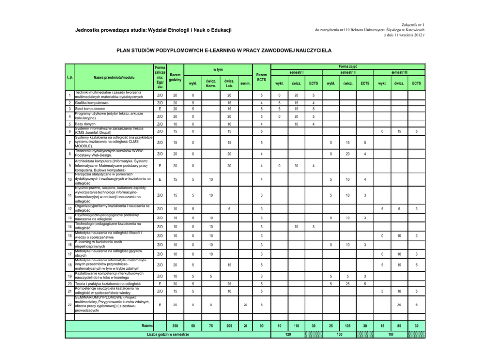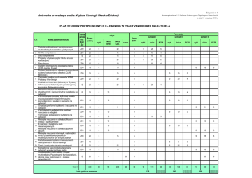 Załącznik nr 1 do zarządzenia nr 119 Rektora Uniwersytetu Śląskiego w Katowicach z dnia 11 września 2012 r Jednostka prowadząca studia: Wydział Etnologii i Nauk o Edukacji PLAN STUDIÓW PODYPLOMOWYCH E-LEARNING W PRACY ZAWODOWEJ NAUCZYCIELA L.p. Forma zalicze Razem nia: godziny Egz/ Zal Nazwa przedmiotu/modułu w tym wykł. ćwicz. Konw. ćwicz. Lab. semin. Razem ECTS Forma zajęć semestr II semestr I wykł. ćwicz. ECTS wykł. ćwicz. semestr III ECTS wykł. ćwicz. ECTS 0 15 5 5 5 3 0 10 3 1 Techniki multimedialne i zasady tworzenia multimedialnych materiałów dydaktycznych Z/O 20 0 20 5 0 20 5 2 Grafika komputerowa Z/O 20 5 15 4 5 15 4 3 Sieci komputerowe Programy użytkowe (edytor tekstu, arkusze kalkulacyjne) E 20 5 15 5 5 15 5 Z/O 20 0 20 5 0 20 5 Z/O 10 0 10 4 10 4 Z/O 15 0 15 5 Z/O 15 0 15 5 0 15 5 Z/O 20 0 20 4 0 20 4 E 20 0 20 4 E 15 5 10 4 5 10 4 Z/O 15 5 10 3 5 10 3 Z/O 10 5 Z/O 15 5 10 3 Z/O 10 0 10 3 Z/O 10 0 10 3 Z/O 10 0 10 3 Z/O 10 0 10 3 0 10 3 Z/O 20 5 5 5 15 5 Z/O 10 5 3 5 5 3 E 30 5 25 5 5 25 5 Z/O 15 5 10 5 5 10 5 E 20 0 0 20 6 350 50 75 85 30 4 5 6 7 8 9 10 11 12 13 14 15 16 17 18 19 Bazy danych Systemy informatyczne zarządzania treścią (CMS Joomla!, Drupal) Systemy kształcenia na odległość (na przykładzie systemu kształcenia na odległość CLMS MOODLE). Tworzenie dydaktycznych serwisów WWW. Podstawy Web-Design. Architektura komputera (Informatyka. Systemy Informatyczne. Matematyczne podstawy pracy komputera. Budowa komputera) Narzędzia statystyczne w pomiarach dydaktycznych i ewaluacyjnych w kształceniu na odległość Etyczno-prawne, socjalne, kulturowe aspekty wykorzystania technologii informacyjnokomunikacyjnej w edukacji i nauczaniu na odległość Organizacyjne formy kształcenia i nauczania na odległość Psychologiczno-pedagogiczne podstawy nauczania na odległość Technologie pedagogiczne kształcenia na odległość Metodyka nauczania na odległość filozofii i wiedzy o społeczeństwie E-learning w kształceniu osób niepełnosprawnych Metodyka nauczania na odległość języków obcych Metodyka nauczania informatyki, matematyki i innych przedmiotów przyrodniczomatematycznych w tym w trybie zdalnym Kształtowanie kompetencji interkulturowych nauczycieli do i w toku e-learningu 20 Teoria i praktyka kształcenia na odległość Kompetencje nauczyciela kształcenia na 21 odległość w społeczeństwie wiedzy SEMINARIUM DYPLOMOWE (Projekt multimedialny, Przygotowanie kursów zdalnych, 22 obrona pracy dyplomowej) ( z zestawu prowadzących) Razem: Liczba godzin w semestrze 5 20 4 3 15 5 205 0 20 6 20 90 5 10 10 0 10 110 120 3 3 30 10 25 105 130 3 30 15 100 L.p. Nazwa przedmiotu/modułu Forma zalicze Razem nia: godziny Egz/ Zal w tym wykł. ćwicz. Konw. ćwicz. Lab. semin. Razem ECTS Forma zajęć semestr II semestr I wykł. ćwicz. ECTS wykł. ćwicz. semestr III ECTS wykł. ćwicz. ECTS Plan studiów zatwierdzony przez Radę Wydziału/Radę Naukową w dniu ………....……………… ………………………………………………………… (podpis i pieczęć Kierownika studiów podyplomowych) ………………………………………………………… (podpis i pieczęć Kierownika jednostki prowadzącej studia)