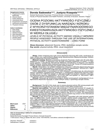 ed . Dorota Sadowska1(A-F), Justyna Krzepota1(A,D,E,F) Wydział Wychowania Fizycznego i Promocji Zdrowia, Uniwersytet Szczeciński Faculty of Physical Education and Health Promotion, University of Szczecin, Szczecin, Poland tio np roh ibit OCENA POZIOMU AKTYWNOŚCI FIZYCZNEJ OSÓB Z DYSFUNKCJĄ NARZĄDU WZROKU Z WYKORZYSTANIEM MIĘDZYNARODOWEGO KWESTIONARIUSZA AKTYWNOŚCI FIZYCZNEJ W WERSJI DŁUGIEJ ibu LEVELS OF PHYSICAL ACTIVITY AMONG VISUALLY IMPAIRED PEOPLE ASSESSED THROUGH THE USE OF INTERNATIONAL PHYSICAL ACTIVITY QUESTIONNAIRE – LONG FORM dis tr Słowa kluczowe: aktywność fizyczna, IPAQ, dysfunkcja narządu wzroku Key words: physical activity, IPAQ, visual impairment Streszczenie rso na lu This copy is for personal use only - distribution prohibited. se - on ly - Wstęp. Celem niniejszej pracy była ocena aktywności fizycznej (AF) osób z dysfunkcją narządu wzroku przy wykorzystaniu długiej wersji kwestionariusza Międzynarodowego Kwestionariusza Aktywności Fizycznej (IPAQ-LF). Materiał i metody. Badania prowadzono na terenie Poznania i objęto nimi 25 osób słabowidzących (17 kobiet i 8 mężczyzn) oraz 25 osób normalnie widzących (14 kobiet i 11 mężczyzn) zgodnie z klasyfikacją International Statistical Classification of Diseases and Related Health Problems. Średnia wieku badanych wyniosła 32,3 ± 5,3 lat. Pomiar AF przeprowadzono metodą sondażu diagnostycznego przy użyciu polskiej IPAQ-LF. Wyniki. Stwierdzono, że wydatek energetyczny związany z całkowitą aktywnością fizyczną nie różnicuje osób słabowidzących i normalnie widzących (odpowiednio: 1870,6±1221,1 MET-min./tydzień vs. 2235,9±1231,4 MET-min./tydzień; p=0,248). Osoby słabowidzące w porównaniu do osób widzących charakteryzują się zdecydowanie niższym wydatkiem energetycznym związanym z umiarkowaną aktywnością fizyczną (odpowiednio: 56,7±177,7 MET-min./tydzień vs. 463,2±613,9 MET-min./tydzień; p≤0,001) i intensywną aktywnością fizyczną (odpowiednio: 26,7±130,6 MET-min./tydzień vs. 295,2±524,1 MET-min./tydzień; p≤0,01) podejmowaną w czasie wolnym. Wnioski. Wskazuje się na potrzebę podjęcia działań promocyjnych zachęcających do podejmowania aktywności fizycznej w czasie wolnym osoby z dysfunkcją narządu wzroku. Summary 5737 3 1 38 is c Word count: Tables: Figures: References: y is - for pe Background. The aim of this study was to assess physical activity (PA) among people with vision impairment through the use of a long version of the IPAQ questionnaire. Material and methods. The study was conducted in Poznan and covered 25 visually impaired people (17 women and 8 men) and 25 normally sighted people (14 women and 11 men) in accordance with the classification of the International Statistical Classification of Diseases and Related Health Problems. Mean age of subjects was 32.3 ± 5.3 years. PA measurement was carried out using the method of diagnostic survey A Polish long version of the International Physical Activity Questionnaire (IPAQ-LF) has been used. Results. It was found that the energy expenditure associated with total physical activity does not differentiate visually impaired and normally sighted people (respectively 1870.6 ± 1221.1 MET-minutes/week vs. 2235.9 ± 1231.4 MET-minutes/week; p = 0,248). Visually impaired compared to sighted people have a much lower energy expenditure associated with moderate physical activity (respectively: 56.7 ± 177.7 MET-minutes/week vs. 463.2 ± 613.9 MET-minutes/week; p ≤ 0.001) and vigorous physical activity (respectively: 26.7 ± 130.6 MET-minutes/ week vs. 295.2 ± 524.1 MET-minutes/week; p ≤ 0.01) undertaken during their leisure time. Conclusions. It is necessary to encourage the promotion of physical activity among visually impaired people in their leisure time. op This copy is for personal use only - distribution prohibited. Author’s Contribution A – Study Design B – Data Collection C – Statistical Analysis D – Data Interpretation E – Manuscript Preparation F – Literature Search G – Funds Collection This copy is for personal use only - distribution prohibited. - Zaangażowanie Autorów A – Przygotowanie projektu badawczego B – Zbieranie danych C – Analiza statystyczna D – Interpretacja danych E – Przygotowanie manuskryptu F – Opracowanie piśmiennictwa G – Pozyskanie funduszy Th Adres do korespondencji / Address for correspondence dr Dorota Sadowska Wydział Wychowania Fizycznego i Promocji Zdrowia, Uniwersytet Szczeciński 71-065 Szczecin, Poland, al. Piastów 40b, blok 6, tel./fax: +48 914442789, e-mail address: [email protected] Otrzymano / Received Zaakceptowano / Accepted 12.06.2013 r. 24.09.2013 r. - This copy is for personal use only - distribution prohibited. Medycyna Sportowa / Polish J Sport Med © MEDSPORTPRESS, 2013; 4(4); Vol. 29, 245-253 ARTYKUŁ ORYGINAŁ / ORIGINAL ARTICLE 245 Wpływ aktywności fizycznej (AF) na poczucie jakości życia [1,2,3], na sprawność fizyczną [4,5,6] i zapobieganie upadkom [7,8,9] osób z dysfunkcjami narządu wzroku był w ostatnich latach często podejmowanym problemem badawczym. Podkreśla się, że niski poziom AF u osób z dysfunkcjami narządu wzroku spowodowany jest licznymi barierami społecznymi, architektonicznymi, psychologicznymi i ekonomicznymi utrudniającymi uczestnictwo w aktywności fizycznej [10,11,12, 13,14]. Badania przeprowadzone przez Centers for Disease Control and Prevention [15] wykazały, że odsetek osób nieaktywnych fizycznie w populacji osób niepełnosprawnych jest dwukrotnie większy (25,6 %) niż odsetek osób nieaktywnych fizycznie w populacji osób pełnosprawnych (12,8%). Z danych opublikowanych w 2006 roku przez Boslaugh i Andresen [16] wynika, że procent osób podejmujących rekomendowany poziom aktywności fizycznej, w przedziale wieku 30-49 lat, wynosi 43,2% wśród osób pełnosprawnych, a 29,6% wśród osób niepełnosprawnych. Z kolei Engel-Yeger i Hamed-Daher (2013) obserwowa