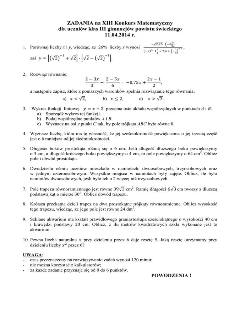 ZADANIA na XIII Konkurs Matematyczny dla uczniów klas III gimnazjów powiatu świeckiego 11.04.2014 r. √, · య మ 1. Porównaj liczby x i y, wiedząc, że 26% liczby x wynosi zaś √2 భ షమ య య : , భ ర , √2 · √2 √2 . 2. Rozwiąż równanie: 2 3 2 5 2 1 0,75 , 3 6 2 a następnie zapisz, które z poniższych warunków spełnia rozwiązanie tego równania: a) √2, 3. b) 2, c) √3. Wykres funkcji liniowej 2 przecina osie układu współrzędnych w punktach A i B. a) Sporządź wykres tej funkcji. b) Podaj współrzędne punktów A i B. c) Wyznacz na osi y punkt C tak, by pole trójkąta ABC było równe 8. 4. Wyznacz liczbę, która ma tę własność, że jej sześciokrotność powiększona o jej trzecią część jest o 6 mniejsza od jej siedmiokrotności. 5. Długości boków prostokąta różnią się o 6 cm. Jeśli długość dłuższego boku powiększymy o 3 cm, a długość krótszego boku powiększymy o 4 cm, to pole powiększymy o 64 cm2. Oblicz pole i obwód prostokąta. 6. Dwudziestu ośmiu uczniów mieszkało w namiotach: dwuosobowych, trzyosobowych oraz w jednym czteroosobowym. Wszystkie miejsca w namiotach były zajęte. Oblicz, ile było namiotów dwuosobowych, jeśli było ich o 2 więcej niż trzyosobowych. 7. Pole trapezu równoramiennego jest równe 39√3 cm2. Ramię długości 6√3 cm tworzy z dłuższą podstawą kąt o mierze 30°. Oblicz obwód trapezu. 8. Krótsza przekątna dzieli trapez na dwa prostokątne trójkąty równoramienne. Oblicz wysokość tego trapezu, wiedząc, że jego pole jest równe 24 dm2. 9. Szklane akwarium ma kształt prawidłowego graniastosłupa sześciokątnego o wysokości 40 cm i krawędzi podstawy 20 cm. Oblicz, z ilu metrów kwadratowych szkła wykonane jest to akwarium. 10. Pewna liczba naturalna przy dzieleniu przez 6 daje resztę 5. Jaką resztę otrzymamy przy dzieleniu liczby przez 6? UWAGA: - czas przeznaczony na rozwiązywanie zadań wynosi 120 minut; - nie można korzystać z kalkulatorów; - za każde zadanie przyznaje się od 0 do 6 punktów. POWODZENIA !