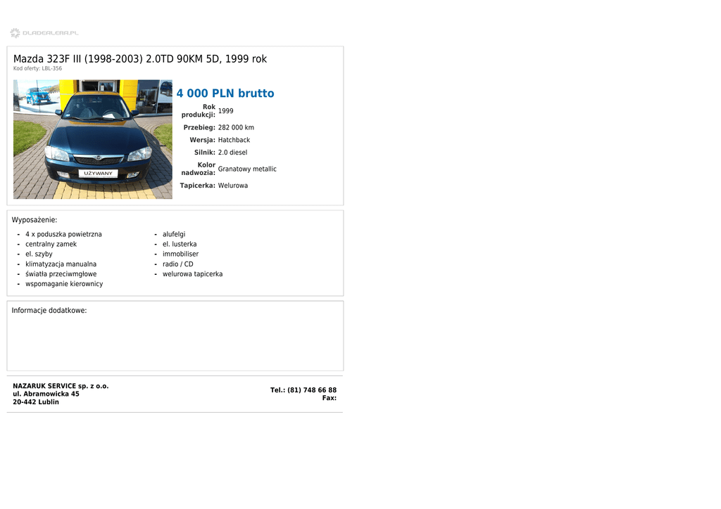 Mazda 323F III (1998-2003) 2.0TD 90KM 5D, 1999 rok Kod oferty: LBL-356 4 000 PLN brutto Rok 1999 produkcji: Przebieg: 282 000 km Wersja: Hatchback Silnik: 2.0 diesel Kolor Granatowy metallic nadwozia: Tapicerka: Welurowa Wyposażenie: - 4 x poduszka powietrzna centralny zamek el. szyby klimatyzacja manualna światła przeciwmgłowe wspomaganie kierownicy - alufelgi el. lusterka immobiliser radio / CD welurowa tapicerka Informacje dodatkowe: NAZARUK SERVICE sp. z o.o. ul. Abramowicka 45 20-442 Lublin Tel.: (81) 748 66 88 Fax: