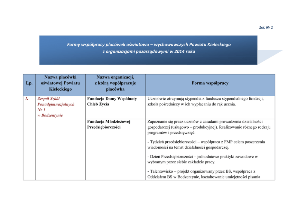 Zał. Nr 1 Formy współpracy placówek oświatowo – wychowawczych Powiatu Kieleckiego z organizacjami pozarządowymi w 2014 roku Lp. 1. Nazwa placówki oświatowej Powiatu Kieleckiego Zespół Szkół Ponadgimnazjalnych Nr 1 w Bodzentynie Nazwa organizacji, z którą współpracuje placówka Forma współpracy Fundacja Domy Wspólnoty Chleb Życia Uczniowie otrzymują stypendia z funduszu stypendialnego fundacji, szkoła pośredniczy w ich wypłacaniu do rąk ucznia. Fundacja Młodzieżowej Przedsiębiorczości Zapoznanie się przez uczniów z zasadami prowadzenia działalności gospodarczej (usługowo – produkcyjnej). Realizowanie różnego rodzaju programów i przedsięwzięć: - Tydzień przedsiębiorczości – współpraca z FMP celem poszerzenia wiadomości na temat działalności gospodarczej. - Dzień Przedsiębiorczości – jednodniowe praktyki zawodowe w wybranym przez siebie zakładzie pracy. - Talentowisko – projekt organizowany przez BS, współpraca z Oddziałem BS w Bodzentynie, kształtowanie umiejętności pisania biznesplanu firmy i pozyskiwania środków finansowych na działalność przedsiębiorstwa. Polski Czerwony Krzyż Przeprowadzenie zbiórki pieniędzy w ramach akcji „Góra Grosza” Szlachetna Paczka Zorganizowanie zbiórki pieniędzy na zakup artykułów spożywczych, środków czystości dla rodzin z terenu Gminy Bodzentyn Dom Dziecka w Jasieńcu Zorganizowanie paczek z okazji Mikołaja dla podopiecznych Domu Dziecka. Katolickie Stowarzyszenie Młodzieżowe w Bodzentynie Uczniowie odbywają cotygodniowe spotkania formacyjne, adoracje, wieczornice. Prowadzą różne akcje: Szlachetna Paczka, dzień Radości. Przygotowują sztuki teatralne, organizują wyjazdy modlitewne i rekolekcyjne, prowadzą działalność muzyczną, kulturalną i sportową. Liga Ochrony Przyrody Uczniowie poruszają zagadnienia ochrony przyrody, przygotowują referaty i akcje ekologiczne: „Cztery pory roku”, „Ratujemy drzewa iglaste”, „Dzieci Ziemi”, prace w ogródku szkolnym i dokarmianie ptaków. Klub Sportowy „JODŁA” Uczniowie uprawiają sporty kwalifikowane w sekcjach: biathlonu, strzeleckiej, sportów obronnych, bilardowej, narciarskiej. Klub Sportowy „Łysica” Zawodnicy odbywają treningi na terenie szkoły. UKS „Olimp” Wzdół Rządowy Stworzenie trwałych kontaktów między szkołami poprzez rywalizację sportową. oraz UKS „Gród” Bodzentyn Towarzystwo Przyjaciół Bodzentyna, Towarzystwo Rozwój obszarów wiejskich, kultywowanie pamięci o II wojnie światowej i jej ofiarach, wśród młodzieży i mieszkańców Bodzentyna, Przyjaciół im. Dawida Rubinowicza”, „Odnowica” – Stowarzyszenie na Recz Odnowy Wsi Polskiej. upamiętnienie męczeństwa ludności polskiej i żydowskiej. Uczestnictwo w projekcie realizowanym przez Towarzystwo Dawida Rubinowicza w Bodzentynie współpracując ze Szwedzkim Komitetem przeciw Antysemityzmowi (SKPA) z siedzibą w Sztokholmie. Projekt nosi tytuł „Zachowanie i prezentacja świadectw ocalałych z Holokaustu – Co to znaczy być istota ludzką?” Przeprowadzenie kwesty na rzecz odbudowy zabytkowych pomników cmentarnych. 2. Zespół Szkół Nr 2 w Chęcinach Stowarzyszenie Pomocy Rodzinie i Osobom Niepełnosprawnym Przeprowadzenie przez młodzież zbiórki pieniędzy na rehabilitację osób niepełnosprawnych. Reba – Organizacja Odzysku Akcja zbierania zużytych baterii. Stowarzyszenie Absolwentów Szkół Średnich w Bodzentynie Ufundowanie stypendiów dla najlepszych uczniów. Zorganizowanie V Zjazdu Absolwentów i Wychowanków Szkół Średnich w Bodzentynie. Caritas Diecezji Kieleckiej Na terenie szkoły funkcjonuje szkolne koło Caritas oraz Szkolny Klub Wolontariatu. Działalność koła i klubu jest zgodna ze statutem, a jego wolontariusze świadczą pomoc materialną i niematerialna osobom potrzebującym z terenu Miasta i gminy Chęciny. Koło Caritas wspiera akcje organizowane przez caritas Diecezji Kieleckiej. Fundacja na Rzecz Osób Niepełnosprawnych „Pomóż i Ty” Zorganizowanie zbiorek charytatywnych dla potrzebujących Ochotnicza Straż Pożarna w Chęcinach Udział młodzieży w pracach i działalności jednostki straży jak ochotnicy. Polski Czerwony Krzyż W szkole prężnie działa Klub Honorowych dawców Krwi, który od wielu lat plasuje się w czołówce klubów HDK. Młodzież uczestniczy w projekcie „Młoda Krew Ratuje Życie”. Ponadto członkowie klubu przeprowadzają akcje charytatywne na rzecz osób potrzebujących. Czynny udział uczniów i nauczycieli w akcjach charytatywnych „Kampania PCK Walki z Głodem 2014” Ośrodek Rozwoju Edukacji Udział w projekcie „Zachować pamięć”. Piąta wizyta młodzieży szkół średnich w Netanii w Izraelu. Europejska Platforma Recyklingu Ośrodek Terapii Uzależnień „San Damiano” Zbiórka zużytych baterii Stowarzyszenie SURSUM CORDA Zbiórki charytatywne dla potrzebujących. Fundacja Miśka Zdziśka Zbiórka plastikowych nakrętek. Placówka współpracuje zarówno z kierownictwem ośrodka, terapeutami oraz młodzieżą. We współpracy z ośrodkiem realizuje program przeciwdziałania uzależnieniom. Terapeuci i pensjonariusze ośrodka prowadzą zajęcia warsztatowe dla młodzieży. Osoby uzależnione są poddawane skutecznej terapii. Uczniowie pomagają w pracy ośrodka na zasadzie wolontariatu. 3. 4. Zespół Szkół Nr 3 w Chmielniku Zespół Szkół Ponadgimnazjalnych Nr 5 w Łopusznie WOŚP Udział wolontariuszy w akcji zbiórki pieniędzy, przygotowanie programu artystycznego przez Uczniów LO na rzecz Finału WOŚP. Towarzystwo Przyjaciół Sztuk Pięknych w Kielcach Spotkania uczniów z członkami towarzystwa. Redagowanie utworów lirycznych podczas warsztatów literackich. Caritas Zorganizowanie działań: zbiórka żywności, udział w mikołajki dla domów dziecka DPS w Łagiewnikach Udział młodzieży w opiece nad osobami niepełnosprawnymi Fundacja WOŚP Występy muzyczne młodzieży podczas Fina