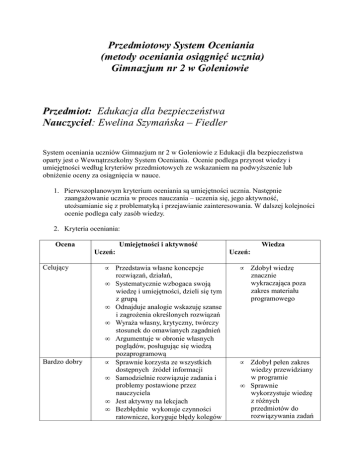 Przedmiotowy System Oceniania (metody oceniania osiągnięć ucznia) Gimnazjum nr 2 w Goleniowie Przedmiot: Edukacja dla bezpieczeństwa Nauczyciel: Ewelina Szymańska – Fiedler System oceniania uczniów Gimnazjum nr 2 w Goleniowie z Edukacji dla bezpieczeństwa oparty jest o Wewnątrzszkolny System Oceniania. Ocenie podlega przyrost wiedzy i umiejętności według kryteriów przedmiotowych ze wskazaniem na podwyższenie lub obniżenie oceny za osiągnięcia w nauce. 1. Pierwszoplanowym kryterium oceniania są umiejętności ucznia. Następnie zaangażowanie ucznia w proces nauczania – uczenia się, jego aktywność, utożsamianie się z problematyką i przejawianie zainteresowania. W dalszej kolejności ocenie podlega cały zasób wiedzy. 2. Kryteria oceniania: Ocena Umiejętności i aktywność Uczeń: Celujący Bardzo dobry • Przedstawia własne koncepcje rozwiązań, działań, • Systematycznie wzbogaca swoją wiedzę i umiejętności, dzieli się tym z grupą • Odnajduje analogie wskazuję szanse i zagrożenia określonych rozwiązań • Wyraża własny, krytyczny, twórczy stosunek do omawianych zagadnień • Argumentuje w obronie własnych poglądów, posługując się wiedzą pozaprogramową • Sprawnie korzysta ze wszystkich dostępnych źródeł informacji • Samodzielnie rozwiązuje zadania i problemy postawione przez nauczyciela • Jest aktywny na lekcjach • Bezbłędnie wykonuje czynności ratownicze, koryguje błędy kolegów Wiedza Uczeń: • Zdobył wiedzę znacznie wykraczająca poza zakres materiału programowego • Zdobył pełen zakres wiedzy przewidziany w programie • Sprawnie wykorzystuje wiedzę z różnych przedmiotów do rozwiązywania zadań Dobry Dostateczny • Odpowiednio wykorzystuje sprzęt i środki ratownicze • Sprawnie wyszukuje w różnych źródłach informacje o sposobach alternatywnego działania • Samodzielnie korzysta ze wskazanych źródeł informacji • Poprawnie rozumuje w kategoriach przyczynowo – skutkowych • Samodzielnie wykonuje typowe zadania o niewielkim stopniu złożoności • Podejmuje wybrane zadania dodatkowe • Jest aktywny w czasie lekcji • Poprawnie wykonuje czynności ratownicze, umie dobrać potrzebny sprzęt • Pod kierunkiem nauczyciela wykorzystuje podstawowe źródła informacji • Samodzielnie wykonuje proste zadania w trakcie zajęć • Przejawia przeciętną aktywność Dopuszczający • Przy pomocy nauczyciela wykonuje proste polecenia, wykorzystując podstawowe umiejętności Niedostateczny • Nie potrafi wykonać prostych poleceń, wymagających zastosowania podstawowych umiejętności z edukacji dla bezpieczeństwa • Opanował materiał programowy w stopniu zadowalającym • Opanował podstawowe elementy programu, pozwalające na podjęcie w otoczeniu działań ratowniczych i zabezpieczających • Wykazuje braki w wiedzy, nie uniemożliwiają one jednak dalszej edukacji i mogą zostać usunięte • Wykazuje braki w wiedzy, które uniemożliwiają dalszy rozwój w ramach przedmiotu Monitorowanie wiedzy może odbywać się poprzez: • • • • • odpowiedź ustną (bez ograniczeń) zawierającą określone umiejętności uwzględnione w wymaganiach na poszczególną ocenę; Trzy ostatnie lekcje. kartkówki (bez ograniczeń) zawierającą określone umiejętności uwzględnione w wymaganiach na poszczególną ocenę; Trzy ostatnie lekcje. sprawdziany (1 – 2 na semestr) obejmujące większa partię materiału (np.4 –5 tematów); zapowiedziane na 1 tydzień wcześniej. prace klasowe (1 na semestr) obejmujące (np. cały rozdział); zapowiedziane dwa tygodnie wcześniej i obejmujące powtórzenie materiału. prace domowe (bez ograniczeń). Prace klasowe oraz sprawdziany zakończone niepowodzeniem (ocena niedostateczna) powinny zostać poprawione w terminie dwóch tygodni. Kartkówki, odpowiedź ustna oraz prace domowe nie podlegają poprawie (wyjątkiem może być długotrwała nieobecność ucznia spowodowana np. chorobą) . Uczeń ma prawo do zgłoszenia jednego nieprzygotowania do odpowiedzi ustnej oraz jednego nieprzygotowania z pracy domowej w trakcie semestru bez uzasadnienia. • Przy stopniach cząstkowych dopuszcza się używanie znaków „plus” i „minus”, pozwalających dokładnie określić poziom opanowania przez ucznia wiadomości i umiejętności. • Uzyskane stopnie w poszczególnych formach aktywności ucznia stanowią podstawę stopnia śródrocznego i rocznego. • Uczeń jest klasyfikowany z przedmiotu jeżeli posiada 50% obecności na lekcjach. • Ocenę śródroczną, roczną ustala się na podstawie co najmniej trzech ocen cząstkowych ( jeżeli przedmiot jest raz w tygodniu) Stopnie mają różne wagi. Ocena śródroczna i roczna nie jest średnią ocen cząstkowych. Przy ustalaniu oceny śródrocznej i rocznej nauczyciel bierze pod uwagę stopnie ucznia z poszczególnych form działalności ucznia w następującej kolejności : • Prace klasowe, sprawdziany - (największy wpływ na kształt oceny śródrocznej i rocznej). • • • • • kartkówki, odpowiedź ustna, prace domowe. aktywność na lekcji. praca w grupie Kryteria procentowe na poszczególne oceny zgodne z Wewnątrzszkolnym Systemem Oceniania: a) dla ucznia zdolnego: - 40-50% - ocena dopuszczająca 51-66% - ocena dostateczna 67-82% - ocena dobra 83-99% - ocena bardzo dobra 100% i więcej – ocena celująca b) dla ucznia mniej zdolnego - 30-45% - ocena dopuszczająca 46-60% - ocena dostateczna 61-75% - ocena dobra 76-90% - ocena bardzo dobra 91-100% i powyżej – ocena celująca