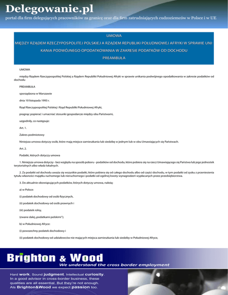 Delegowanie.pl portal dla firm delegujących pracowników za granicę oraz dla firm zatrudniających cudzoziemców w Polsce i w UE UMOWA między Rządem Rzeczypospolitej Polskiej a Rządem Republiki Południowej Afryki w sprawie unikania podwójnego opodatkowania w zakresie podatków od dochodu PREAMBUŁA UMOWA między Rządem Rzeczypospolitej Polskiej a Rządem Republiki Południowej Afryki w sprawie unikania podwójnego opodatkowania w zakresie podatków od dochodu PREAMBUŁA sporządzona w Warszawie dnia 10 listopada 1993 r. Rząd Rzeczypospolitej Polskiej i Rząd Republiki Południowej Afryki, pragnąc popierać i umacniać stosunki gospodarcze między obu Państwami, uzgodniły, co następuje: Art. 1. Zakres podmiotowy Niniejsza umowa dotyczy osób, które mają miejsce zamieszkania lub siedzibę w jednym lub w obu Umawiających się Państwach. Art. 2. Podatki, których dotyczy umowa 1. Niniejsza umowa dotyczy - bez względu na sposób poboru - podatków od dochodu, które pobiera się na rzecz Umawiającego się Państwa lub jego jednostek terytorialnych albo władz lokalnych. 2. Za podatki od dochodu uważa się wszystkie podatki, które pobiera się od całego dochodu albo od części dochodu, w tym podatki od zysku z przeniesienia tytułu własności majątku ruchomego lub nieruchomego i podatki od ogólnej kwoty wynagrodzeń wypłacanych przez przedsiębiorstwa. 3. Do aktualnie obowiązujących podatków, których dotyczy umowa, należą: a) w Polsce: (i) podatek dochodowy od osób fizycznych, (ii) podatek dochodowy od osób prawnych i (iii) podatek rolny, (zwane dalej „podatkami polskimi”); b) w Południowej Afryce: (i) powszechny podatek dochodowy i (ii) podatek dochodowy od udziałowców nie mających miejsca zamieszkania lub siedziby w Południowej Afryce, Hard work. Sound judgment. Intellectual curiosity. In a good advisor in cross-border business, these qualities are all essential. But they’re not enough. Als Brighton&Wood we expect passion too. Delegowanie.pl portal dla firm delegujących pracowników za granicę oraz dla firm zatrudniających cudzoziemców w Polsce i w UE (zwane dalej „podatkami południowoafrykańskimi”). 4. Niniejsza umowa będzie miała także zastosowanie do wszystkich podatków takiego samego lub zasadniczo podobnego rodzaju, które po podpisaniu niniejszej umowy będą wprowadzone przez każde z Umawiających się Państw obok lub zamiast istniejących podatków. Właściwe władze Umawiających się Państw będą informowały się wzajemnie o wszelkich zasadniczych zmianach, jakie zaszły w ich ustawodawstwach podatkowych. Art. 3. Ogólne definicje 1. W rozumieniu niniejszej umowy: a) określenie „Polska”, użyte w sensie geograficznym, oznacza terytorium Rzeczypospolitej Polskiej, w tym każdy obszar poza jej morzem terytorialnym, na którym Polska może, na podstawie jej prawa wewnętrznego i zgodnie z prawem międzynarodowym, sprawować suwerenne prawa w odniesieniu do dna morskiego, jego podglebia oraz ich zasobów naturalnych; b) określenie „Południowa Afryka” oznacza Republikę Południowej Afryki, a użyte w sensie geograficznym obejmuje jej morze terytorialne, jak również każdy obszar poza morzem terytorialnym, który został określony lub może zostać określony w przyszłości na mocy ustawodawstwa Południowej Afryki jako obszar, nad którym Południowa Afryka może wykonywać suwerenne prawa lub jurysdykcję; c) określenia „Umawiające się Państwo” i „drugie Umawiające się Państwo” oznaczają, w zależności od kontekstu, Polskę lub Południową Afrykę; d) określenie „obywatel” oznacza wszystkie osoby fizyczne posiadające obywatelstwo Umawiającego się Państwa oraz wszelkie osoby prawne, spółki osobowe, stowarzyszenia i inne jednostki utworzone na podstawie obowiązującego prawa w Umawiającym się Państwie; e) określenie „osoba” obejmuje osobę fizyczną, spółkę oraz każde inne zrzeszenie osób traktowane jako podmiot dla celów podatkowych; f) określenie „przedsiębiorstwo Umawiającego się Państwa” i „przedsiębiorstwo drugiego Umawiającego się Państwa” oznaczają odpowiednio przedsiębiorstwo prowadzone przez osobę mającą miejsce zamieszkania lub siedzibę w jednym Umawiającym się Państwie i przedsiębiorstwo prowadzone przez osobę mającą miejsce zamieszkania lub siedzibę w drugim Umawiającym się Państwie; g) określenie „spółka” oznacza osobę prawną lub jakąkolwiek inną jednostkę, którą dla celów podatkowych traktuje się jako osobę prawną; h) określenie „transport międzynarodowy” oznacza wszelki transport statkiem morskim lub statkiem powietrznym eksploatowanym przez przedsiębiorstwo, którego miejsce faktycznego zarządu znajduje się w Umawiającym się Państwie, z wyjątkiem przypadku, gdy statek morski lub statek powietrzny jest eksploatowany wyłącznie między miejscami położonymi w drugim Umawiającym się Państwie; i) określenie „właściwa władza” oznacza: (i) w przypadku Polski - Ministra Finansów lub jego upoważnionego przedstawiciela; (ii) w przypadku Południowej Afryki - Komisarza Dochodów Krajowych lub jego upoważnionego przedstawiciela. 2. Przy stosowaniu niniejszej umowy przez Umawiające się Państwo, jeżeli z kontekstu nie wynika inaczej, każde określenie nie zdefiniowane w niniejszym artykule będzie miało takie znaczenie, jakie przyjmuje się według prawa tego Państwa w zakresie podatków, do których stosuje się niniejszą umowę. Znaczenie określenia wynikające z ustawodawstwa podatkowego danego Państwa będzie miało pierwszeństwo przed znaczeniem nadanym takiemu określeniu w innych dziedzinach prawa tego Państwa. Art. 4. Miejsce zamieszkania lub siedziba 1. W rozumieniu niniejszej umowy: a) określenie „osoba mająca miejsce zamieszkania lub siedzibę w Polsce” oznacza osobę, która zgodnie z ustawodawstwem Polski podlega w niej opodatkowaniu z uwagi na miejsc