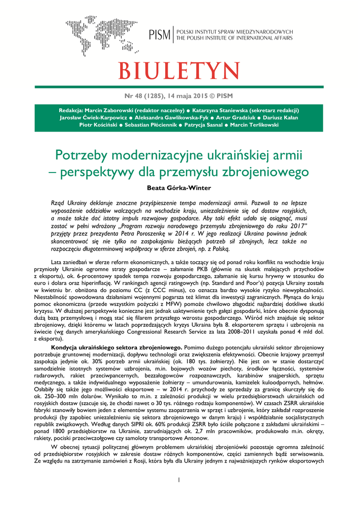 Nr 48 (1285), 14 maja 2015 © PISM .. . . . . Redakcja: Marcin Zaborowski (redaktor naczelny) Katarzyna Staniewska (sekretarz redakcji) Jarosław Ćwiek-Karpowicz Aleksandra Gawlikowska-Fyk Artur Gradziuk Dariusz Kałan Piotr Kościński Sebastian Płóciennik Patrycja Sasnal Marcin Terlikowski . Potrzeby modernizacyjne ukraińskiej armii – perspektywy dla przemysłu zbrojeniowego Beata Górka-Winter Rząd Ukrainy deklaruje znaczne przyśpieszenie tempa modernizacji armii. Pozwoli to na lepsze wyposażenie oddziałów walczących na wschodzie kraju, uniezależnienie się od dostaw rosyjskich, a może także dać istotny impuls rozwojowy gospodarce. Aby taki efekt udało się osiągnąć, musi zostać w pełni wdrożony „Program rozwoju narodowego przemysłu zbrojeniowego do roku 2017” przyjęty przez prezydenta Petra Poroszenkę w 2014 r. W jego realizacji Ukraina powinna jednak skoncentrować się nie tylko na zaspokajaniu bieżących potrzeb sił zbrojnych, lecz także na rozpoczęciu długoterminowej współpracy w sferze zbrojeń, np. z Polską. Lata zaniedbań w sferze reform ekonomicznych, a także toczący się od ponad roku konflikt na wschodzie kraju przyniosły Ukrainie ogromne straty gospodarcze – załamanie PKB (głównie na skutek malejących przychodów z eksportu), ok. 6-procentowy spadek tempa rozwoju gospodarczego, załamanie się kursu hrywny w stosunku do euro i dolara oraz hiperinflację. W rankingach agencji ratingowych (np. Standard and Poor’s) pozycja Ukrainy została w kwietniu br. obniżona do poziomu CC (z CCC minus), co oznacza bardzo wysokie ryzyko niewypłacalności. Niestabilność spowodowana działaniami wojennymi pogarsza też klimat dla inwestycji zagranicznych. Płynąca do kraju pomoc ekonomiczna (przede wszystkim pożyczki z MFW) pomoże chwilowo złagodzić najbardziej dotkliwe skutki kryzysu. W dłuższej perspektywie konieczne jest jednak uaktywnienie tych gałęzi gospodarki, które obecnie dysponują dużą bazą przemysłową i mogą stać się filarem przyszłego wzrostu gospodarczego. Wśród nich znajduje się sektor zbrojeniowy, dzięki któremu w latach poprzedzających kryzys Ukraina była 8. eksporterem sprzętu i uzbrojenia na świecie (wg danych amerykańskiego Congressional Research Service za lata 2008–2011 uzyskała ponad 4 mld dol. z eksportu). Kondycja ukraińskiego sektora zbrojeniowego. Pomimo dużego potencjału ukraiński sektor zbrojeniowy potrzebuje gruntownej modernizacji, dopływu technologii oraz zwiększenia efektywności. Obecnie krajowy przemysł zaspokaja jedynie ok. 30% potrzeb armii ukraińskiej (ok. 180 tys. żołnierzy). Nie jest on w stanie dostarczyć samodzielnie istotnych systemów uzbrojenia, m.in. bojowych wozów piechoty, środków łączności, systemów radarowych, rakiet przeciwpancernych, bezzałogowców rozpoznawczych, karabinów snajperskich, sprzętu medycznego, a także indywidualnego wyposażenie żołnierzy – umundurowania, kamizelek kuloodpornych, hełmów. Osłabiły się także jego możliwości eksportowe – w 2014 r. przychody ze sprzedaży za granicę skurczyły się do ok. 250–300 mln dolarów. Wynikało to m.in. z zależności produkcji w wielu przedsiębiorstwach ukraińskich od rosyjskich dostaw (szacuje się, że chodzi nawet o 30 tys. różnego rodzaju komponentów). W czasach ZSRR ukraińskie fabryki stanowiły bowiem jeden z elementów systemu zaopatrzenia w sprzęt i uzbrojenie, który zakładał rozproszenie produkcji (by zapobiec uniezależnieniu się sektora zbrojeniowego w danym kraju) i współdziałanie socjalistycznych republik związkowych. Według danych SIPRI ok. 60% produkcji ZSRR było ściśle połączone z zakładami ukraińskimi – ponad 1800 przedsiębiorstw na Ukrainie, zatrudniających ok. 2,7 mln pracowników, produkowało m.in. okręty, rakiety, pociski przeciwczołgowe czy samoloty transportowe Antonow. W obecnej sytuacji politycznej głównym problemem ukraińskiej zbrojeniówki pozostaje ogromna zależność od przedsiębiorstw rosyjskich w zakresie dostaw różnych komponentów, części zamiennych bądź serwisowania. Ze względu na zatrzymanie zamówień z Rosji, która była dla Ukrainy jednym z najważniejszych rynków eksportowych 1 (np. w sektorze kosmicznym, który w 2014 r. zanotował ponad 30-procentowy spadek dochodów i był zmuszony zawiesić niektóre programy), wiele z nich znacząco ograniczyło swoją działalność. Trend spadkowy (szacuje się, że ok. 40% zakładów jest uzależnionych od importu – głównie w przemyśle rakietowym, lotniczym, silników itp.) pogłębi się wobec ubiegłorocznej decyzji rządu ukraińskiego o ostatecznym zakończeniu współpracy z FR w sektorze zbrojeń. Według różnych szacunków oznaczało to stratę ok. 3,3 mld hrywien. Ukraina eksportowała m.in. części i komponenty elektroniki wojskowej, w tym instrumenty pokładowe, różne typy urządzeń elektronicznych i radioelektronicznych. Importowano natomiast turbinowe zespoły napędowe dla okrętów, silniki lotnicze i ich komponenty, części rakiet samosterujących, komponenty radarów obrony przeciwlotniczej, silniki lotnicze i ich komponenty, części do pocisków, radary obrony przeciwlotniczej itp. Konflikt na Ukrainie wpłynął również negatywnie na jej pozostałe zobowiązania eksportowe, podjęte w latach 2008–2013. Uzbrojenie przeznaczone na eksport zdecydowano się skierować na wyposażenie ukraińskiej armii (nie dostarczono np. czołgów T-64 BV1 do Demokratycznej Republiki Konga czy transporterów opancerzonych do Tajlandii). Ze względu na aneksję Krymu i zajęcie majątku tamtejszego zakładu przez Rosję Ukraina nie ma np. możliwości zrealizowania zamówienia na poduszkowce desantowe dla Chin (transakcję przejął rosyjski Rosoboroneksport). Próby reform. Pomimo tych trudności rząd ukraiński przyjął wiele rozwiązań, które w ciągu najbliższych miesięcy mają przyczynić się do lepszego zaspokojen