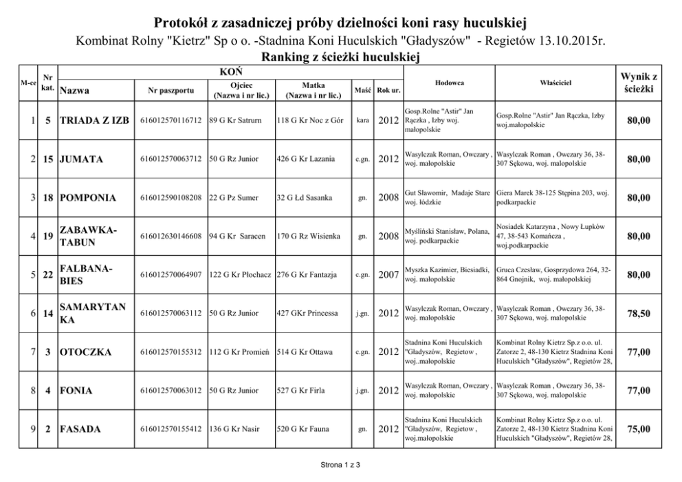 Protokół z zasadniczej próby dzielności koni rasy huculskiej Kombinat Rolny "Kietrz" Sp o o. -Stadnina Koni Huculskich "Gładyszów" - Regietów 13.10.2015r. Ranking z ścieżki huculskiej M-ce Nr kat. KOŃ Nazwa Nr paszportu Ojciec (Nazwa i nr lic.) Matka (Nazwa i nr lic.) Hodowca Właściciel Maść Rok ur. Wynik z ścieżki 1 5 TRIADA Z IZB 616012570116712 89 G Kr Satrurn 118 G Kr Noc z Gór kara 2012 Gosp.Rolne "Astir" Jan Rączka , Izby woj. małopolskie Gosp.Rolne "Astir" Jan Rączka, Izby woj.małopolskie 80,00 2 15 JUMATA 616012570063712 50 G Rz Junior 426 G Kr Lazania c.gn. 2012 Wasylczak Roman, Owczary , Wasylczak Roman , Owczary 36, 38woj. małopolskie 307 Sękowa, woj. malopolskie 80,00 3 18 POMPONIA 616012590108208 22 G Pz Sumer 32 G Łd Sasanka gn. 2008 Gut Sławomir, Madaje Stare Giera Marek 38-125 Stępina 203, woj. woj. łódzkie podkarpackie 80,00 170 G Rz Wisienka gn. 2008 Nosiadek Katarzyna , Nowy Łupków Myśliński Stanisław, Polana, 47, 38-543 Komańcza , woj. podkarpackie woj.podkarpackie 80,00 4 19 ZABAWKATABUN 616012630146608 94 G Kr Saracen 5 22 FALBANABIES 616012570064907 122 G Kr Płochacz 276 G Kr Fantazja c.gn. 2007 Myszka Kazimier, Biesiadki, Gruca Czesław, Gosprzydowa 264, 32woj. małopolskie 864 Gnojnik, woj. małopolskiej 80,00 6 14 SAMARYTAN KA 616012570063112 50 G Rz Junior j.gn. 2012 Wasylczak Roman, Owczary , Wasylczak Roman , Owczary 36, 38woj. małopolskie 307 Sękowa, woj. malopolskie 78,50 77,00 427 GKr Princessa 7 3 OTOCZKA 616012570155312 112 G Kr Promień 514 G Kr Ottawa c.gn. 2012 Stadnina Koni Huculskich "Gładyszów, Regietow , woj..małopolskie 8 4 FONIA 616012570063012 50 G Rz Junior 527 G Kr Firla j.gn. 2012 Wasylczak Roman, Owczary , Wasylczak Roman , Owczary 36, 38woj. małopolskie 307 Sękowa, woj. malopolskie 77,00 9 2 FASADA 616012570155412 136 G Kr Nasir 520 G Kr Fauna gn. 2012 Stadnina Koni Huculskich "Gładyszów, Regietow , woj.małopolskie 75,00 Strona 1 z 3 Kombinat Rolny Kietrz Sp.z o.o. ul. Zatorze 2, 48-130 Kietrz Stadnina Koni Huculskich "Gładyszów", Regietów 28, Kombinat Rolny Kietrz Sp.z o.o. ul. Zatorze 2, 48-130 Kietrz Stadnina Koni Huculskich "Gładyszów", Regietów 28, M-ce Nr kat. KOŃ Nazwa Nr paszportu Ojciec (Nazwa i nr lic.) Matka (Nazwa i nr lic.) Hodowca Właściciel Wynik z ścieżki Kombinat Rolny Kietrz Sp.z o.o. ul. Zatorze 2, 48-130 Kietrz Stadnina Koni Huculskich "Gładyszów" 75,00 Maść Rok ur. 10 6 GROBLA 616012570002512 2187 Ousor VIII-50 553 G Kr Geneza gn 2012 Stadnina Koni Huculskich "Gładyszów, Regietow , woj.małopolskie 11 8 LUTRA 616012570063912 50 G Rz Junior 448 G Kr Loteria gn. 2012 Wasylczak Roman, Owczary , Wasylczak Roman , Owczary 36, 38woj. małopolskie 307 Sękowa, woj. malopolskie 75,00 12 9 PRYMKA 616012570002712 136 G Kr Nasir 225 G Kr Pokora karosr . 2012 Stadnina Koni Huculskich "Gładyszów, Regietow , woj.małopolskie 75,00 13 17 JARA 616012570090511 50 G Rz Junior 428 G Kr Lolita gn. 2011 Wasylczak Roman, Owczary , Wasylczak Roman , Owczary 36, 38woj. małopolskie 307 Sękowa, woj. malopolskie 75,00 14 23 WARNA 616012580655607 2186 Prislop IX-81 22 G Lb Wróżka kara 2007 Wrona Zygmunt, Lublin, woj. lubelskie Giera Marek, 38-125 Stępina 203, woj. podkarpackie 75,00 15 25 JARINA Z IZB 616012570127406 20 G Kr Okoń 173 G Kr Imitacja sk.gn. 2006 Gosp.Rolne "Astir" Jan Rączka , Izby woj. małopolskie Gosp.Rolne "Astir" Jan Rączka, Izby woj.małopolskie 75,00 16 26 LOTERIA 616012540079605 1807 Litmirz 46 G Rz Lusi gn. 2005 Góra Magdalena, Szczyrek woj. śląskie Wasylczak Roman , Owczary 36, 38307 Sękowa, woj. malopolskie 75,00 17 1 POKUSKA 616012570194612 659 G Kr Paryska gn. 2012 Gruca Czesław, Gosprzydowa Gruca Czesław, Gosprzydowa 264, 32woj. małopolskie 864 Gnojnik woj. małopolskiej 74,25 18 28 SONDA 616012540079805 1807 Litmirz 91 G Kt Szima c.gn. 2005 Góra Magdalena, Szczyrek woj. śląskie Wasylczak Roman , Owczary 36, 38307 Sękowa, woj. malopolskie 74,00 19 27 PRINCESSA 616012540079705 1807 Litmirz 24 G Kt S-Polonia gn. 2005 Góra Magdalena, Szczyrek woj. śląskie Wasylczak Roman , Owczary 36, 38307 Sękowa, woj. malopolskie 73,75 159 G Kr Owar Kur Strona 2 z 3 Kombinat Rolny Kietrz Sp.z o.o. ul. Zatorze 2, 48-130 Kietrz Stadnina Koni Huculskich "Gładyszów" M-ce Nr kat. KOŃ Nazwa Nr paszportu Ojciec (Nazwa i nr lic.) Matka (Nazwa i nr lic.) Hodowca Właściciel Wynik z ścieżki Maść Rok ur. 218 G Kr Intryga j.gn. 2012 Stadnina Koni Huculskich "Gładyszów, Regietow , woj.małopolskie Kombinat Rolny Kietrz Sp.z o.o. ul. Zatorze 2, 48-130 Kietrz Stadnina Koni Huculskich "Gładyszów" 72,00 616012570024008 40 G Rz Luksus 52 G Kr P-Jagna gn. 2008 Gosp.Rolne "Astir" Jan Rączka , Izby woj. małopolskie Gosp.Rolne "Astir" Jan Rączka, Izby woj.małopolskie 68,75 616012570064012 50 G Rz Junior 428 G Kr Lolita gn. 2012 Wasylczak Roman, Owczary , Wasylczak Roman , Owczary 36, 38woj. małopolskie 307 Sękowa, woj. malopolskie 67,00 gn. 2011 Gosp.Rolne "Astir" Jan Rączka , Izby woj. małopolskie Gosp.Rolne "Astir" Jan Rączka, Izby woj.małopolskie 65,50 20 10 J-IWETTA 616012570001312 21 21 PIRYDA Z IZB 22 12 JASNA 16 G Łd Hasan z Sadyby 23 16 SEKWOJA Z IZB 616012570113211 149 G Kr Limer 500 G Kr Serenada z Izb 24 20 SKIERKATABUN 616012630146208 94 G Kr Saracen 210 G Rz Smytnia gn.sr. 2008 Nosiadek Katarzyna , Nowy Łupków Myśliński Stanisław, Polana, 47, 38-543 Komańcza , woj. podkarpackie woj.podkarpackie 63,50 9640 Fraza c.mys z. 2012 Stadnina Koni Huculskich "Gładyszów, Regietow , woj.małopolskie 56,25 155 G Kr Czerchan Kombinat Rolny Kietrz Sp.z o.o. ul. Zatorze 2, 48-130 Kietrz Stadnina Koni Huculskich "Gładyszów" 25 7 FASOLKA 616012570003112 26 13 LUTRA 616012570063912 50 G Rz Junior 448 G Kr Loteria gn. 2012 Wasylczak Roman, Owczary , Wasylczak Roman , Owczary 36, 38woj. małopolskie 307 Sękowa, woj. malopolskie 56,00 27 24 OWARA 616012630256107 15 G Rz Hetman 199 G Rz Wierna II gn. 2007 Czach Andrzej, Rzeszów, woj. podkarpackie 
