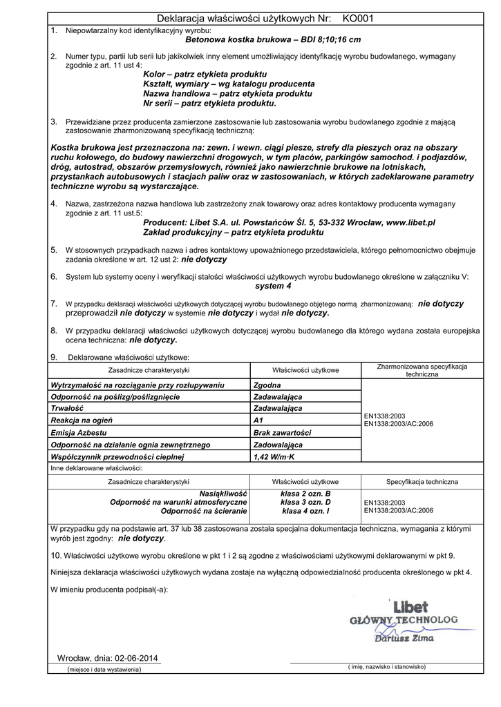 Deklaracja właściwości użytkowych Nr: KO001 1. Niepowtarzalny kod identyfikacyjny wyrobu: Betonowa kostka brukowa – BDI 8;10;16 cm Numer typu, partii lub serii lub jakikolwiek inny element umożliwiający identyfikację wyrobu budowlanego, wymagany zgodnie z art. 11 ust 4: 2. Kolor – patrz etykieta produktu Kształt, wymiary – wg katalogu producenta Nazwa handlowa – patrz etykieta produktu Nr serii – patrz etykieta produktu. 3. Przewidziane przez producenta zamierzone zastosowanie lub zastosowania wyrobu budowlanego zgodnie z mającą zastosowanie zharmonizowaną specyfikacją techniczną: Kostka brukowa jest przeznaczona na: zewn. i wewn. ciągi piesze, strefy dla pieszych oraz na obszary ruchu kołowego, do budowy nawierzchni drogowych, w tym placów, parkingów samochod. i podjazdów, dróg, autostrad, obszarów przemysłowych, również jako nawierzchnie brukowe na lotniskach, przystankach autobusowych i stacjach paliw oraz w zastosowaniach, w których zadeklarowane parametry techniczne wyrobu są wystarczające. 4. Nazwa, zastrzeżona nazwa handlowa lub zastrzeżony znak towarowy oraz adres kontaktowy producenta wymagany zgodnie z art. 11 ust.5: Producent: Libet S.A. ul. Powstańców Śl. 5, 53-332 Wrocław, www.libet.pl Zakład produkcyjny – patrz etykieta produktu 5. W stosownych przypadkach nazwa i adres kontaktowy upoważnionego przedstawiciela, którego pełnomocnictwo obejmuje zadania określone w art. 12 ust 2: nie dotyczy 6. System lub systemy oceny i weryfikacji stałości właściwości użytkowych wyrobu budowlanego określone w załączniku V: system 4 7. W przypadku deklaracji właściwości użytkowych dotyczącej wyrobu budowlanego objętego normą zharmonizowaną: nie dotyczy przeprowadził nie dotyczy w systemie nie dotyczy i wydał nie dotyczy. 8. W przypadku deklaracji właściwości użytkowych dotyczącej wyrobu budowlanego dla którego wydana została europejska ocena techniczna: nie dotyczy. 9. Deklarowane właściwości użytkowe: Właściwości użytkowe Zasadnicze charakterystyki Wytrzymałość na rozciąganie przy rozłupywaniu Zgodna Odporność na poślizg/poślizgnięcie Zadawalająca Trwałość Zadawalająca Reakcja na ogień A1 Emisja Azbestu Brak zawartości Odporność na działanie ognia zewnętrznego Zadowalająca Współczynnik przewodności cieplnej 1,42 W/m·K Zharmonizowana specyfikacja techniczna EN1338:2003 EN1338:2003/AC:2006 Inne deklarowane właściwości: Zasadnicze charakterystyki Nasiąkliwość Odporność na warunki atmosferyczne Odporność na ścieranie Właściwości użytkowe klasa 2 ozn. B klasa 3 ozn. D klasa 4 ozn. I Specyfikacja techniczna EN1338:2003 EN1338:2003/AC:2006 W przypadku gdy na podstawie art. 37 lub 38 zastosowana została specjalna dokumentacja techniczna, wymagania z którymi wyrób jest zgodny: nie dotyczy. 10. Właściwości użytkowe wyrobu określone w pkt 1 i 2 są zgodne z właściwościami użytkowymi deklarowanymi w pkt 9. Niniejsza deklaracja właściwości użytkowych wydana zostaje na wyłączną odpowiedzialność producenta określonego w pkt 4. W imieniu producenta podpisał(-a): Wrocław, dnia: 02-06-2014 (miejsce i data wystawienia) ( imię, nazwisko i stanowisko) Kopia informacji towarzyszącej oznakowaniu CE (przykładowa etykieta) Producent Kod identyfikacyjny wyrobu Nazwa handlowa, kolor Indeks wyrobu Nr serii ` Zakład produkcyjny Deklaracja właściwości użytkowych nr. KO001 dotyczy następujących wyrobów: Iberia 8 cm, Kostka 10 cm, Kostka 16 cm Przykrawężnikowa, Kostka 6 cm Akropol, Kostka 8 cm Fantazja-czapka biskupia, Kostka 8 cm Krakowska, Kostka 8 cm Merano, Kostka 8 cm Natulit, Kostka 8 cm Nostalit, Kostka 8 cm Piazza, Kostka 8 cm Piccola, Kostka 8 cm Podwójne T, Kostka 8 cm Prostokąt, Kostka 8 cm Quadro 10x10, Kostka 8 cm Quadro 10x20, Kostka 8 cm Quadro 10x30, Kostka 8 cm Quadro 20x20, Kostka 8 cm Quadro 20x30, Kostka 8 cm Quadro 30x30, Kostka 8 cm Romano, Kostka 8 cm Stone Road, Kostka 8 cm Vertigo, Natulit Massimo 8 cm, Płytka Chodnikowa 25X25X8 We wszystkich wariantach kolorystycznych i ew. obróbki dodatkowej, w wersjach z fazą, mikrofazą i bez fazy (wg katalogu producenta).